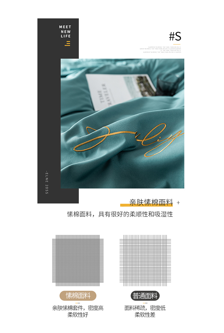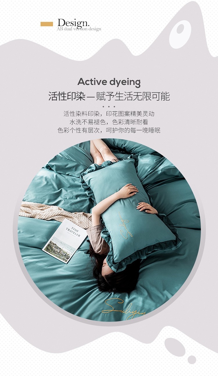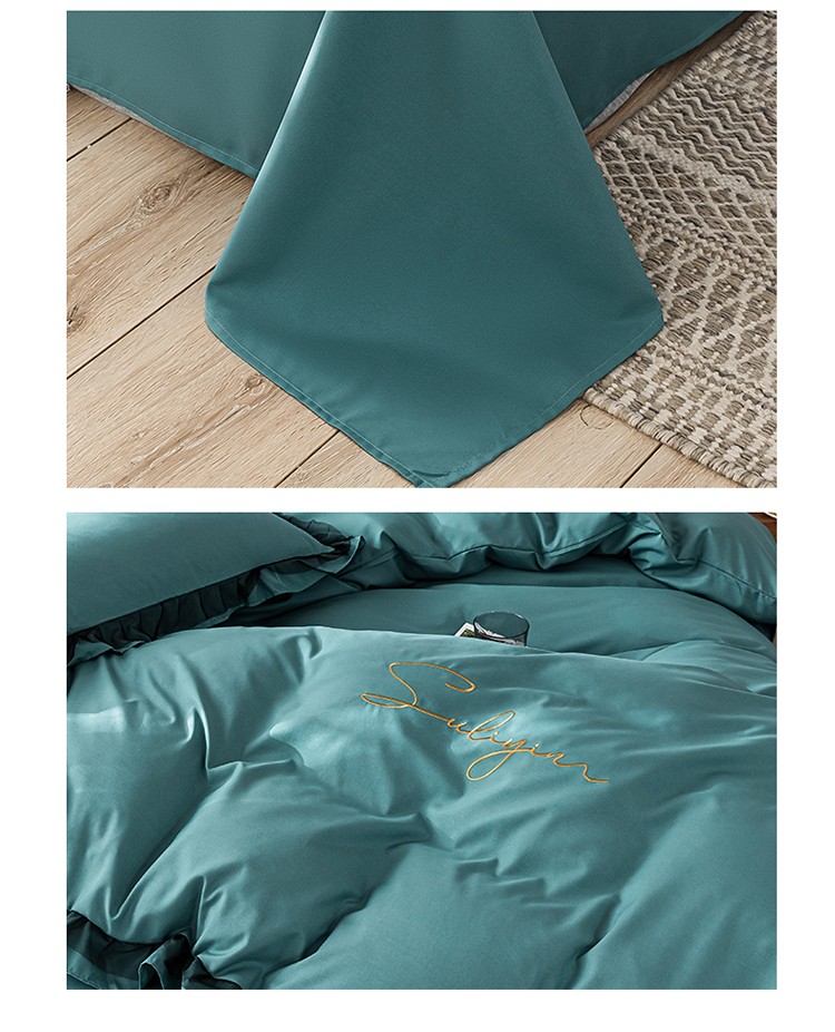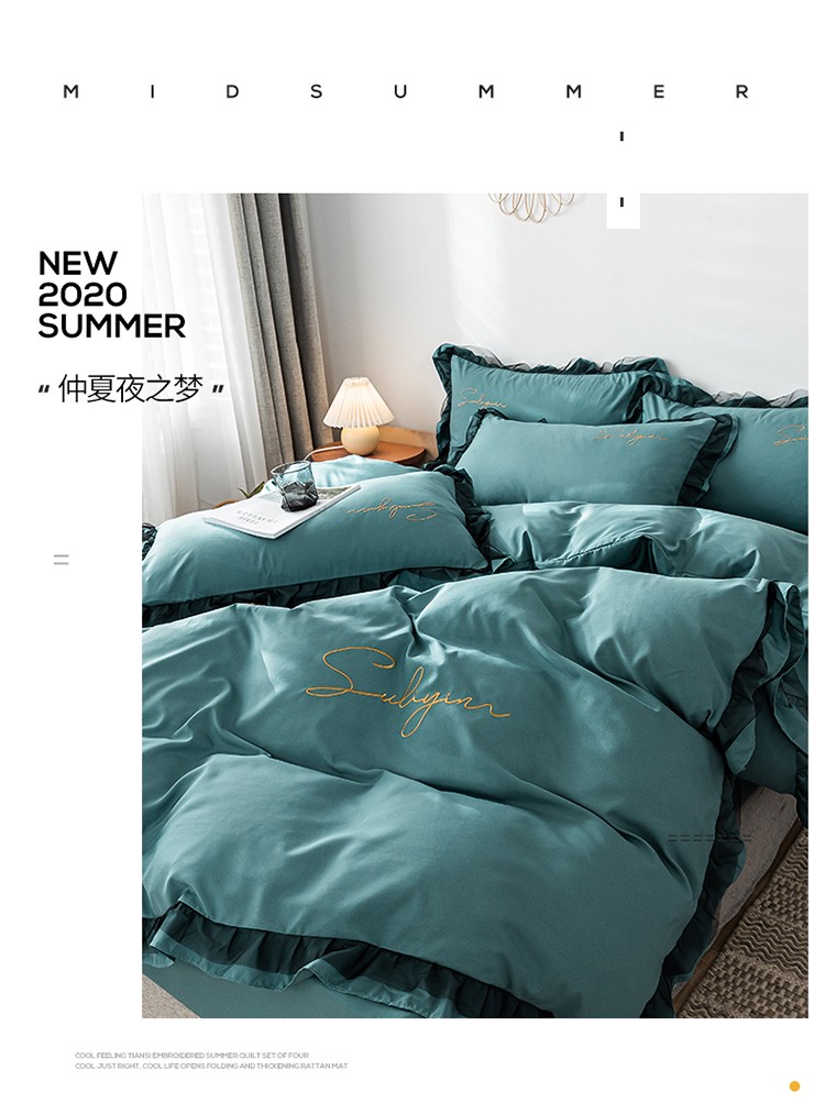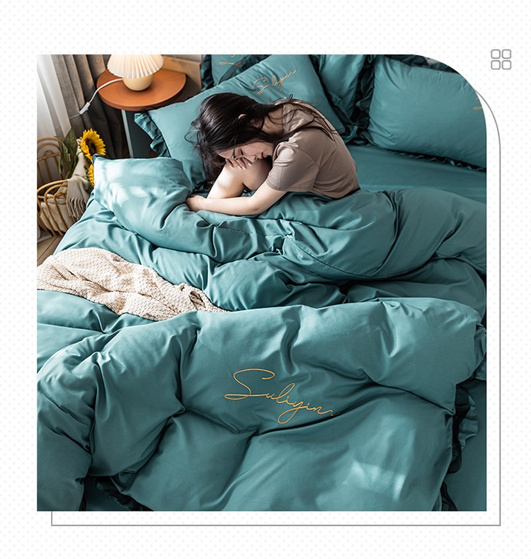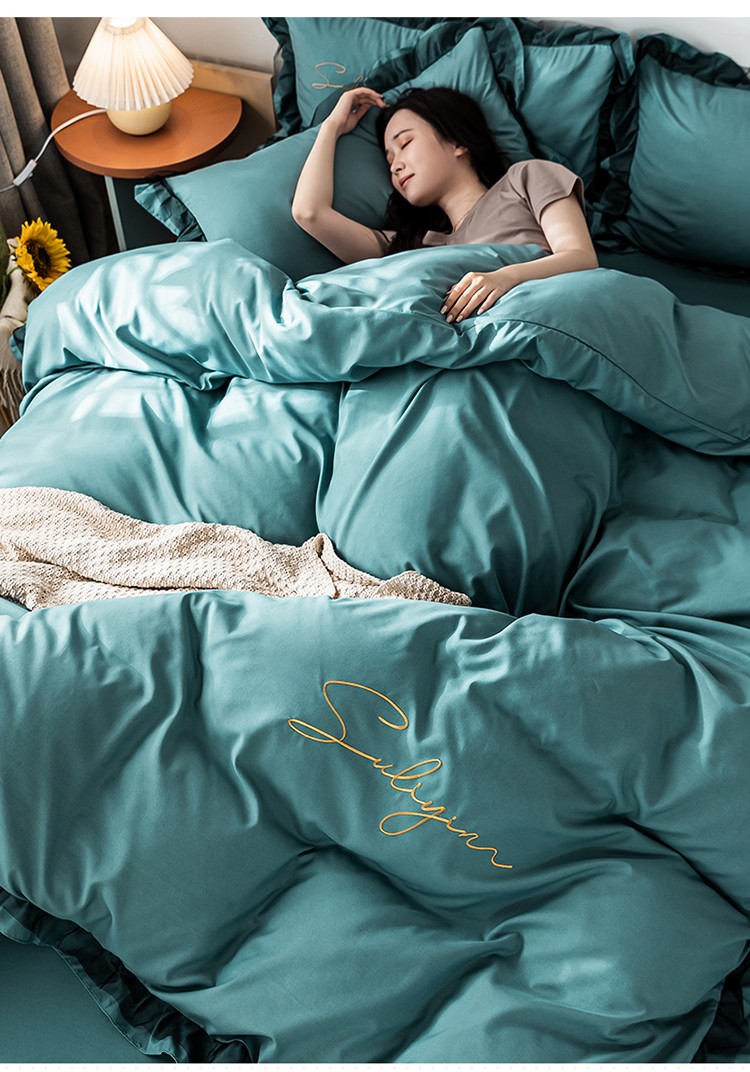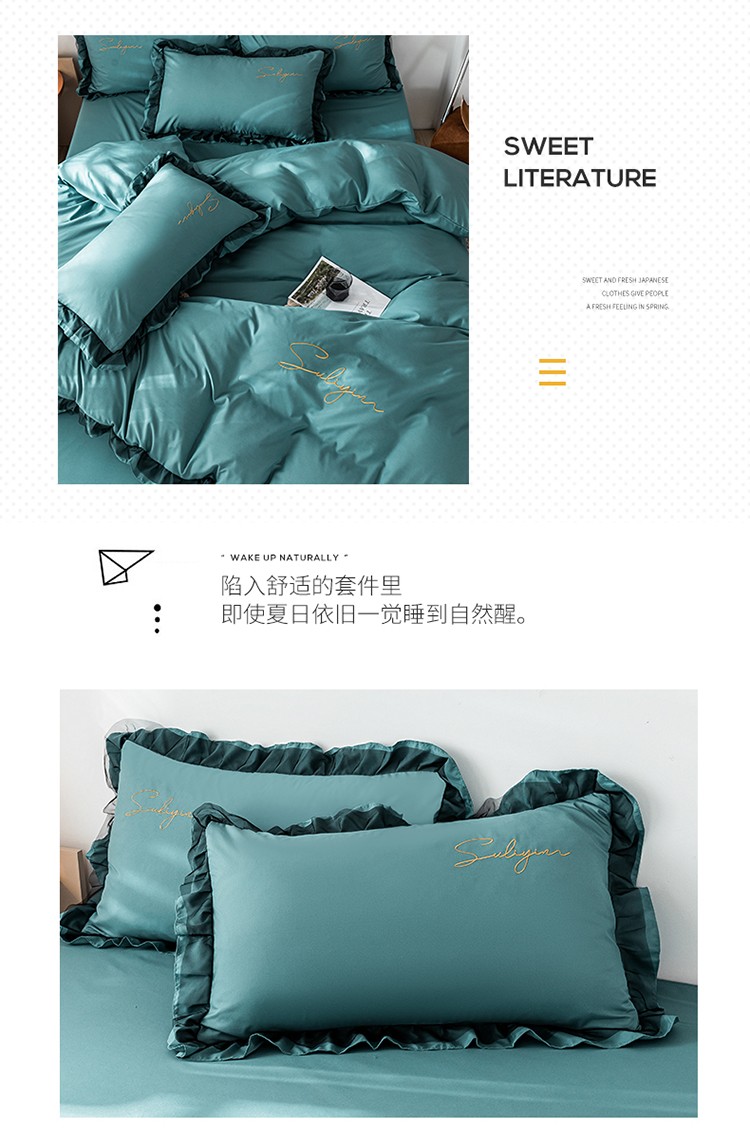 金麦家纺 2020新款愫棉刺绣蕾丝花边四件套 浅石蓝