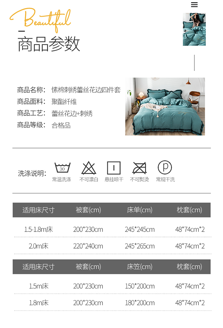 商品名称:金麦家纺 2020新款愫棉刺绣蕾丝花边四件套 浅石蓝