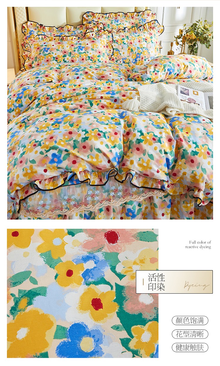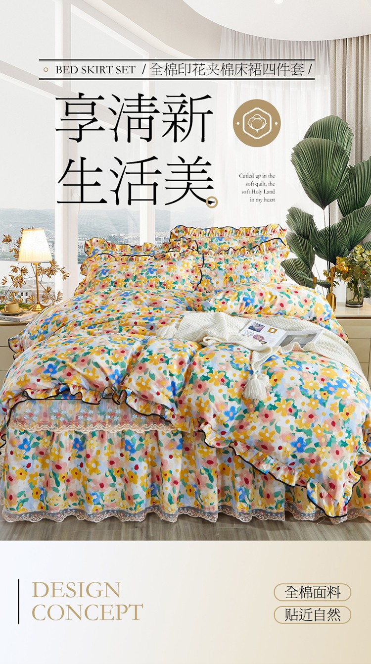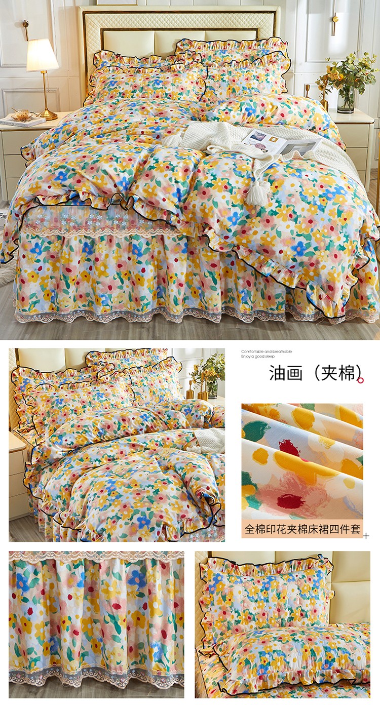 当前位置: 91家纺网 > 商品网购 > 床品套件 > 四件套 > 全棉普通四件套 > 宜凡 2021新款全棉印花夹棉床裙-床裙四件套 油画