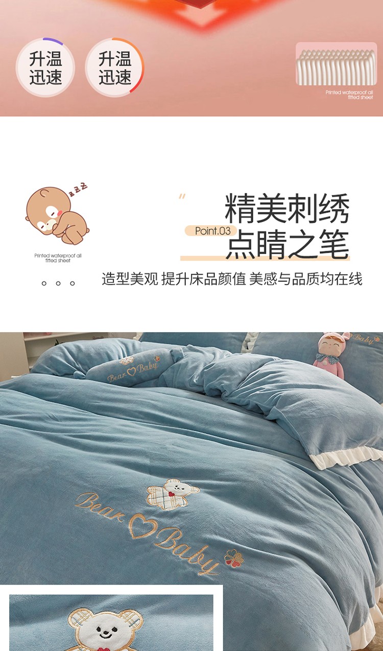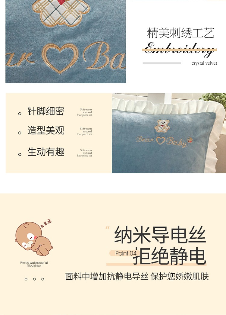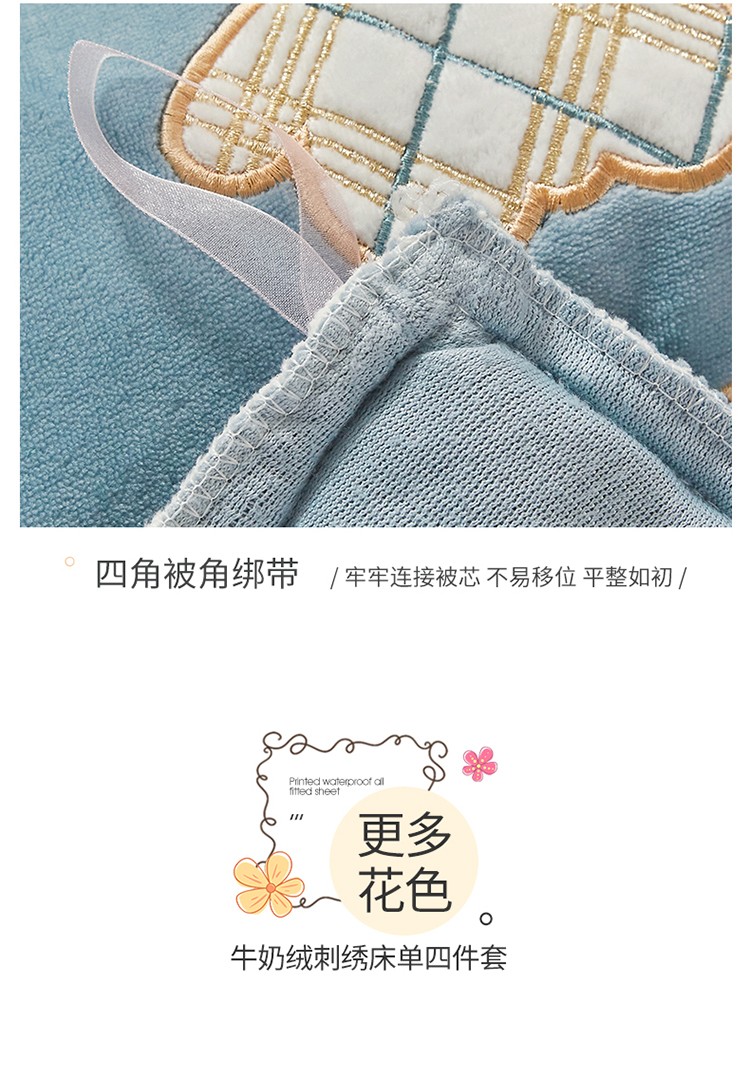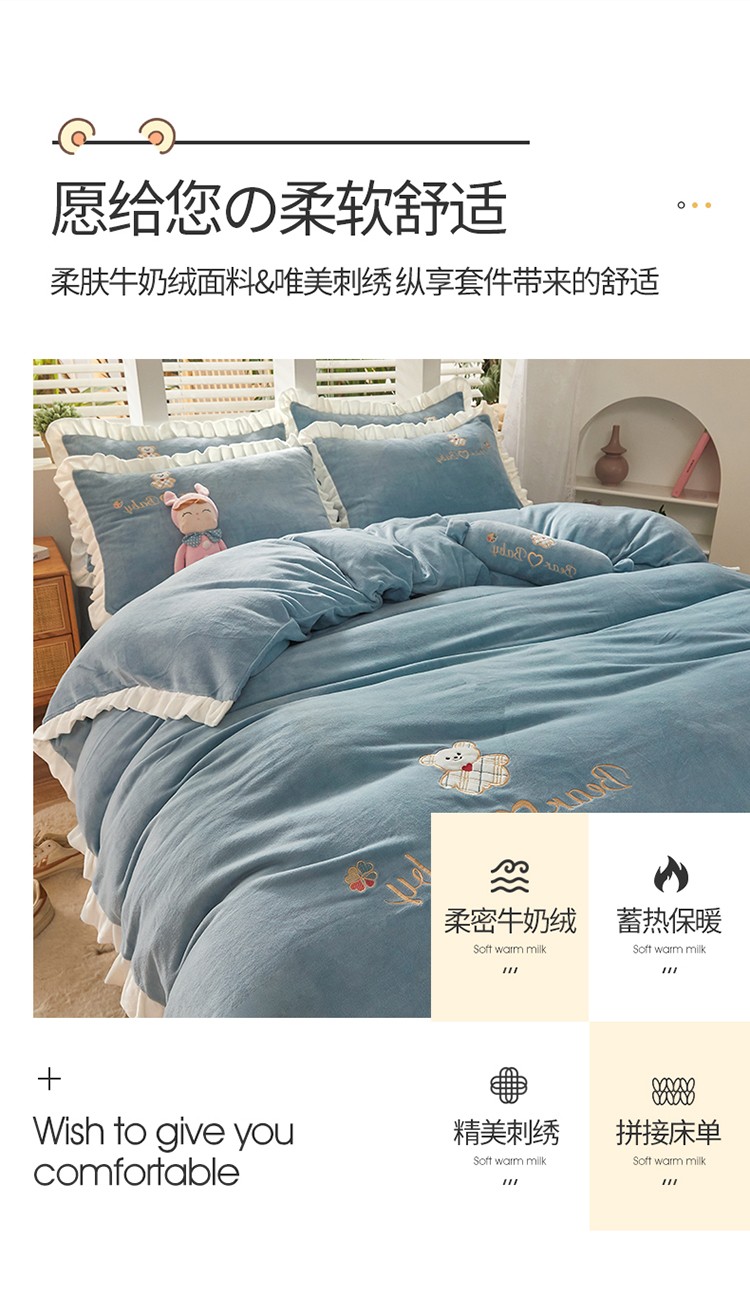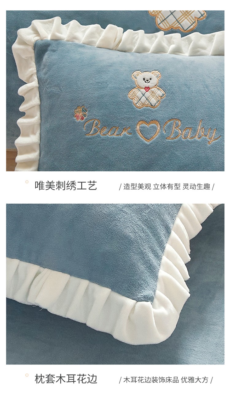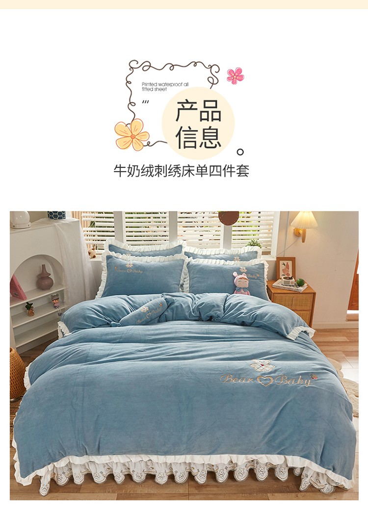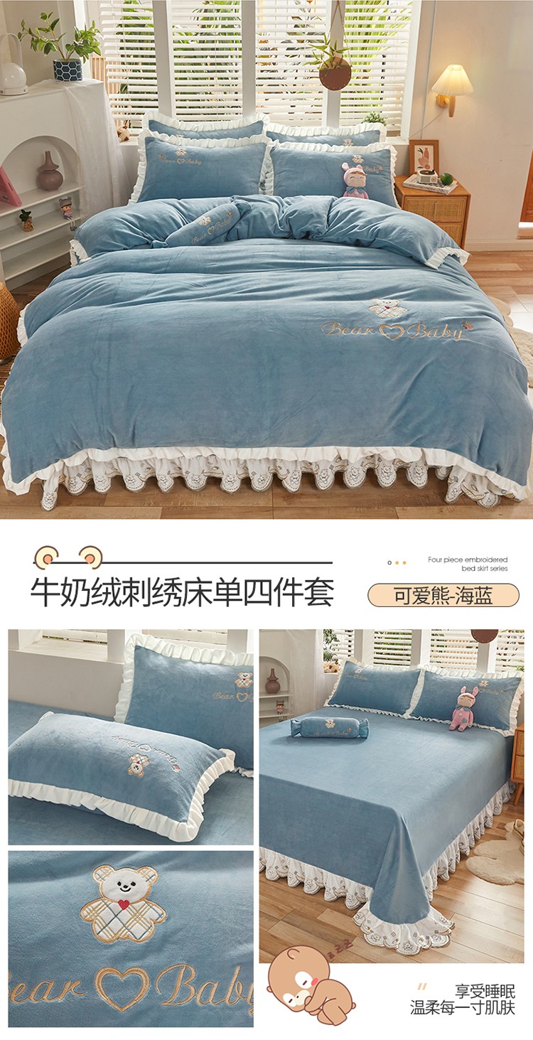 商品名称:宜凡家纺 2021新款牛奶绒绣花熊床单四件套 可爱熊-海蓝