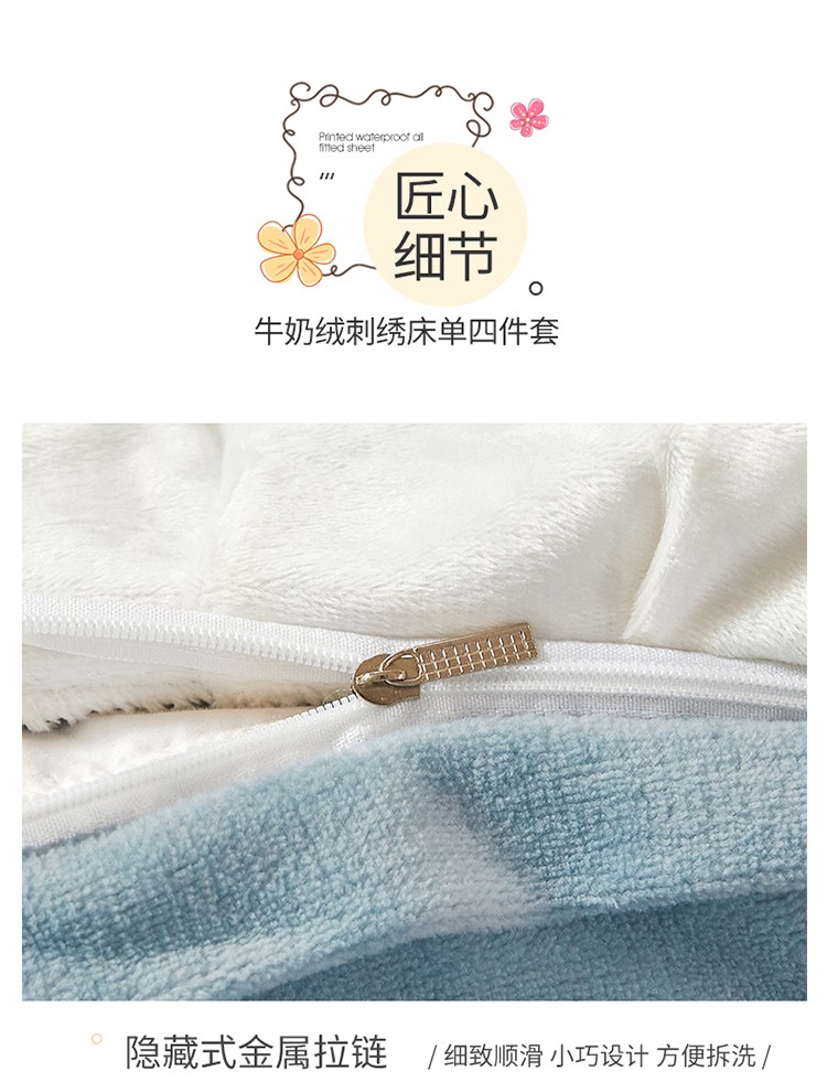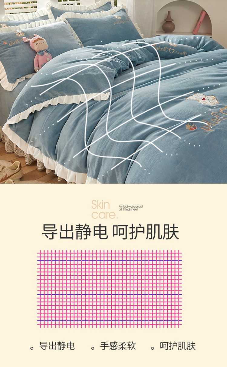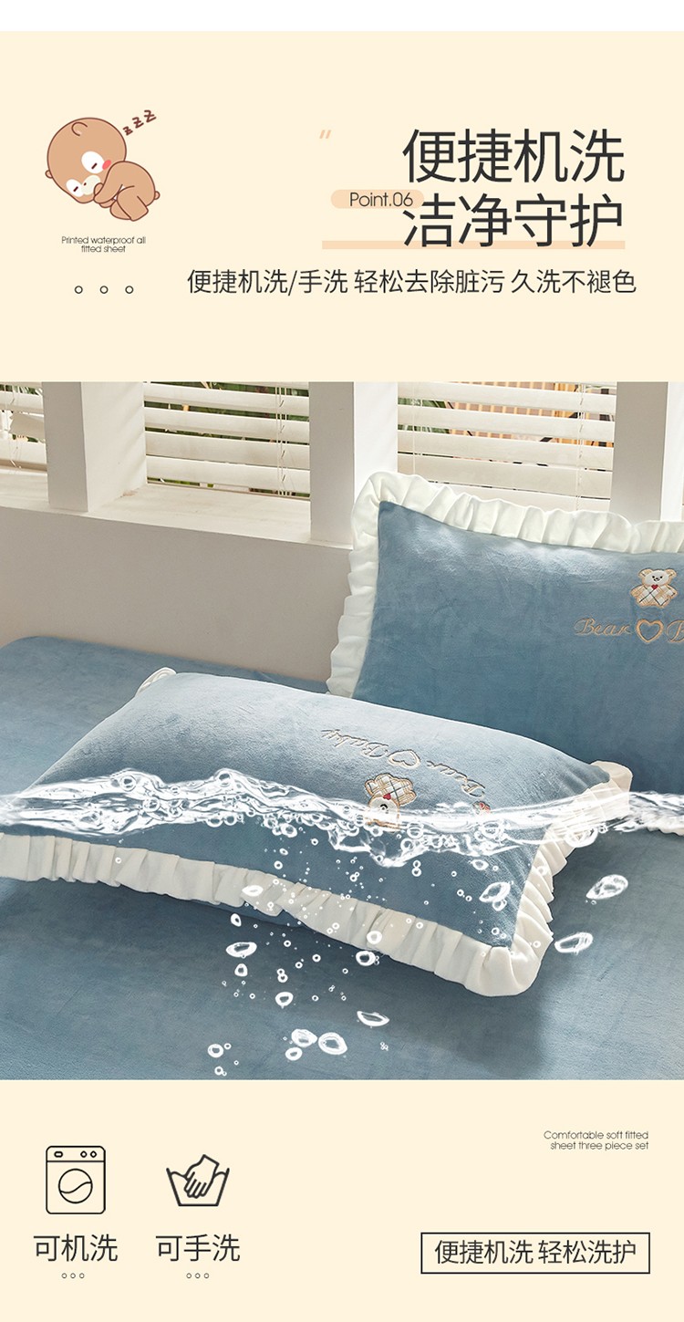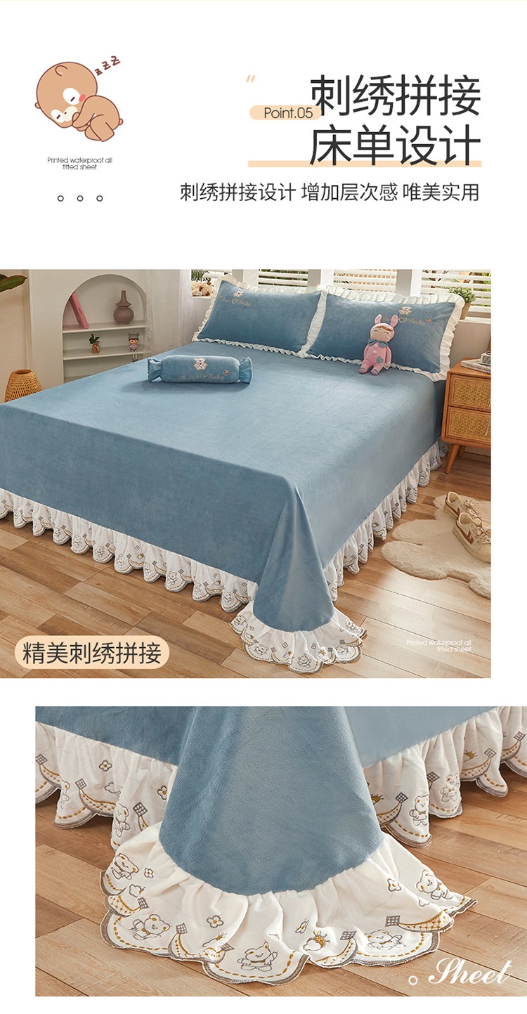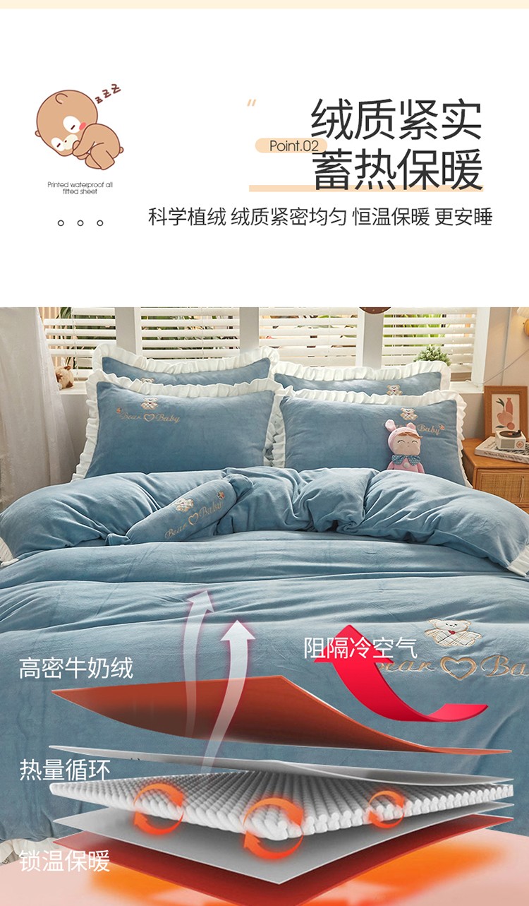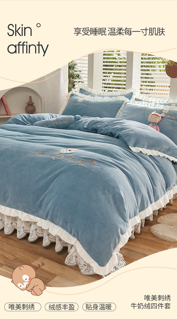 商品名称:宜凡家纺 2021新款牛奶绒绣花熊床单四件套 可爱熊-海蓝