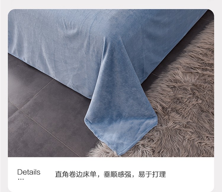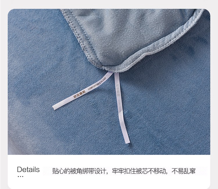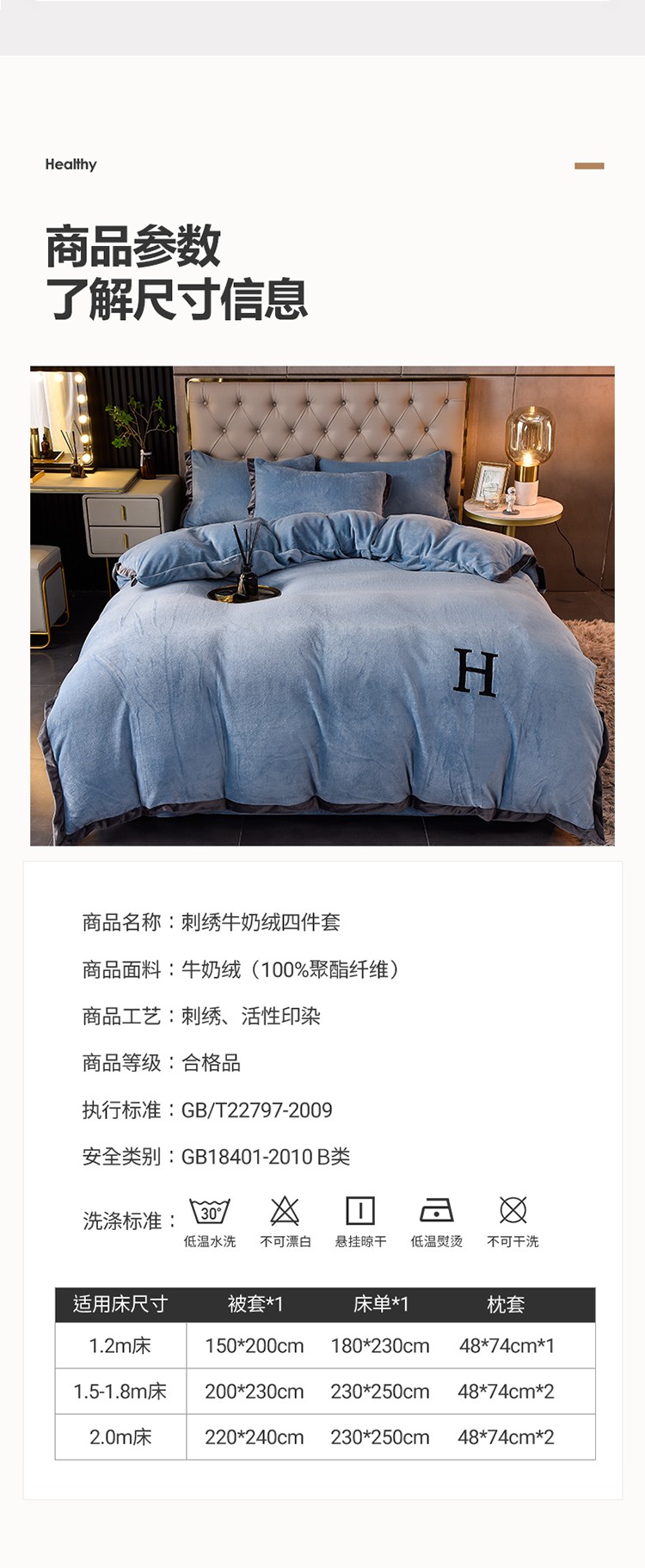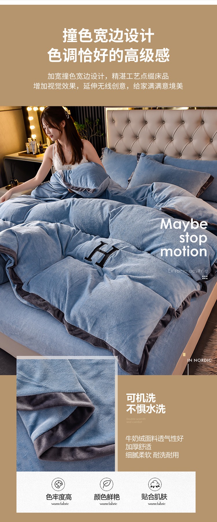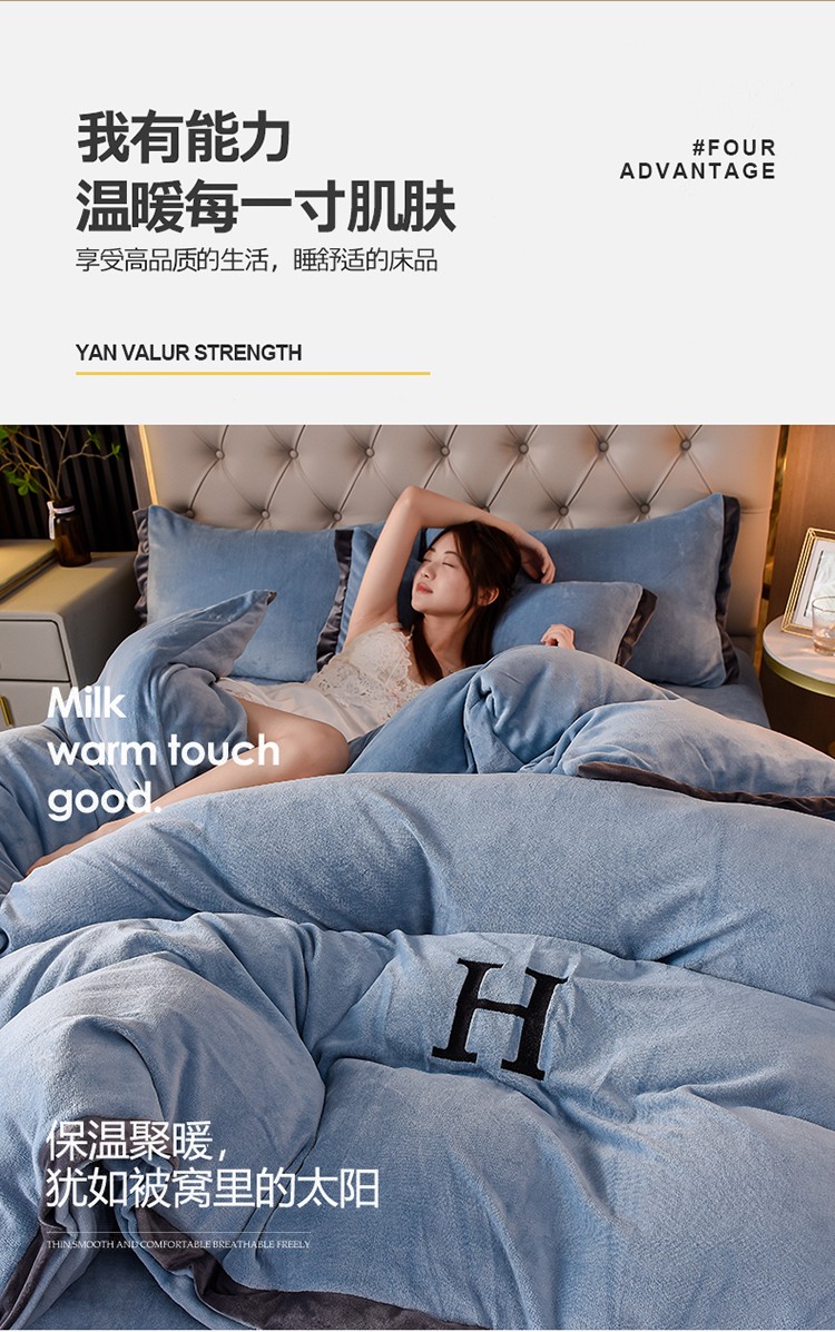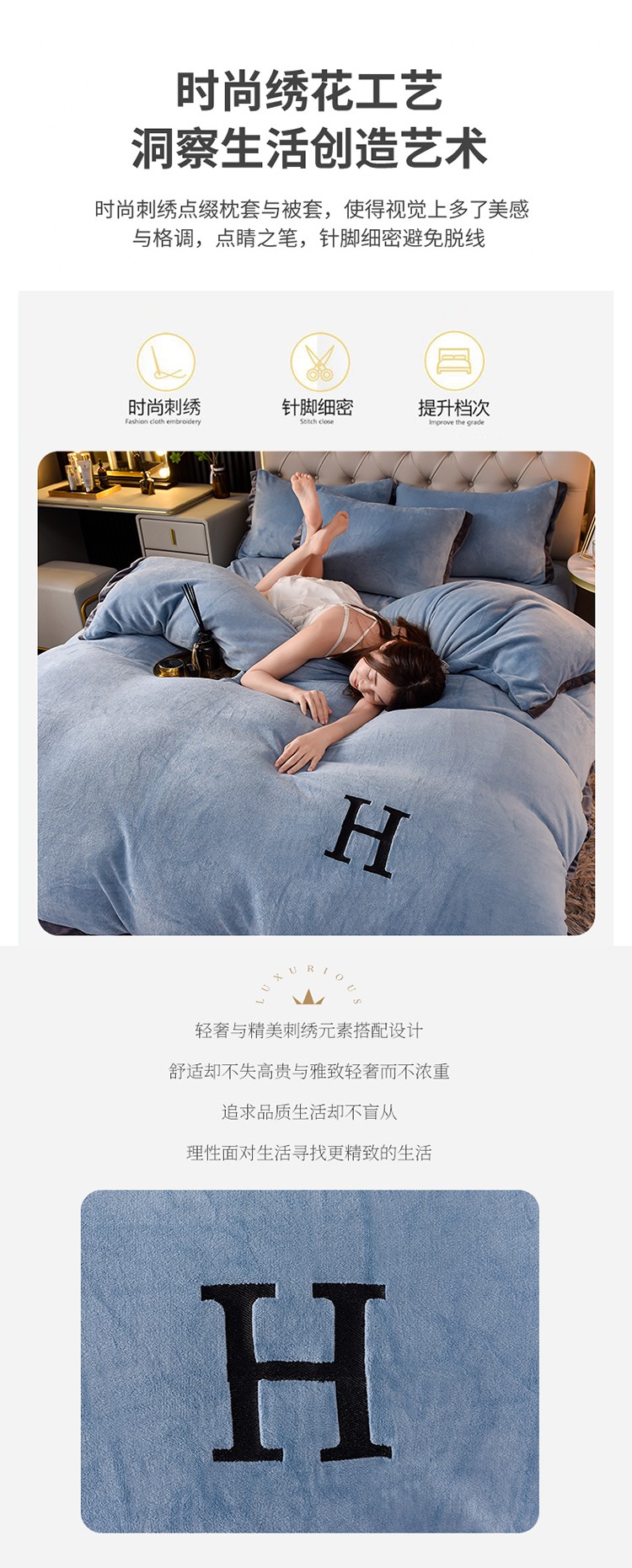 商品名称:简爱家纺2025款高克重牛奶绒拼角工艺四件套 H款-天蓝