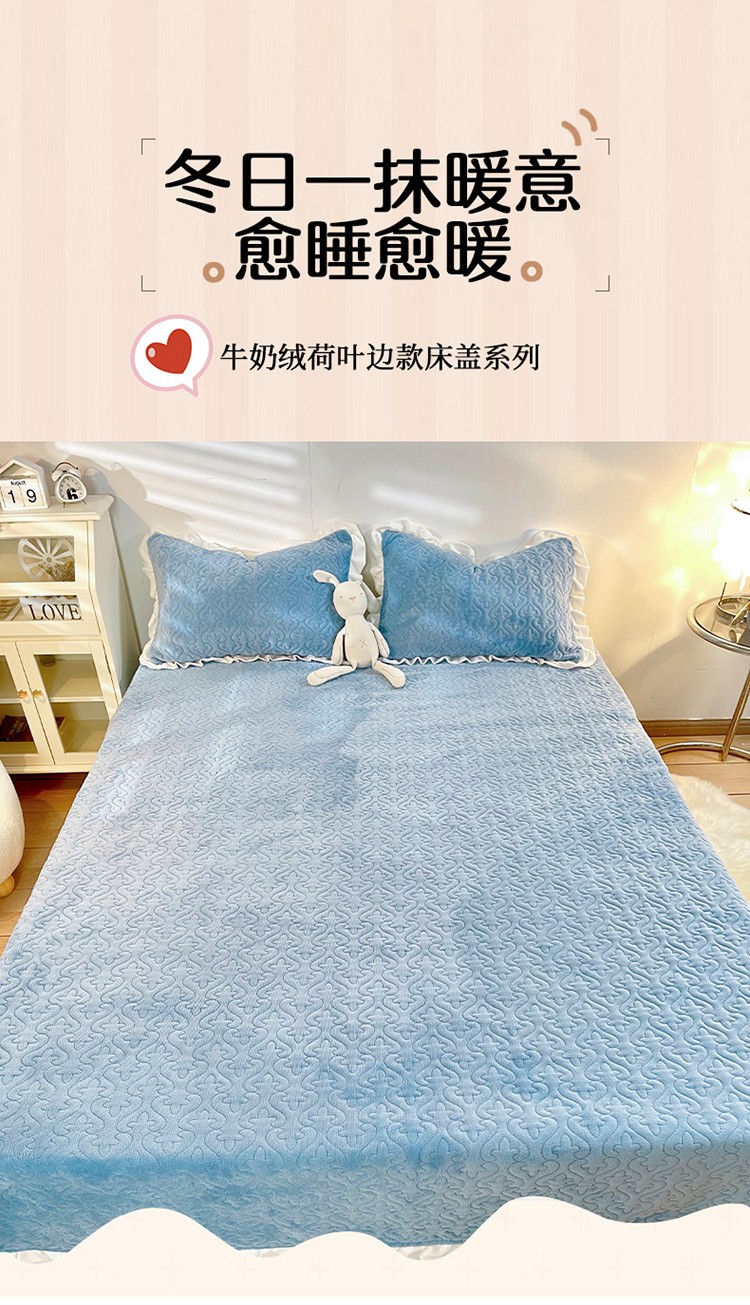 沐辰2021新款加厚牛奶绒荷叶边款床盖 天空蓝