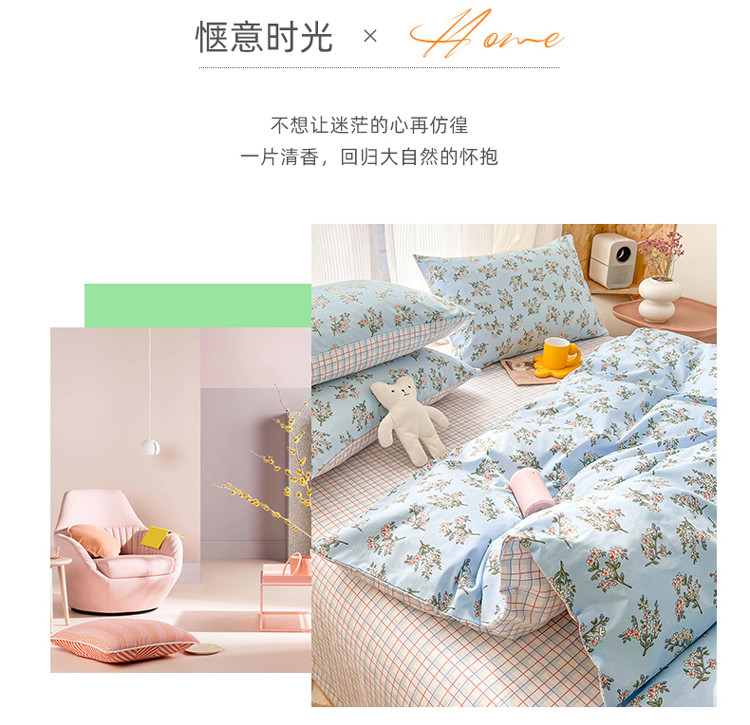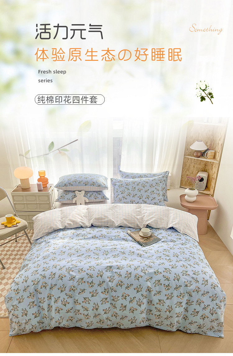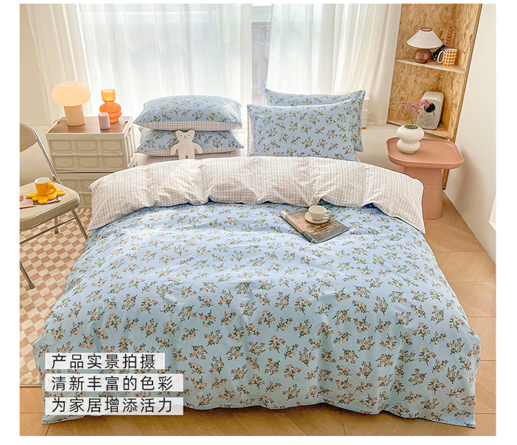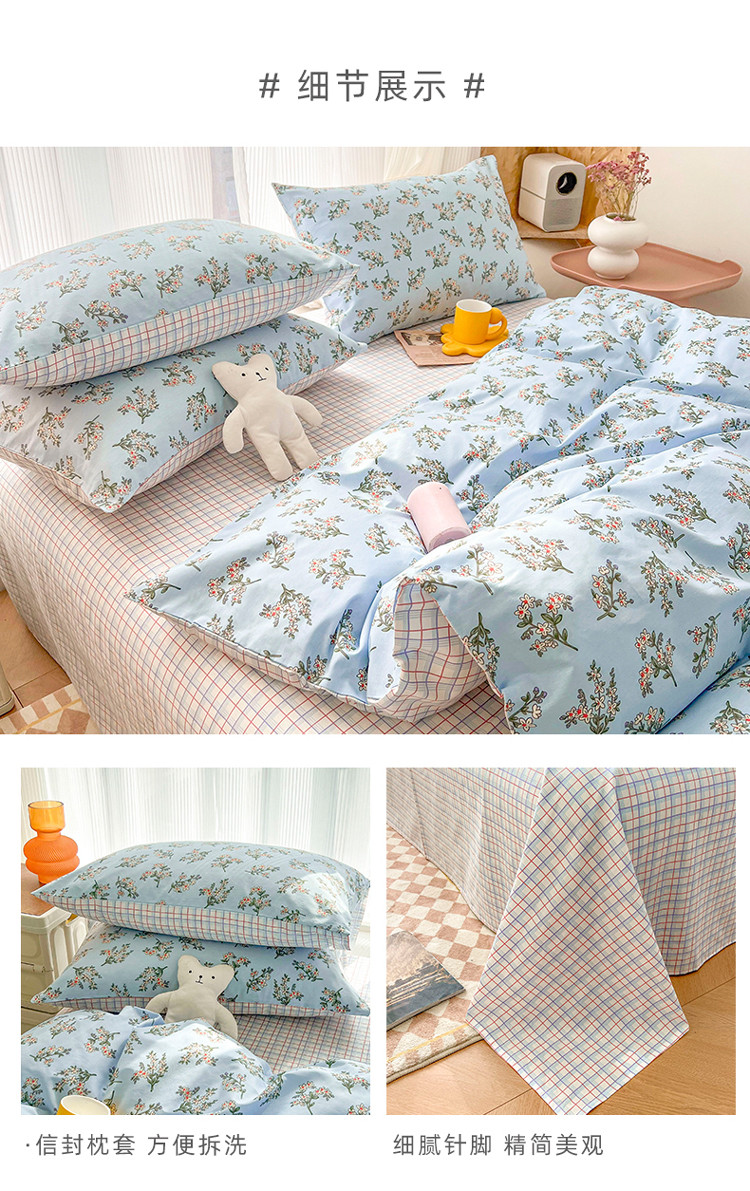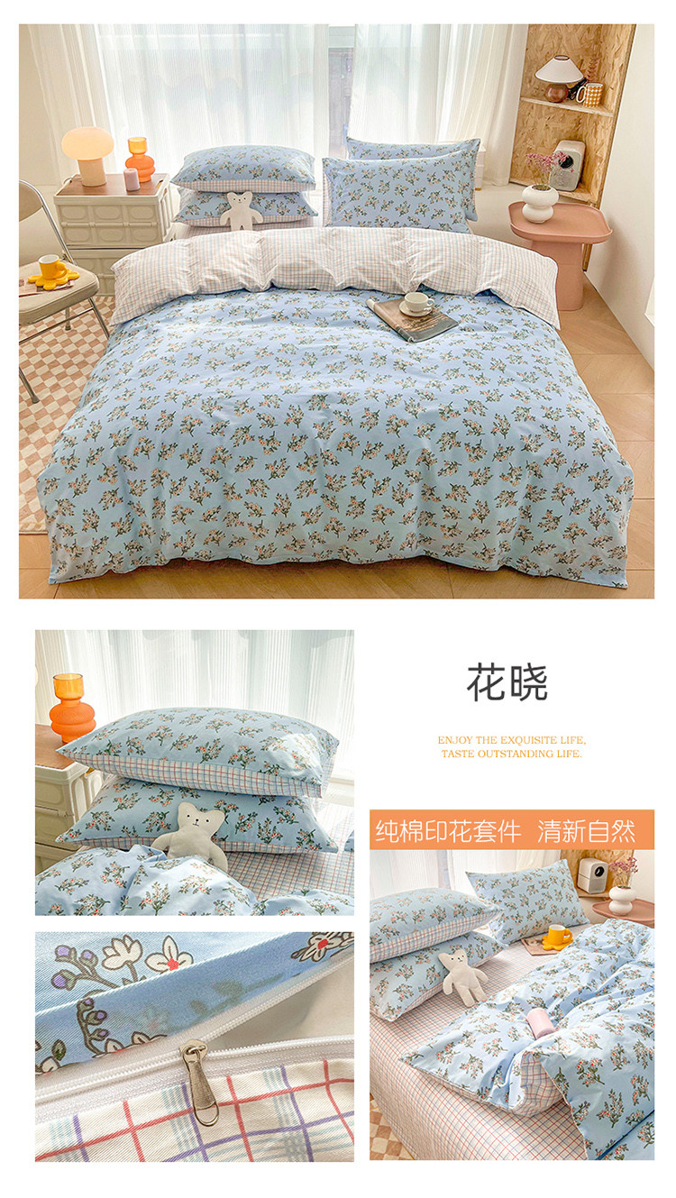 (总)感遇家纺 2022新款全棉印花四件套,格子小花,黑格恐龙,蓝色心情,浅暖