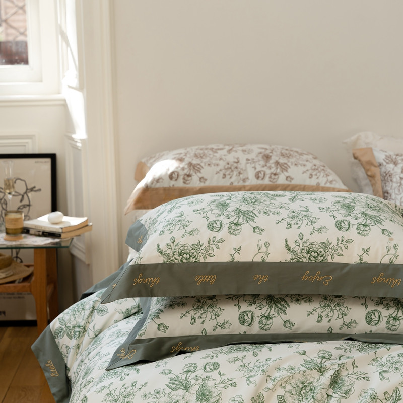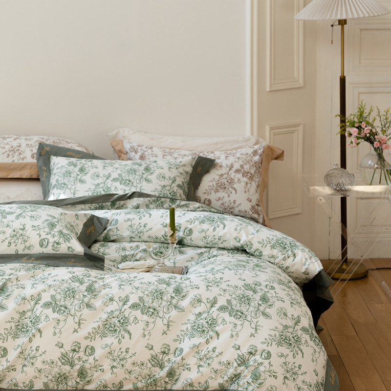 (总)优然居家纺 2025新款50支全棉纯棉印花法式双头木耳边四件套,觅棠,莫妮卡艾绿,莫妮卡罗兰,慕斯粉,薇薇安