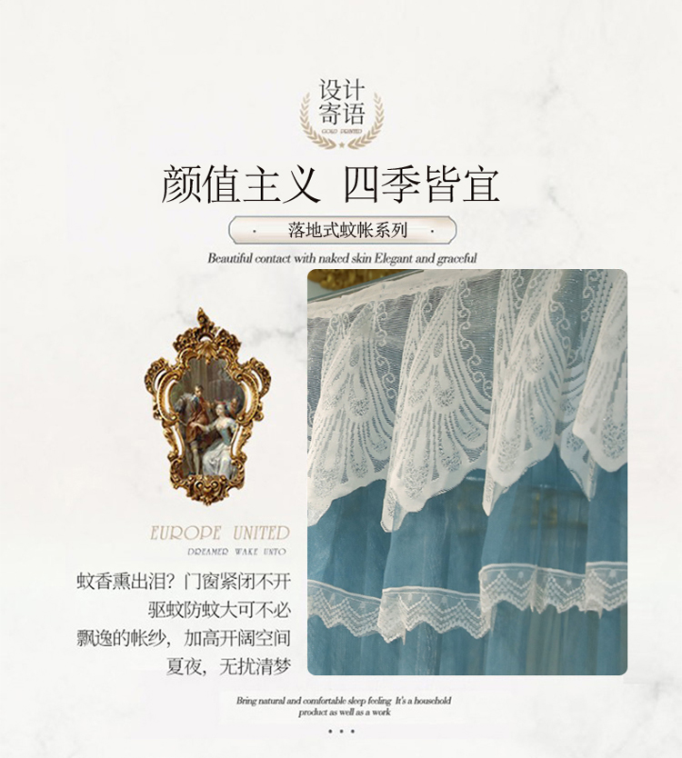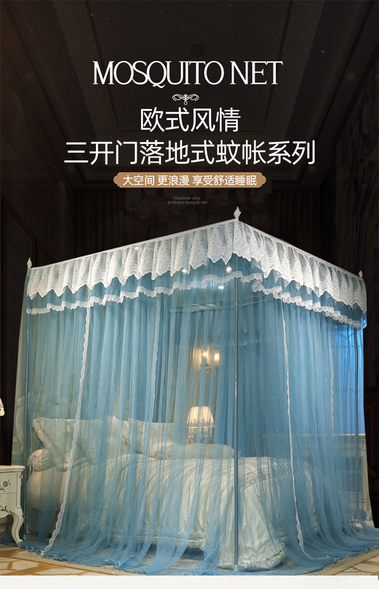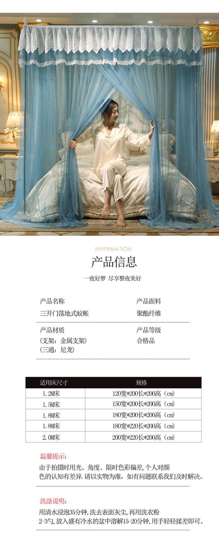 当前位置: 91家纺网 > 商品网购 > 床上用品 > 蚊帐 > 免安装蚊帐 > 迷仙巢2022新款三开门落地式蚊帐-A30锦绣 锦绣-海藻蓝