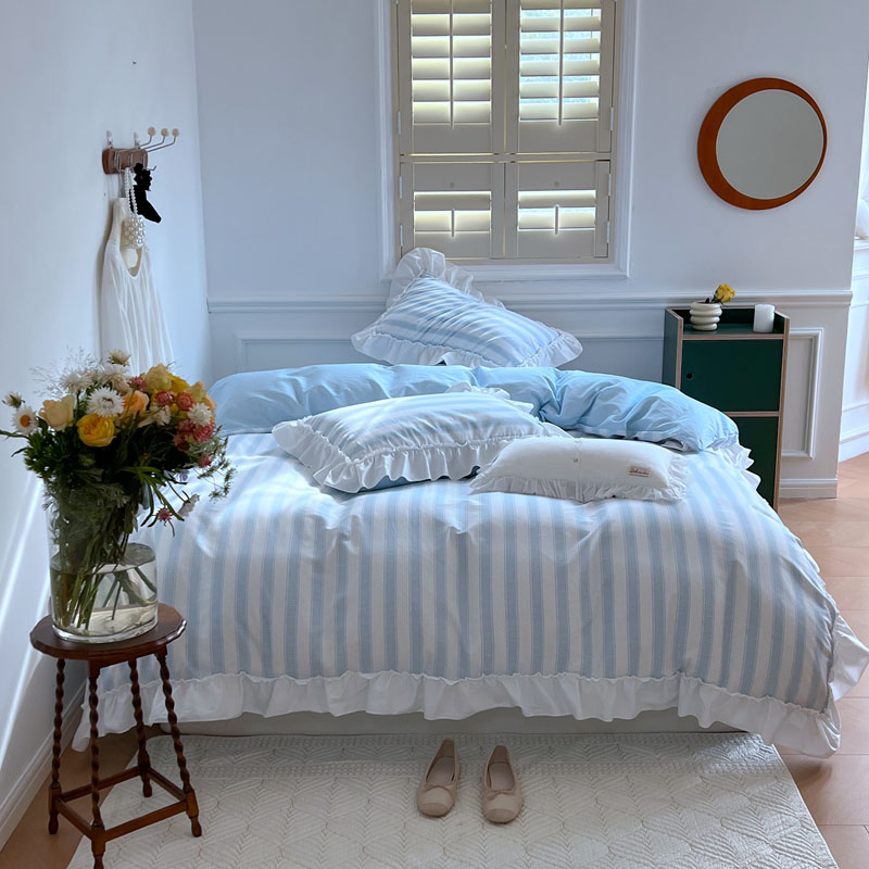 昔可2022新款花边条纹系列四件套 奈雪蓝条纹