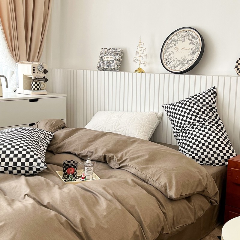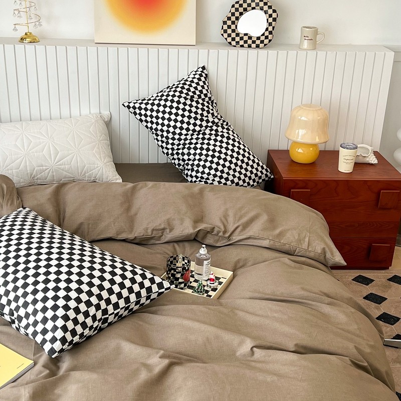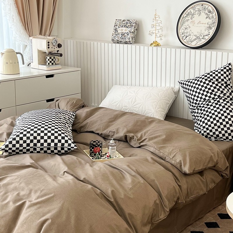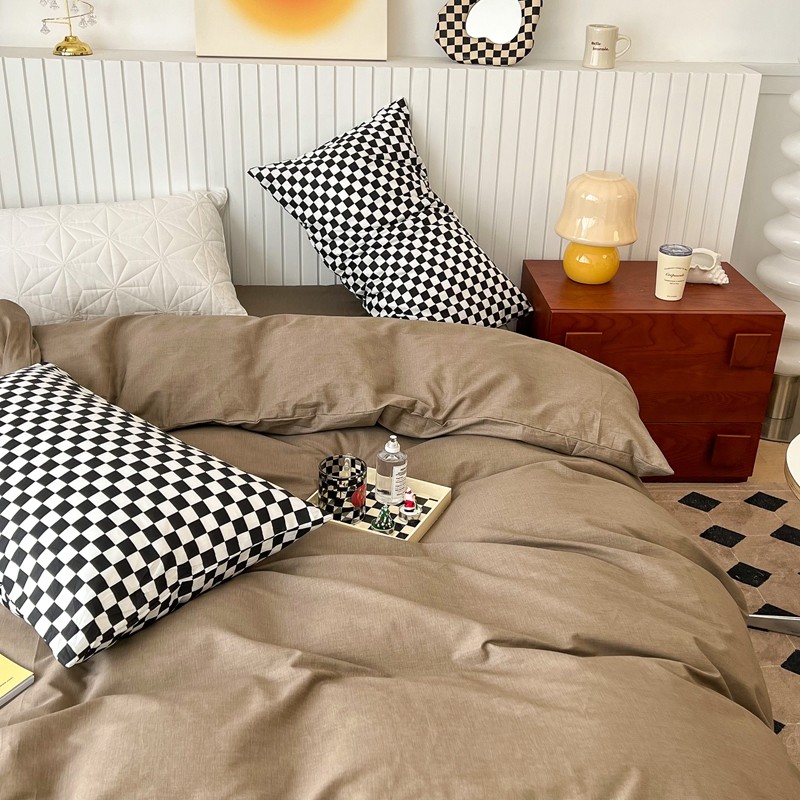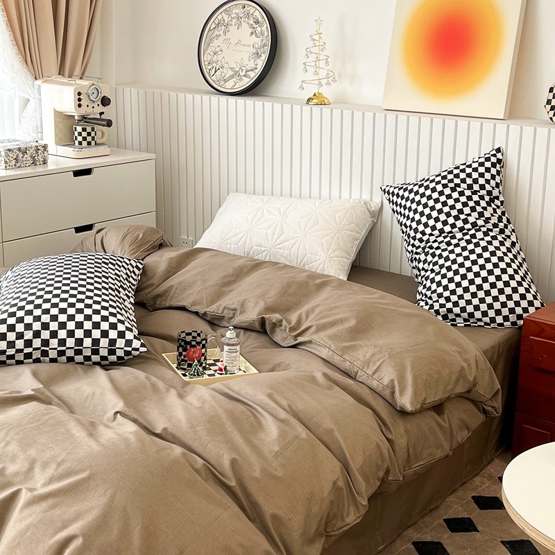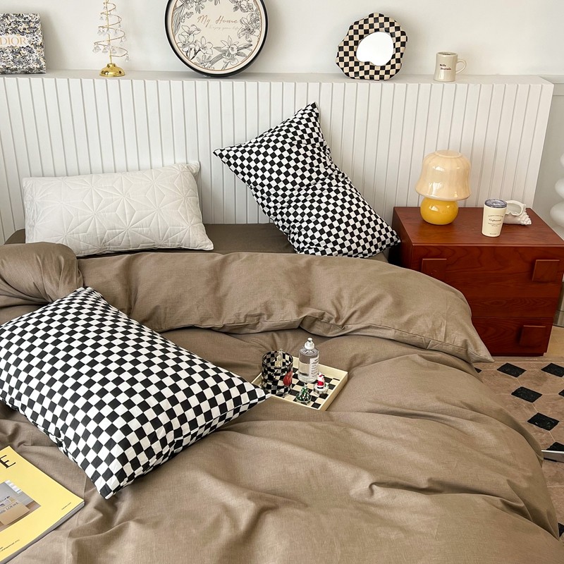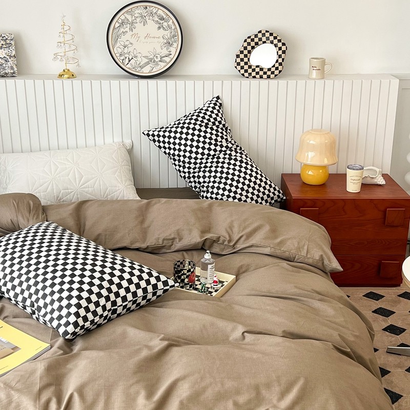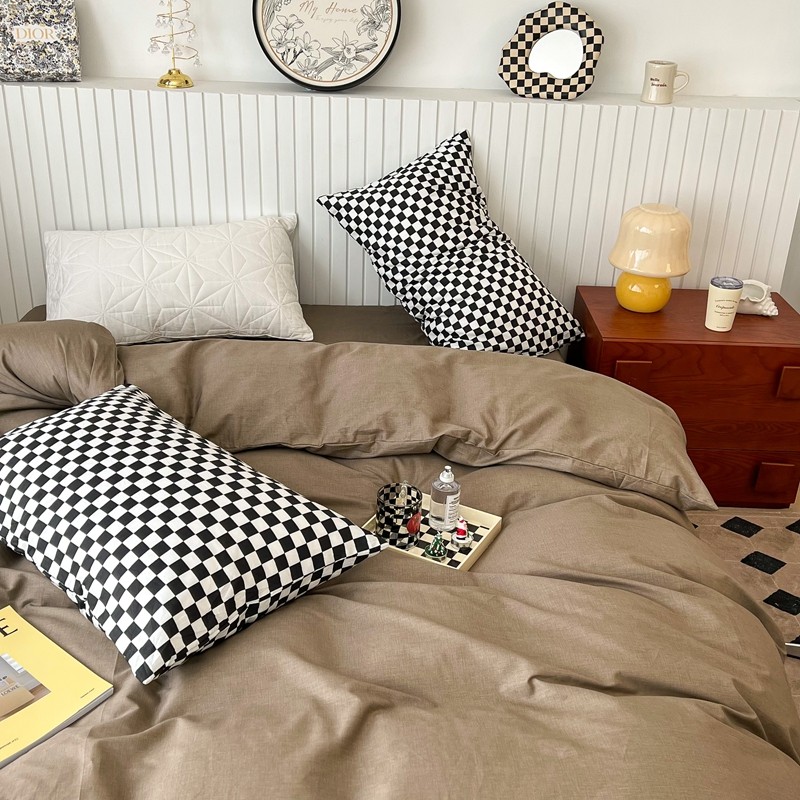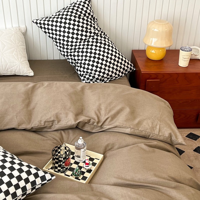 昔可2022新款混搭纯色棋盘格套件四件套 咖棕黑棋盘