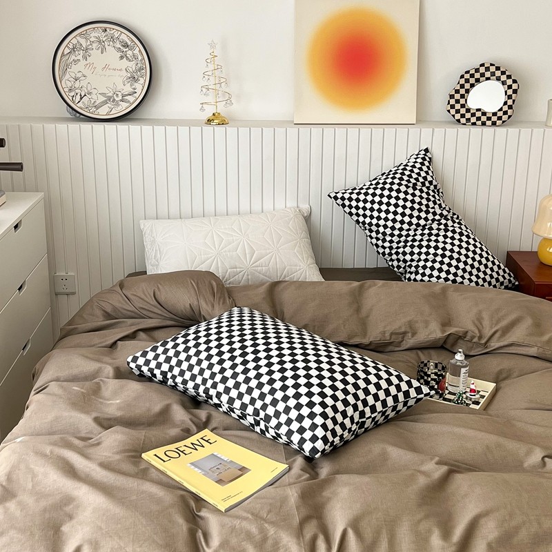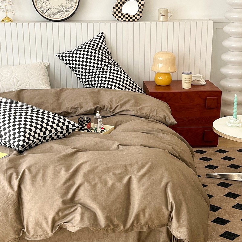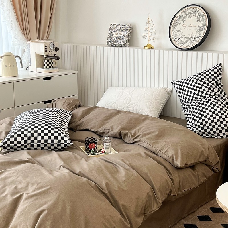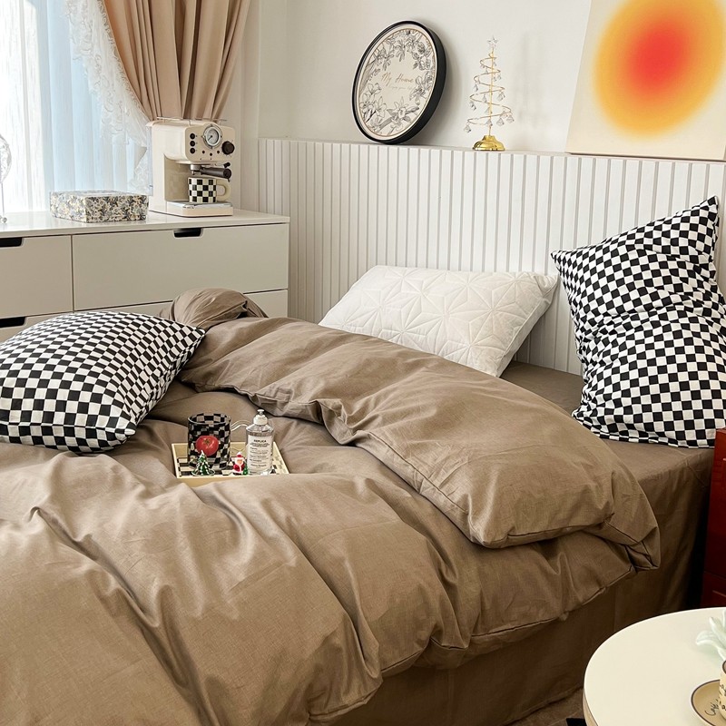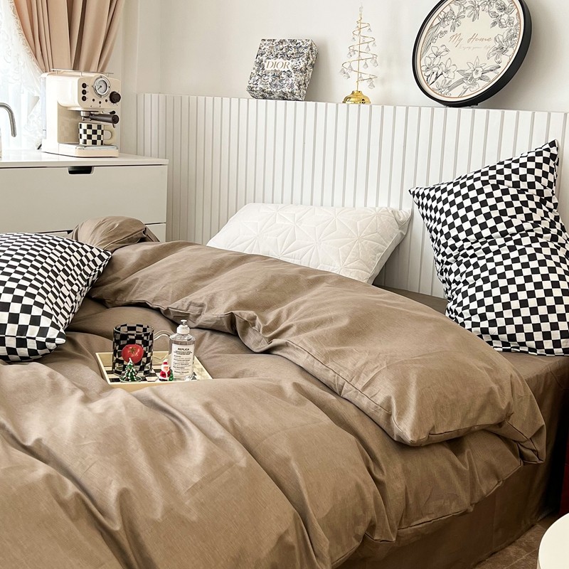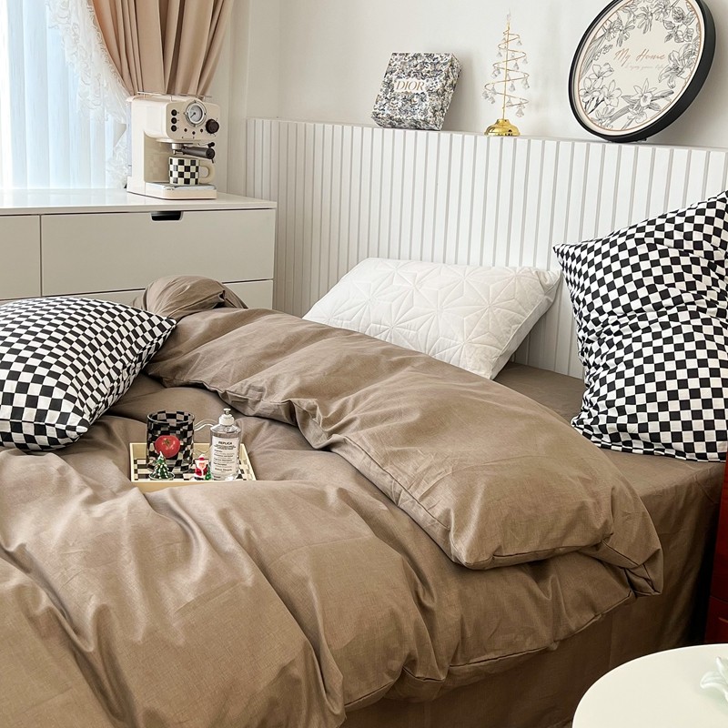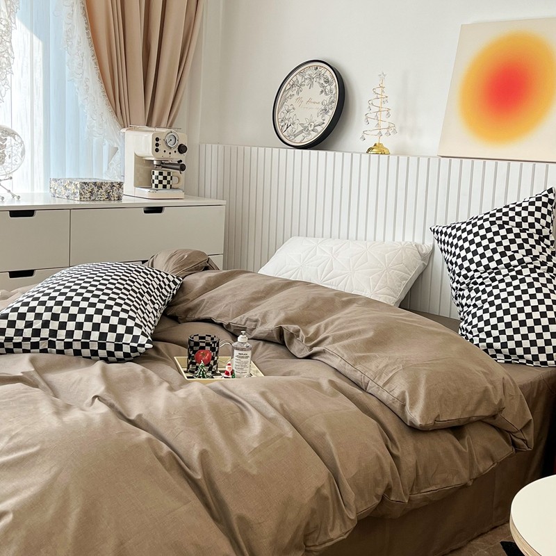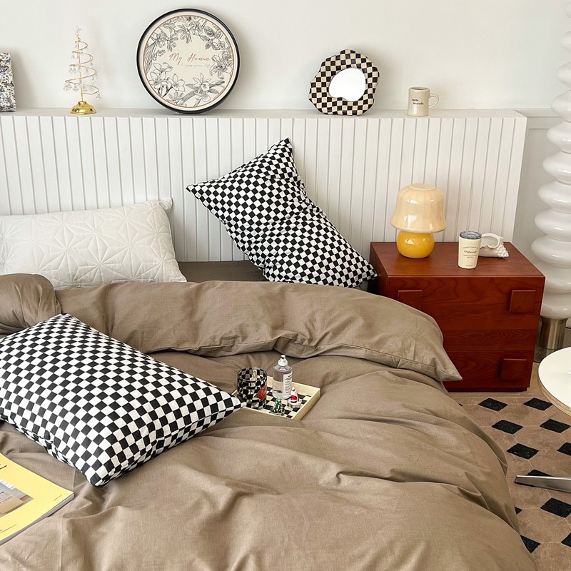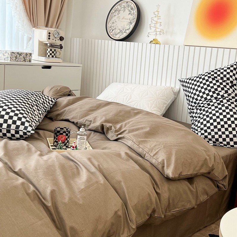 昔可2022新款混搭纯色棋盘格套件四件套 咖棕黑棋盘