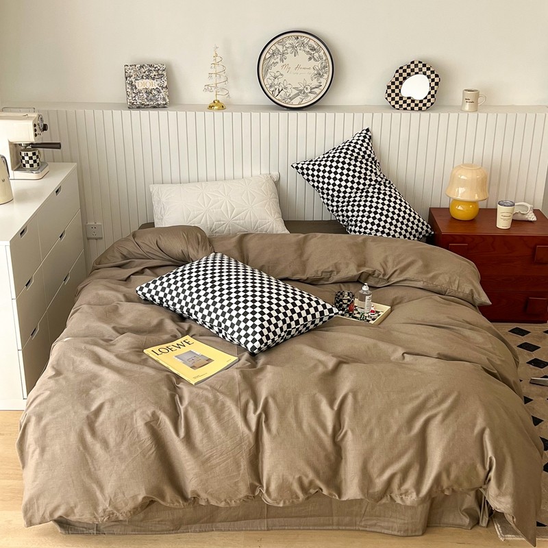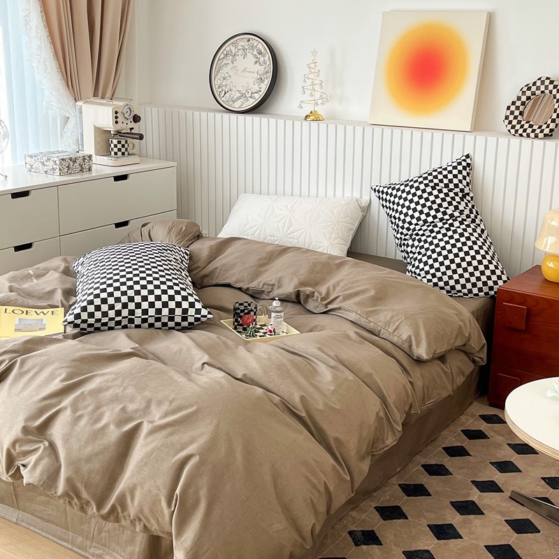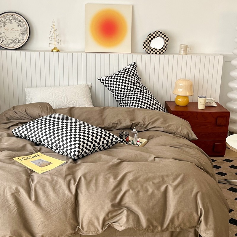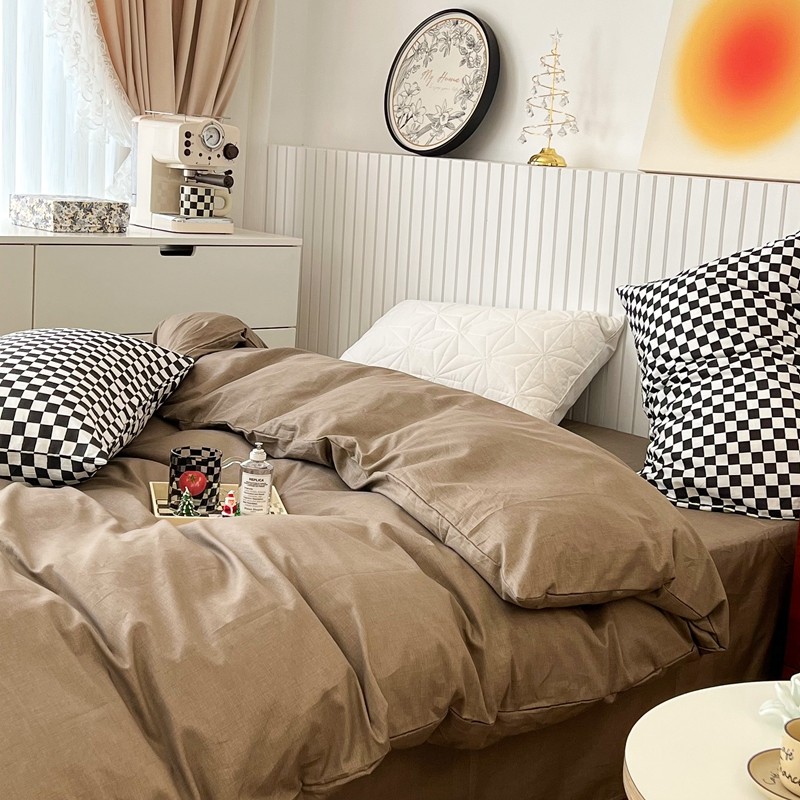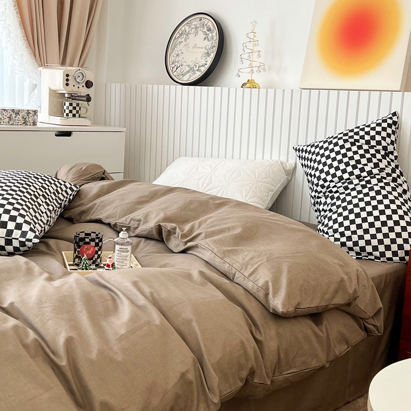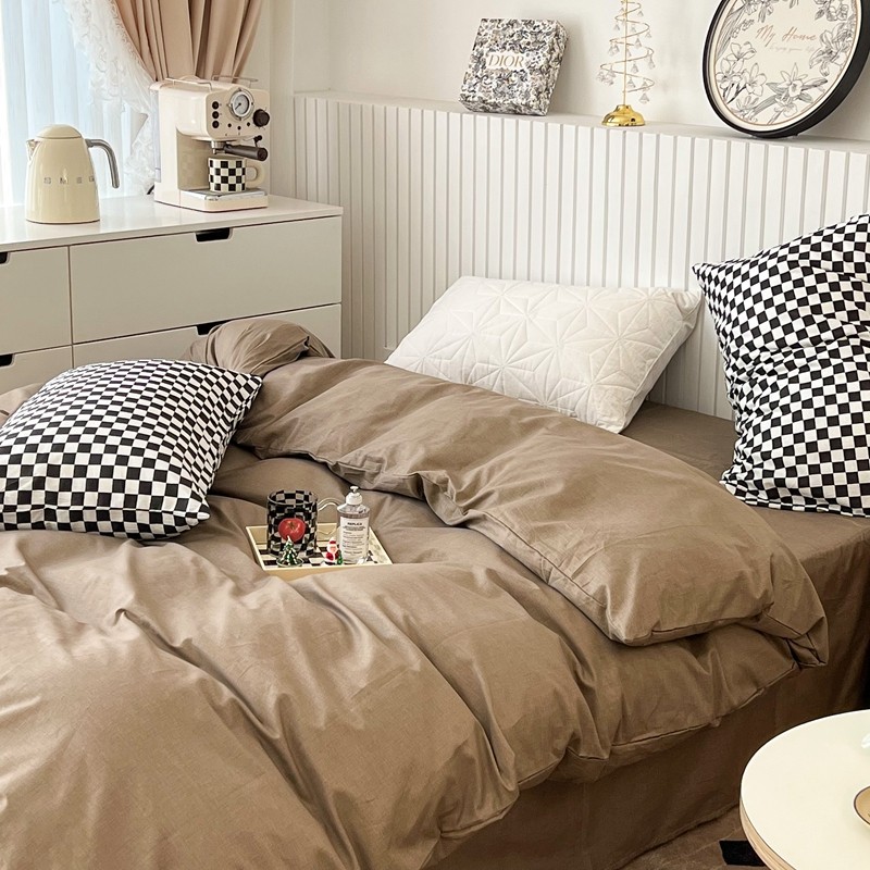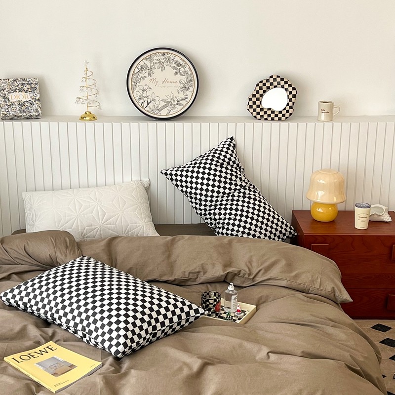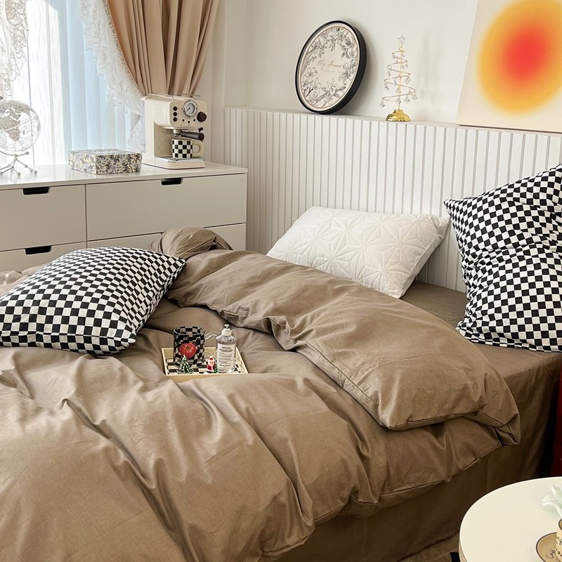 昔可2022新款混搭纯色棋盘格套件四件套 咖棕黑棋盘