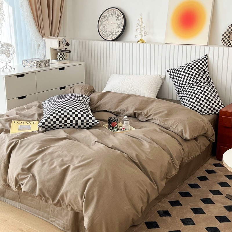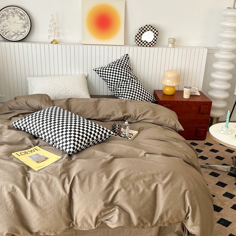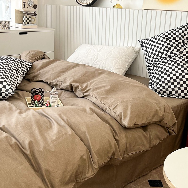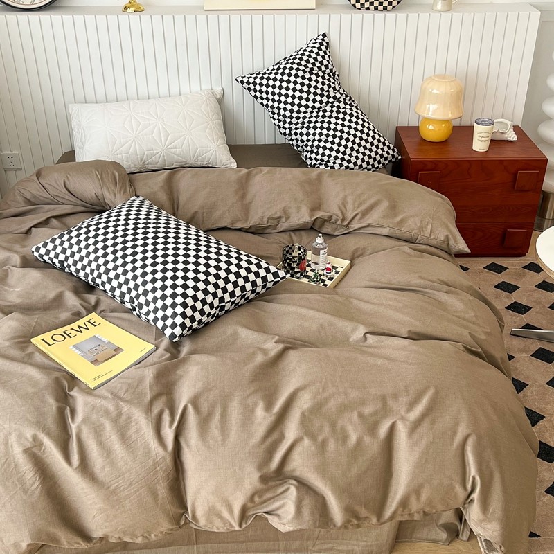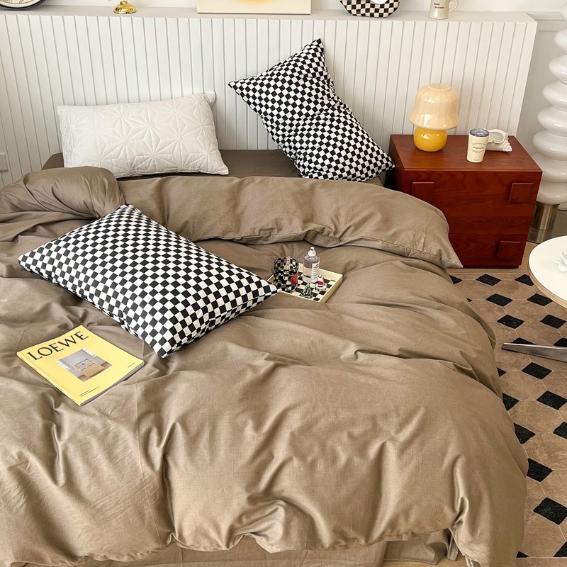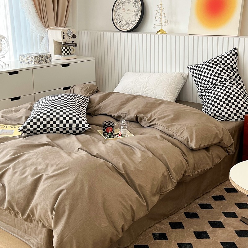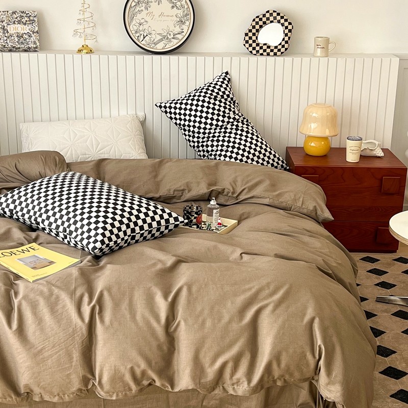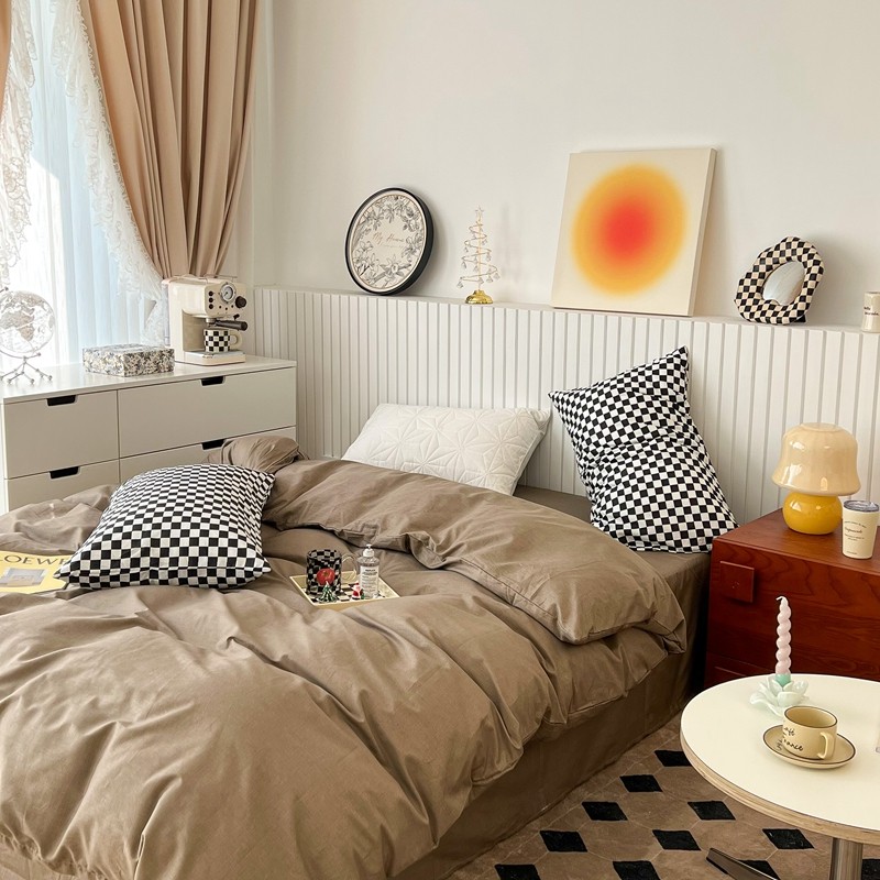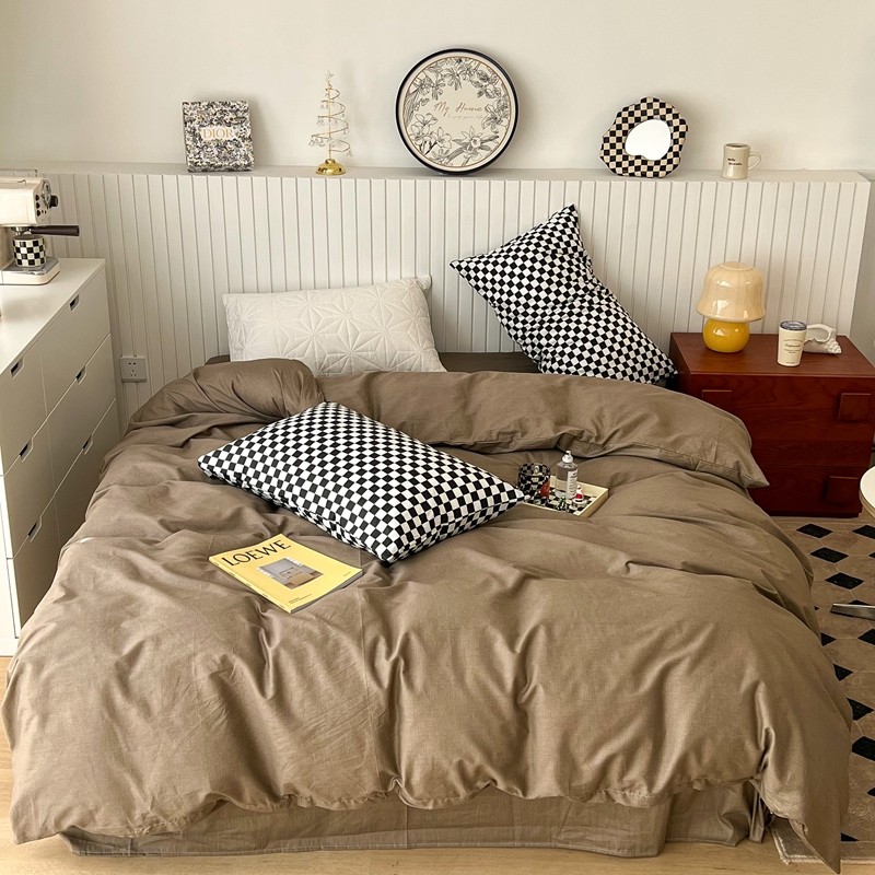 昔可2022新款混搭纯色棋盘格套件四件套 咖棕黑棋盘