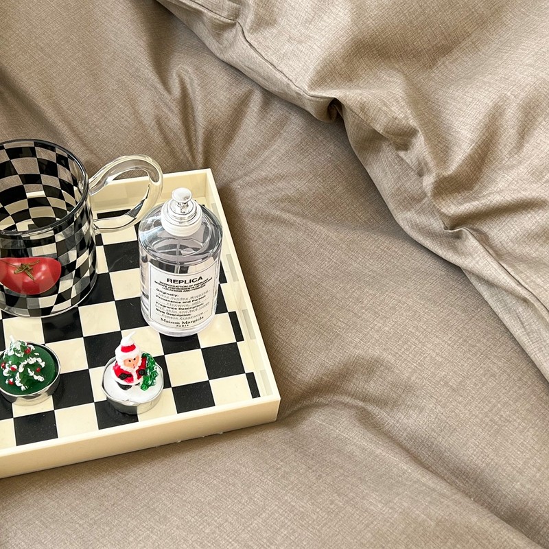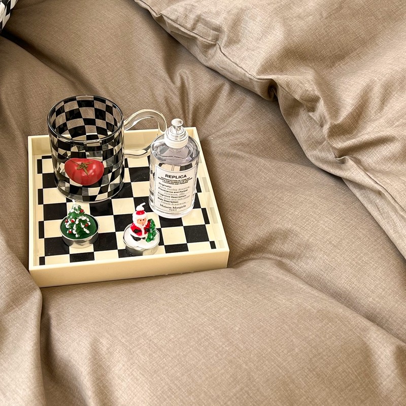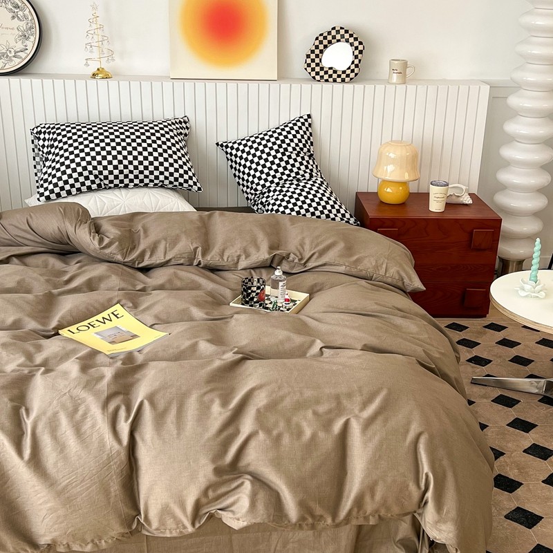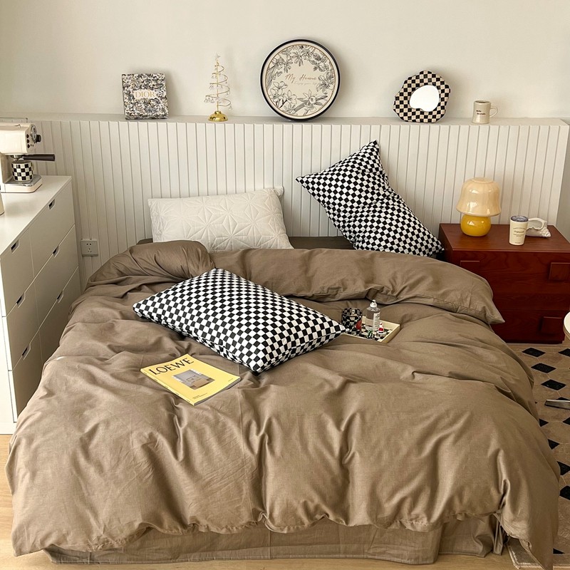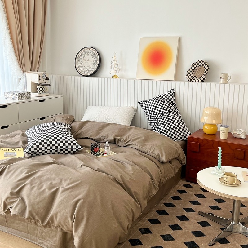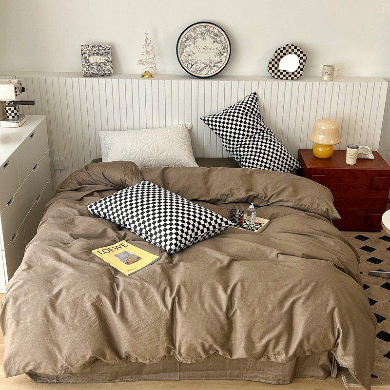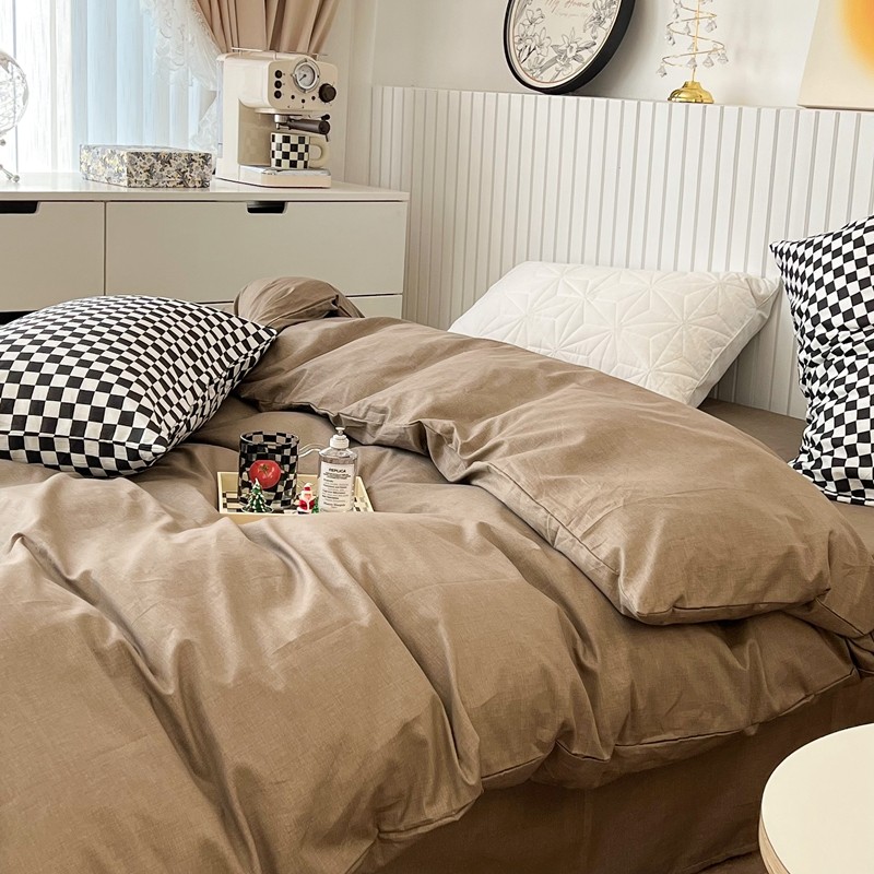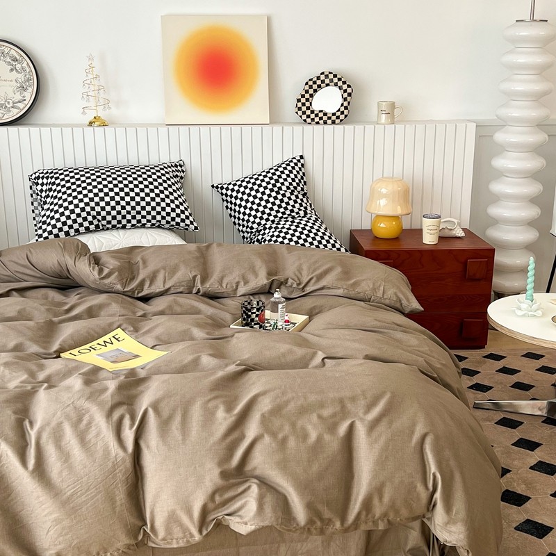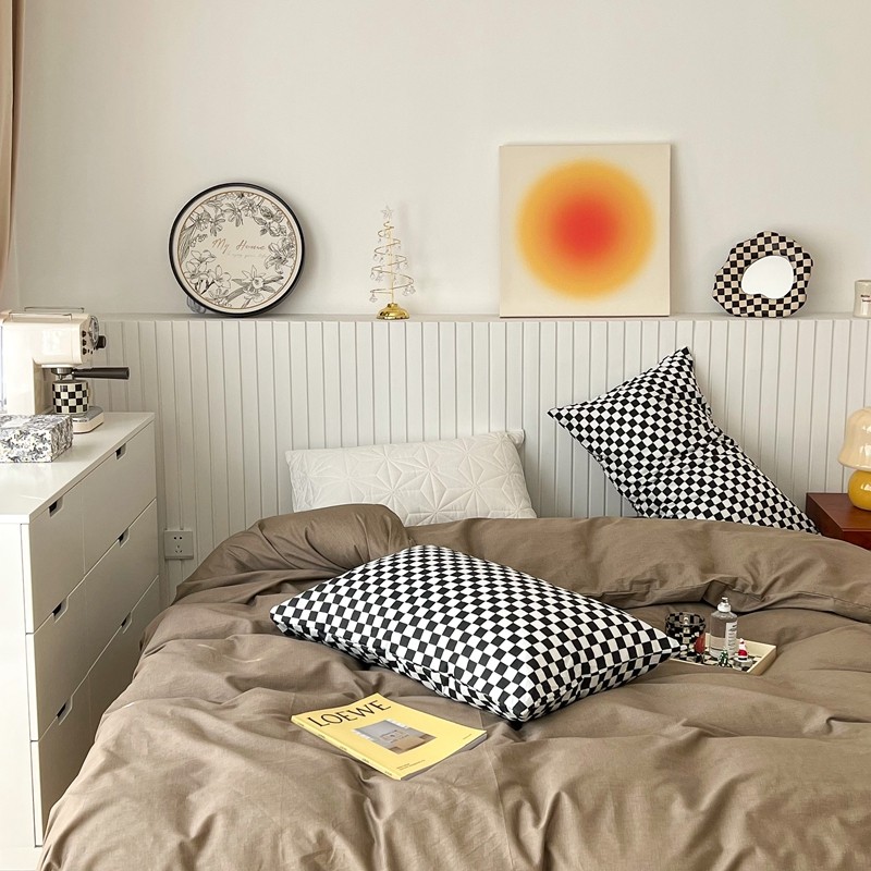 昔可2022新款混搭纯色棋盘格套件四件套 咖棕黑棋盘