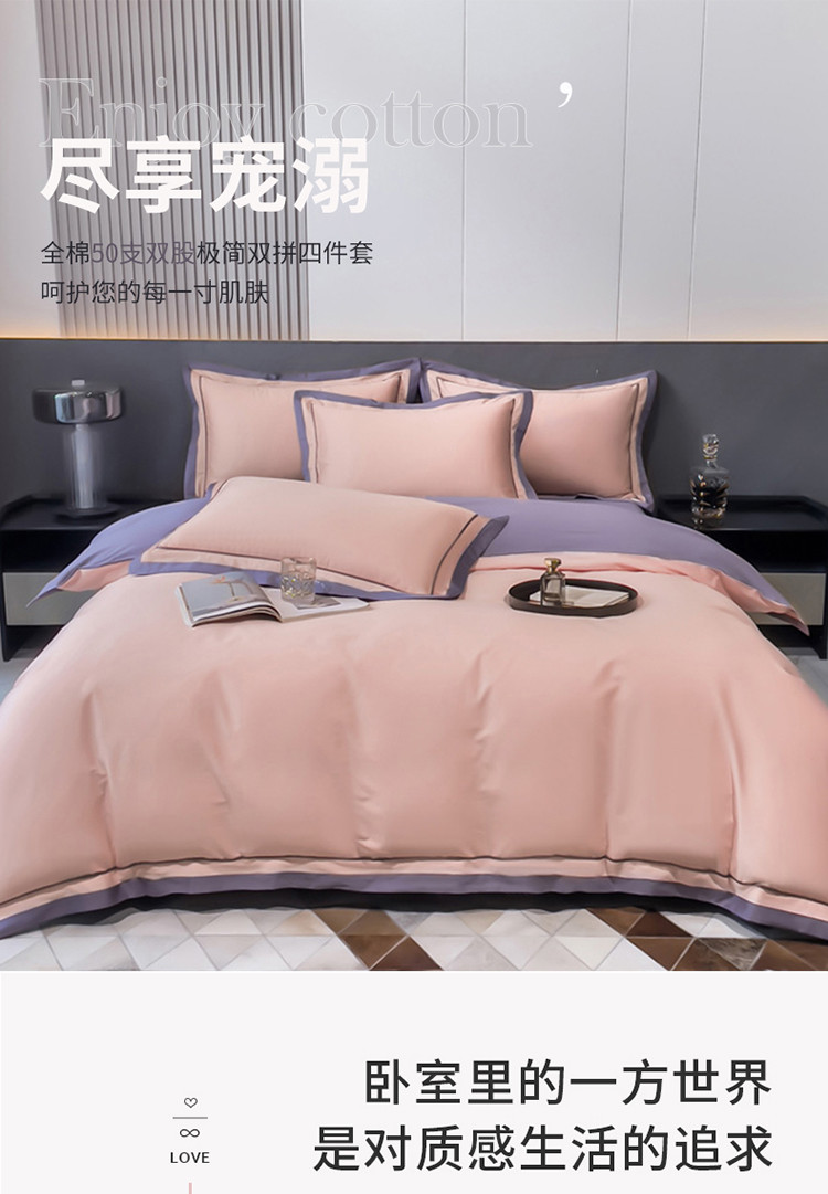 好阁 2023新款100支长绒棉双股全棉极简双拼四件套 粉紫