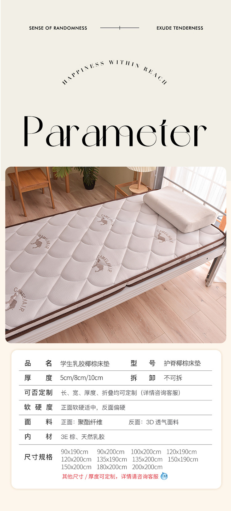 当前位置: 91家纺网 > 商品网购 > 床垫/床褥/床护垫 > 普通床垫 > 时奥 新款椰棕护颈床垫系列-学生款(包邮) SN驼绒白(乳胶+椰棕)