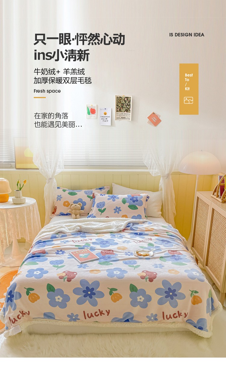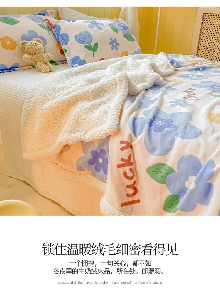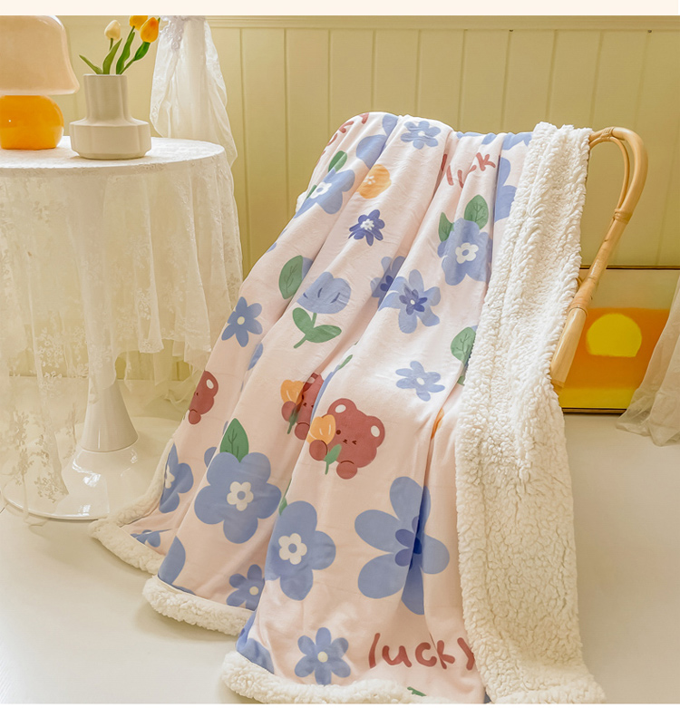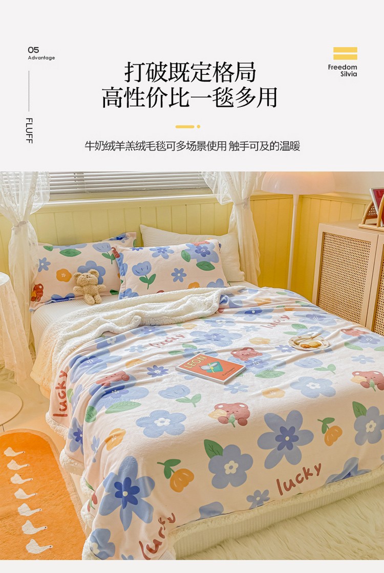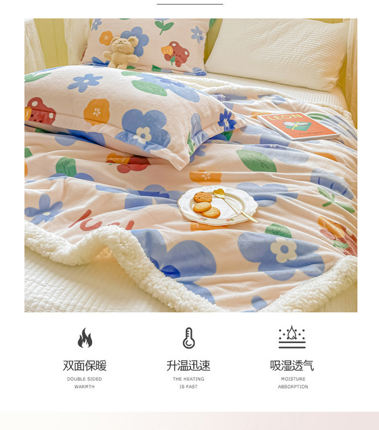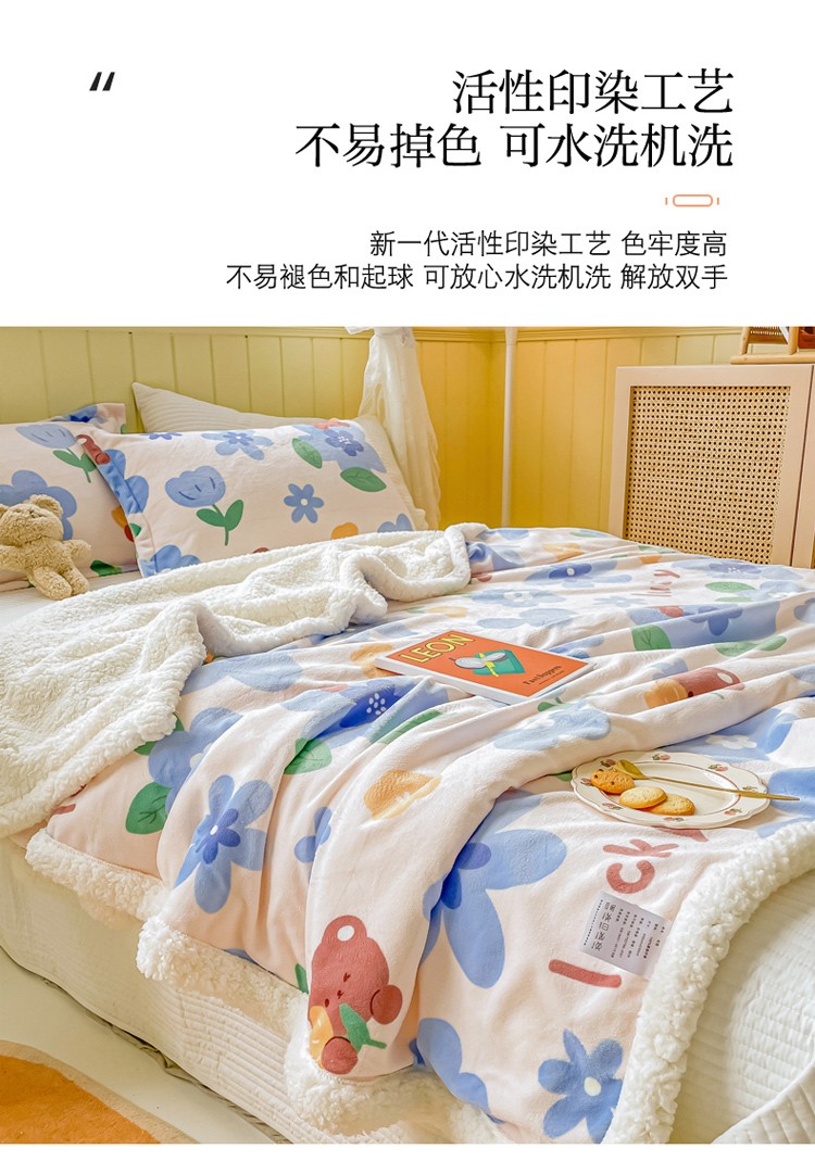 沐慕 2022新款牛奶绒拼羊羔绒毛毯 蓝花小熊