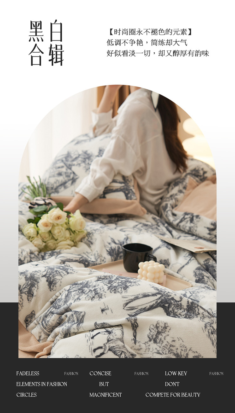 商品名称:晨曦慵懒风黑白合辑极简主义奶油绒牛奶绒四件套森林城堡加点奶咖