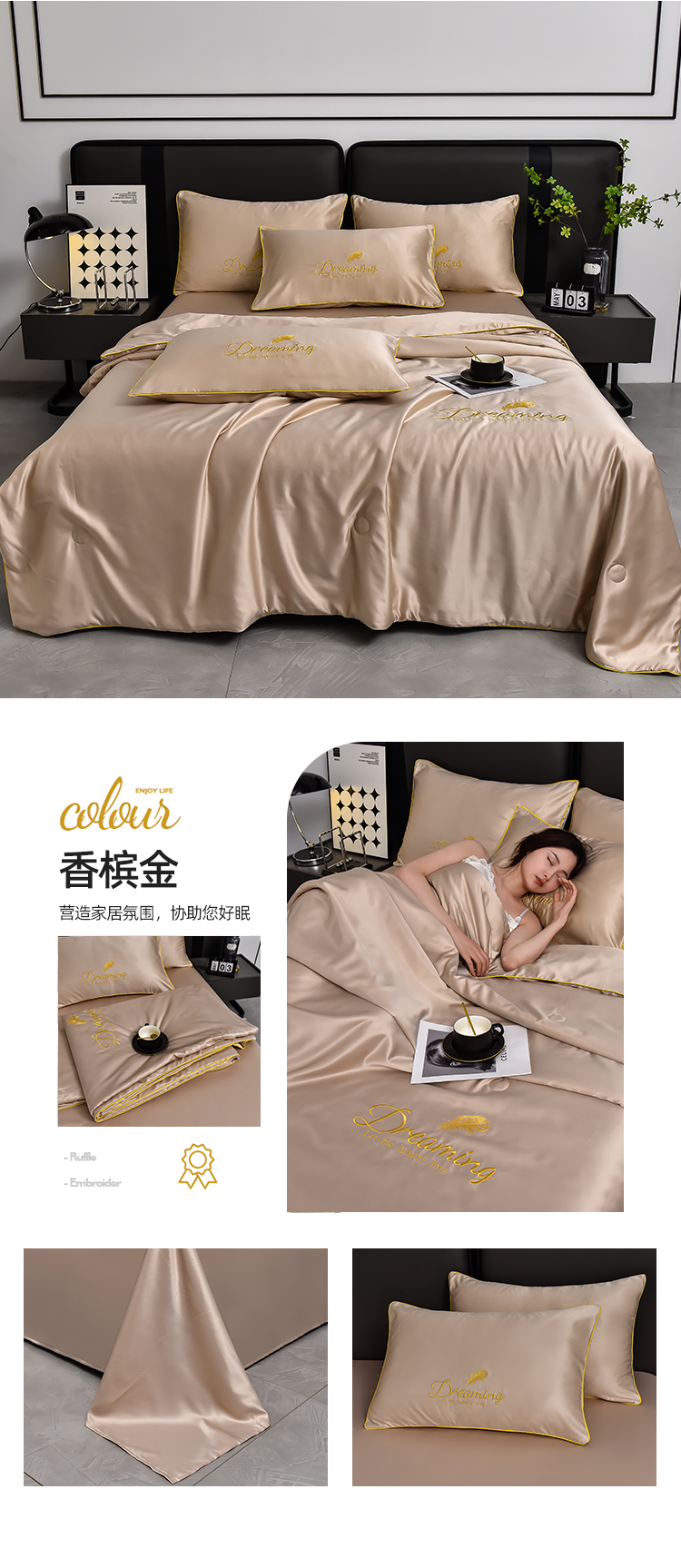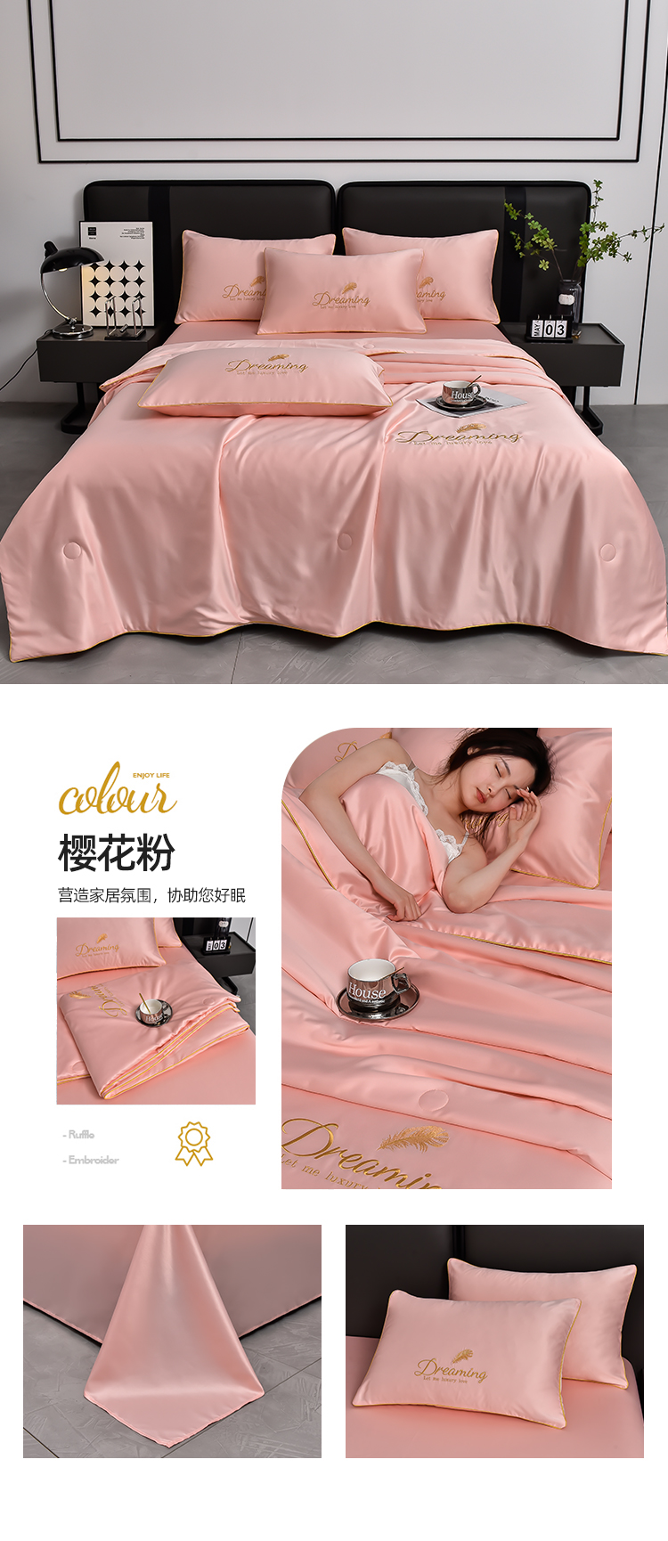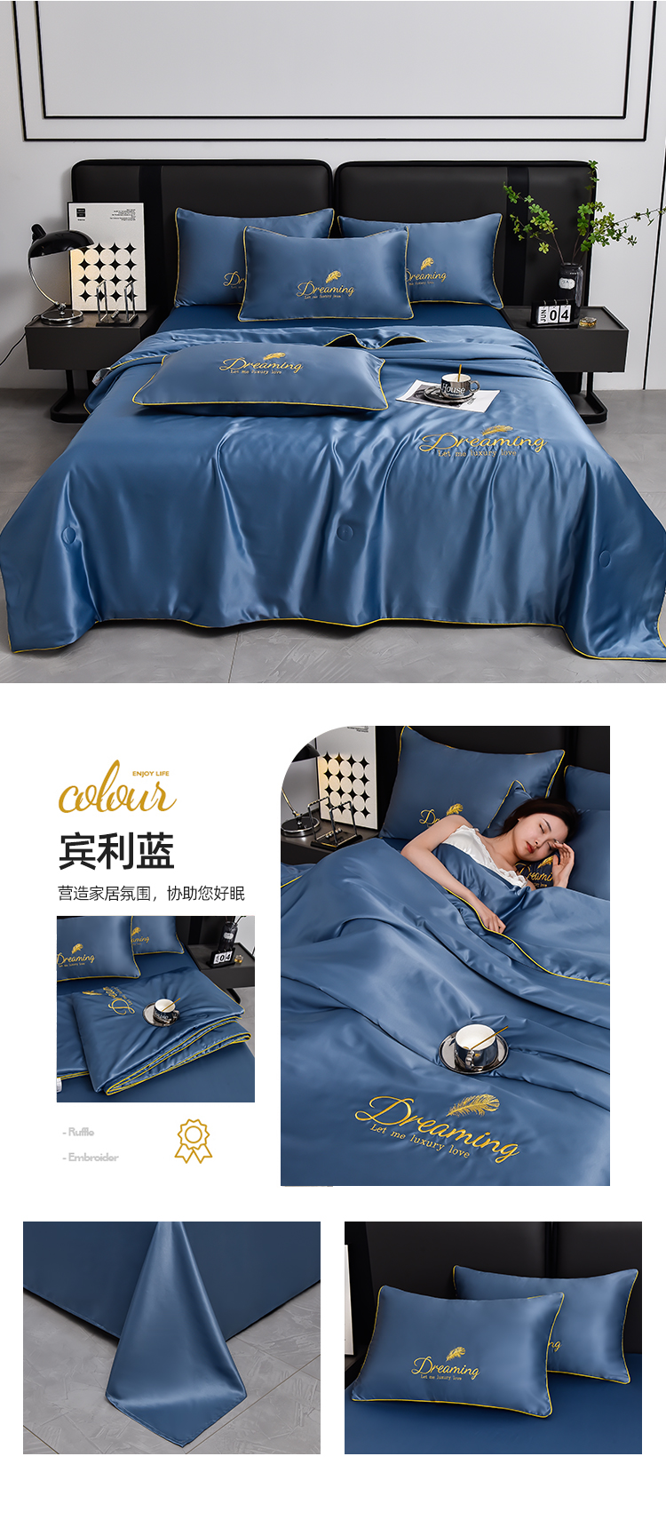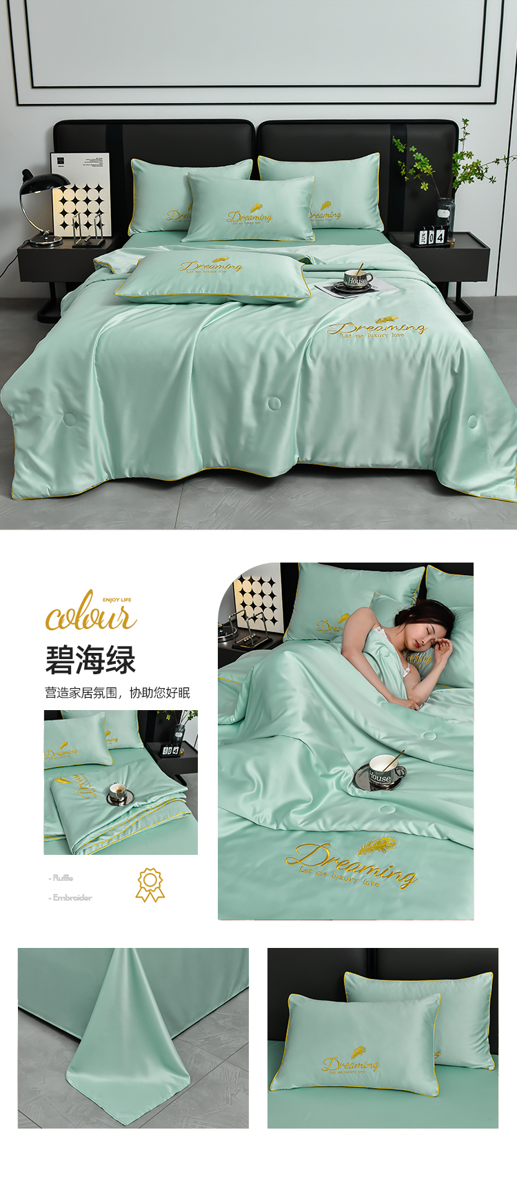 (总)简爱 2025新款水洗真丝刺绣夏被四件套(跑量款) 直播,梦羽-碧海绿,梦羽-宾利蓝,梦羽-高级灰,梦羽-奶茶白,梦羽-天空蓝,梦羽-香槟金,梦羽-星雾蓝,梦羽-樱花粉