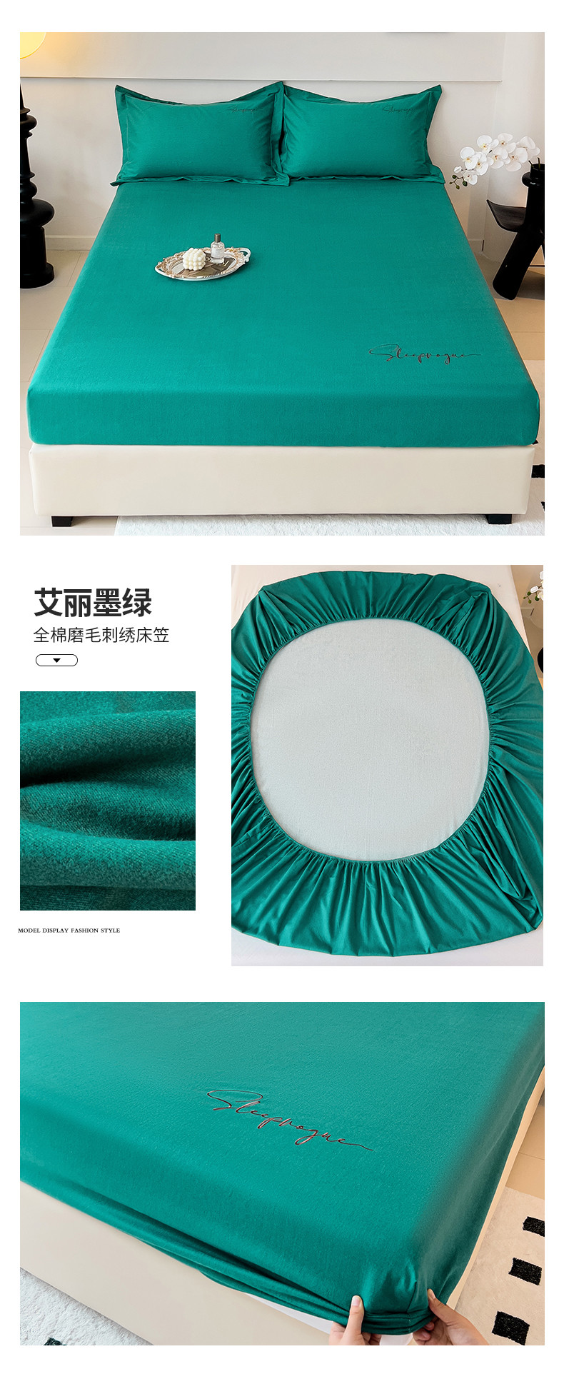 • 91家纺网 家纺一手货源 找家纺 品乐家纺 2023新款全棉磨毛英文字母绣床笠+枕套 艾丽墨绿