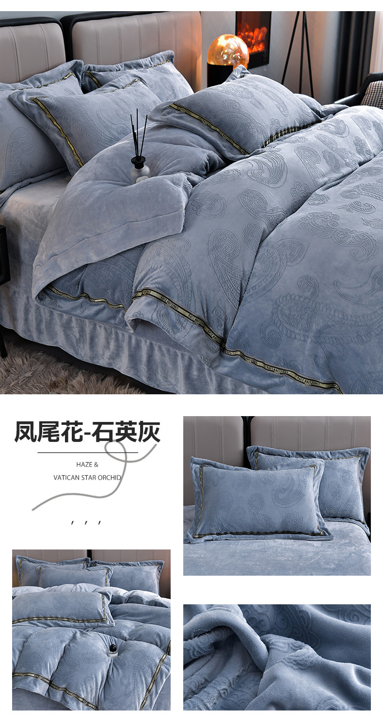 商品名称:妮恒美 2023新款牛奶绒雕花压线款四件套 凤尾花-石英灰