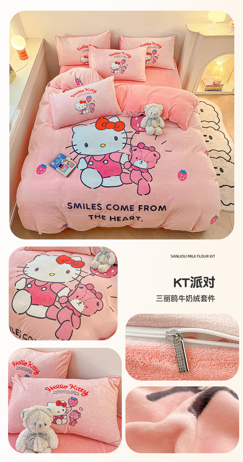 当前位置: 91家纺网 > 商品网购 > 床品套件 > 四件套 > 牛奶绒四件套 > 孩子王 2023正版授权直播三丽鸥卡通大版双面加厚牛奶绒系列 KT派对