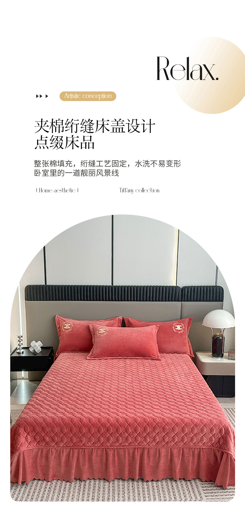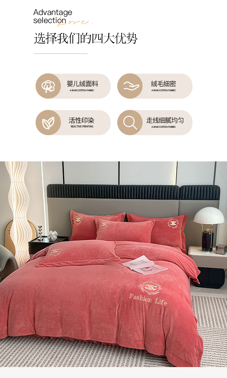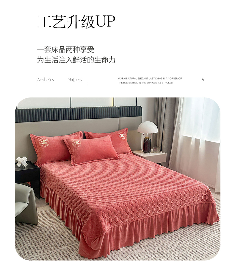 商品名称:羋多家纺 210g婴儿绒床盖三件套牛奶绒床裙刺绣四件套深豆沙