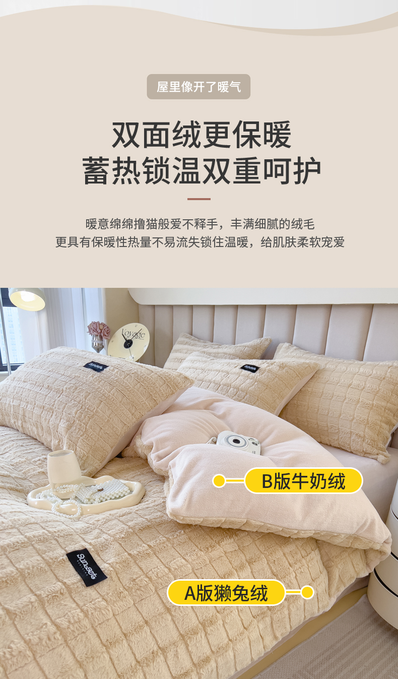 (总)席世家 2025新款婴儿绒简约款四件套,豆粉拼香槟,可可棕,奶油白拼粉,星光蓝,幽山紫