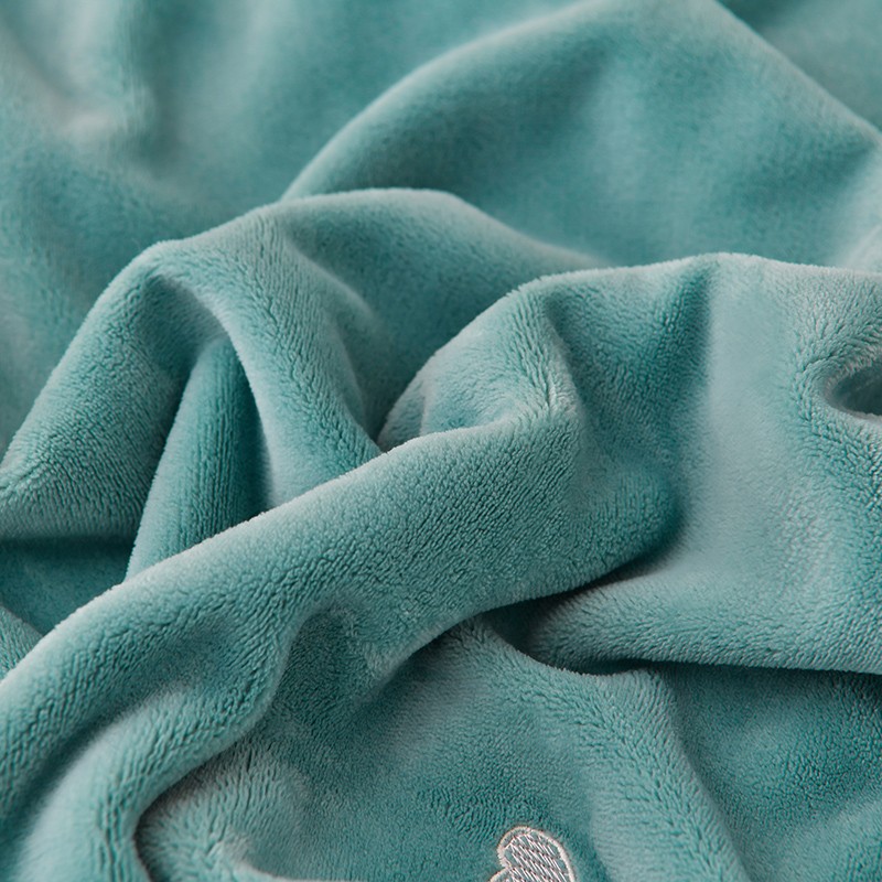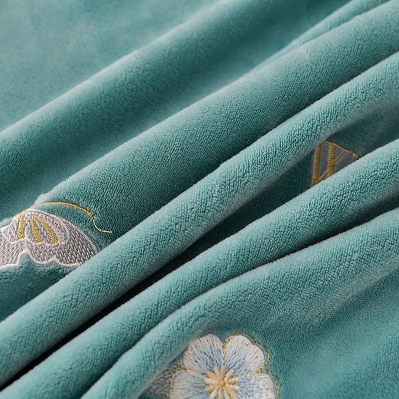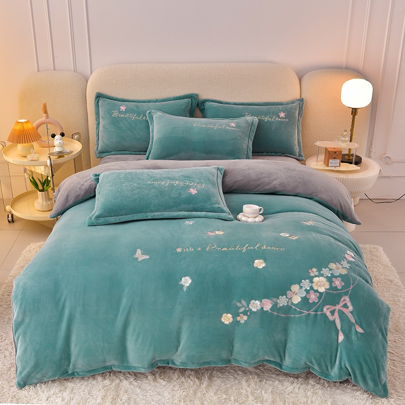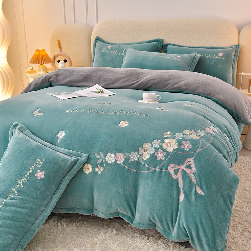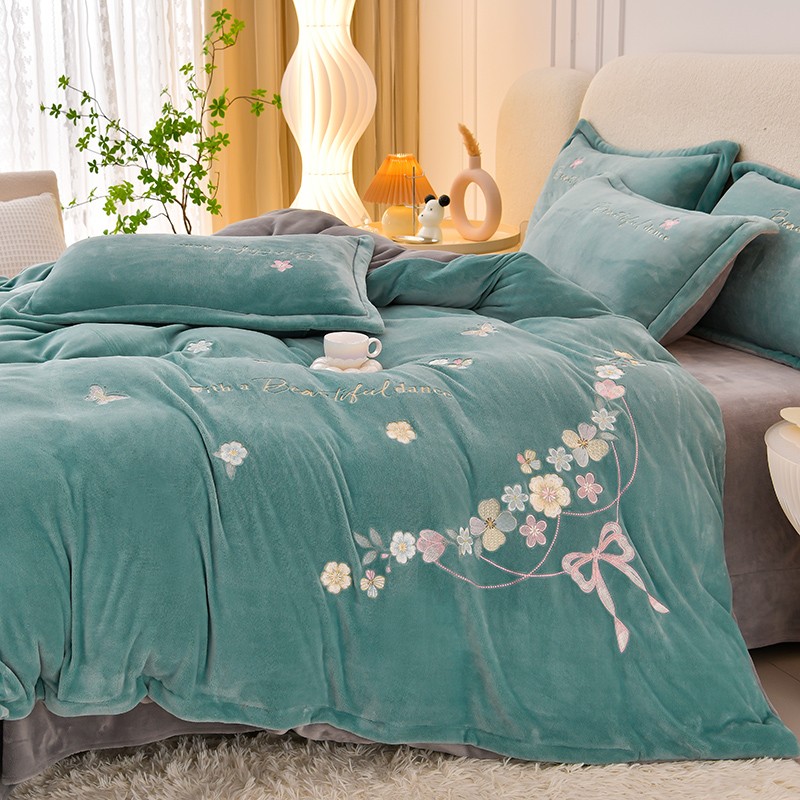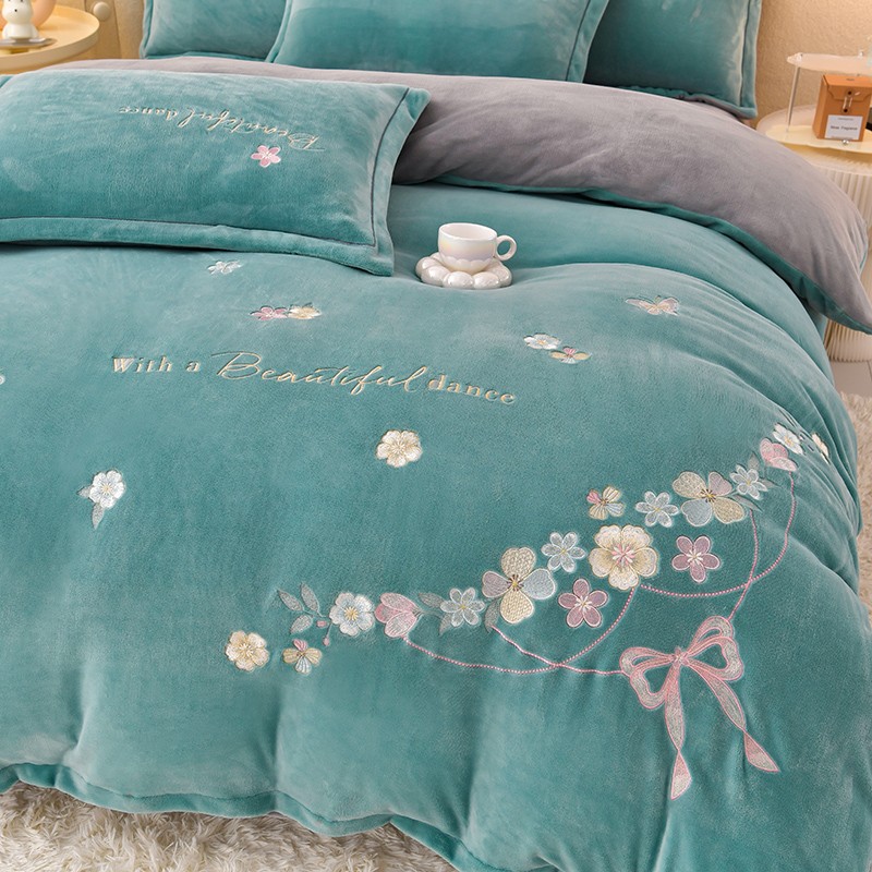 畅畅家纺 2023高克重牛奶绒刺绣花四件套金貂法莱宝宝水晶雪花绒四件套 花海-湖蓝+灰