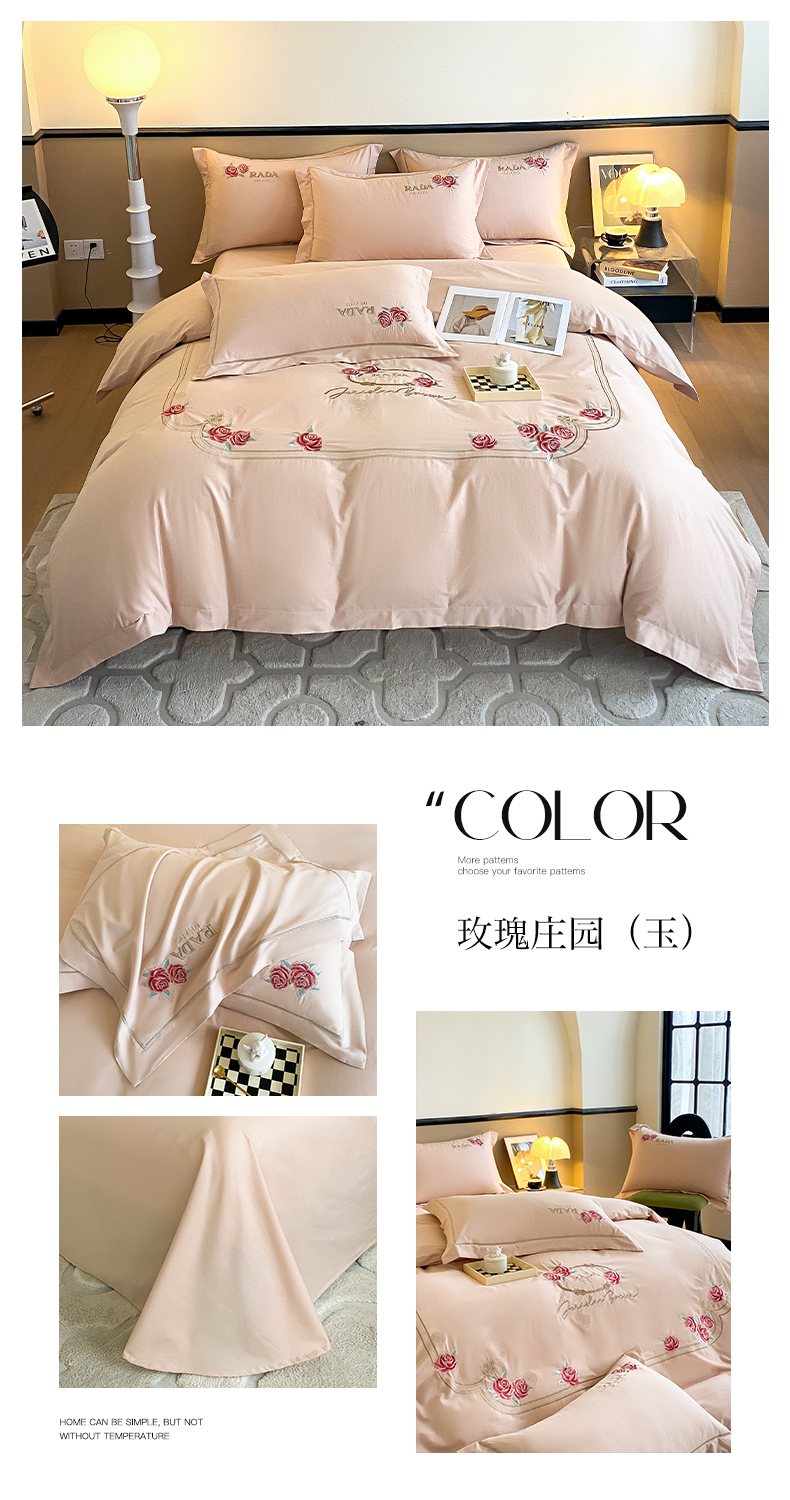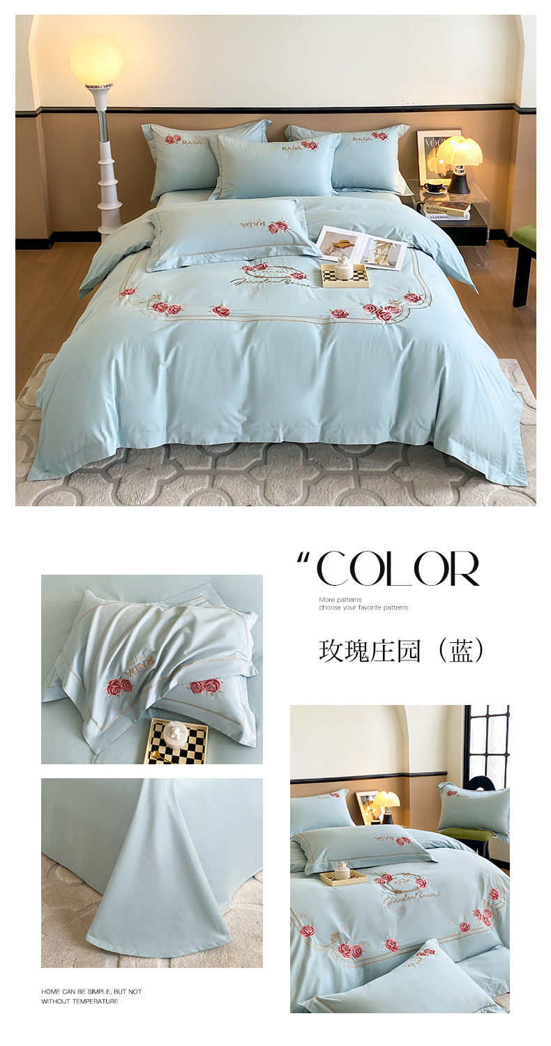 (总)理想家家纺 2025新款纯棉轻奢刺绣四件套--心愿系列场景二,心愿粉,心愿红,心愿黄,心愿蓝