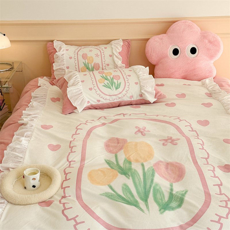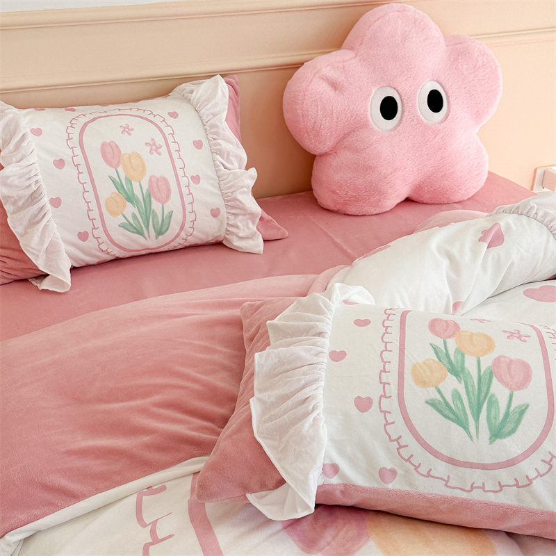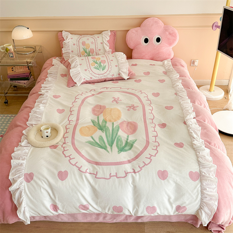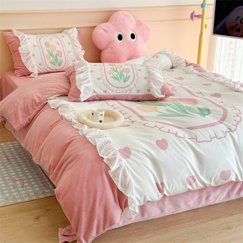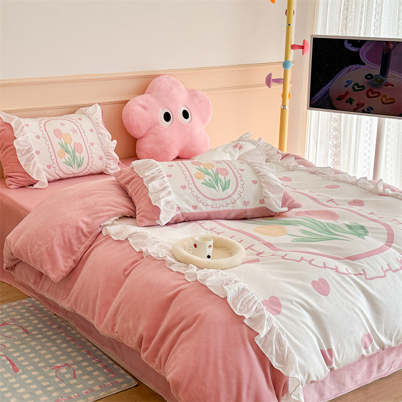 商品名称:昔可家纺 2023新款花边数码宝宝绒四件套 粉爱心郁金香