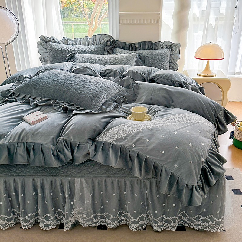 (总)漫布云 2025新款230g高克重韩版立体盘花牛奶蚕丝绒绣花四件套床裙款被套-洛丽塔系列,洛丽塔-嫩黄 ,洛丽塔-香芋紫 , 洛丽塔-珍珠粉,洛丽塔-婴儿蓝