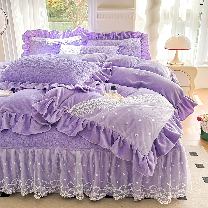 漫布云2025秋冬新款11斤230g全消光牛奶绒夹棉床盖款四件套纯色蕾丝花边刺绣床裙款床盖,蝶恋花-梦幻紫, 蝶恋花-嫩黄, 蝶恋花-新芽绿 ,蝶恋花-婴儿蓝 ,蝶恋花-樱花粉