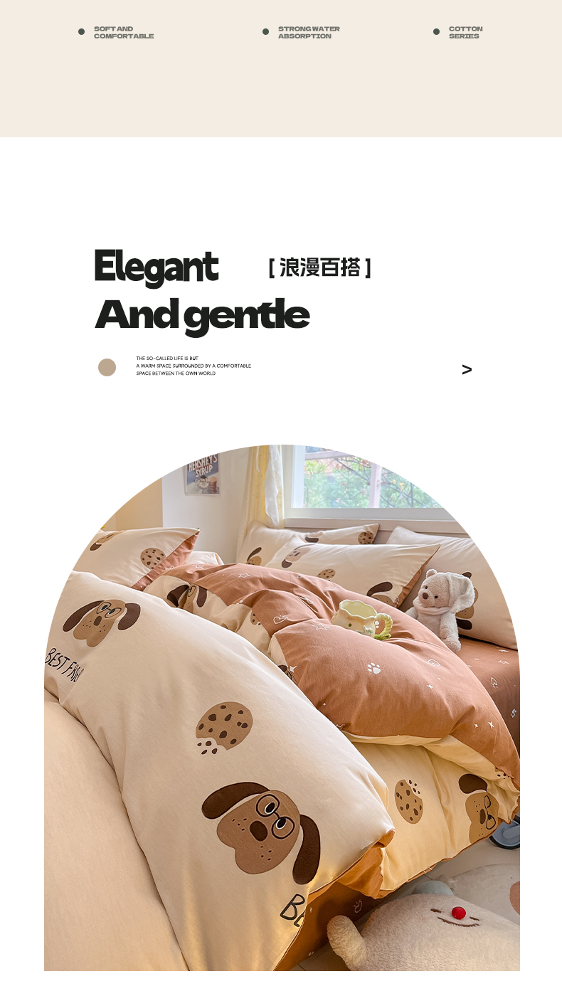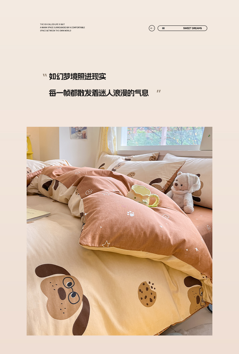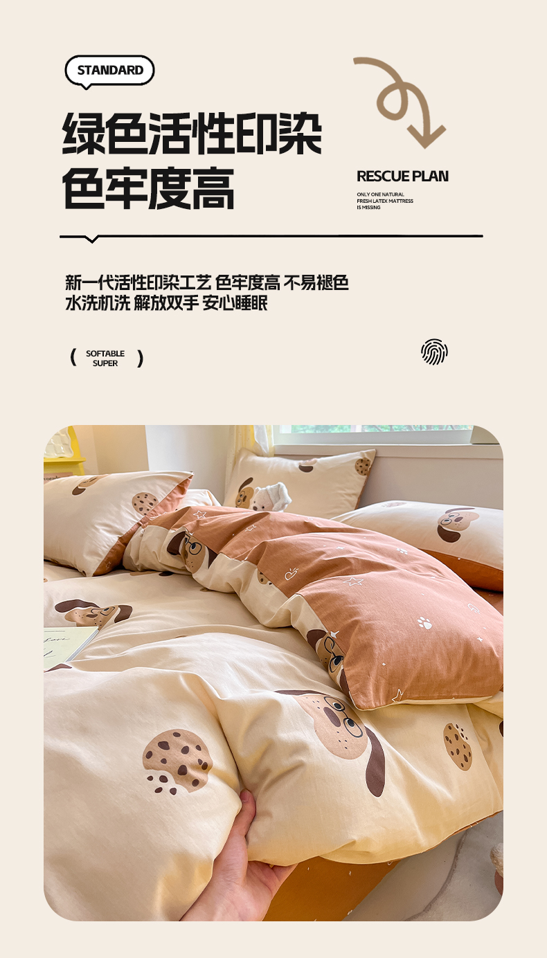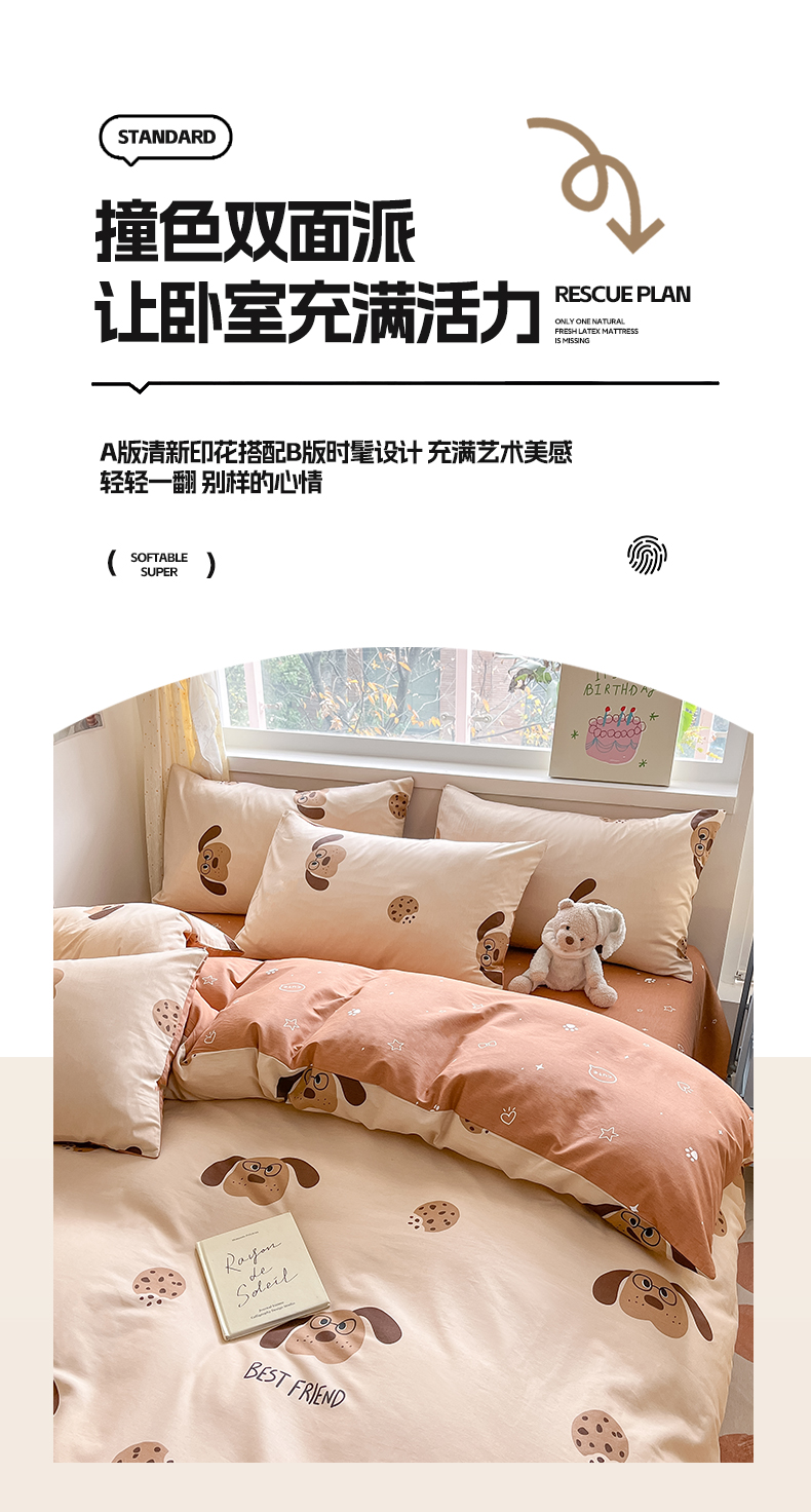 雅居纺 2024新款高密全棉13070印花四件套 曲奇小狗
