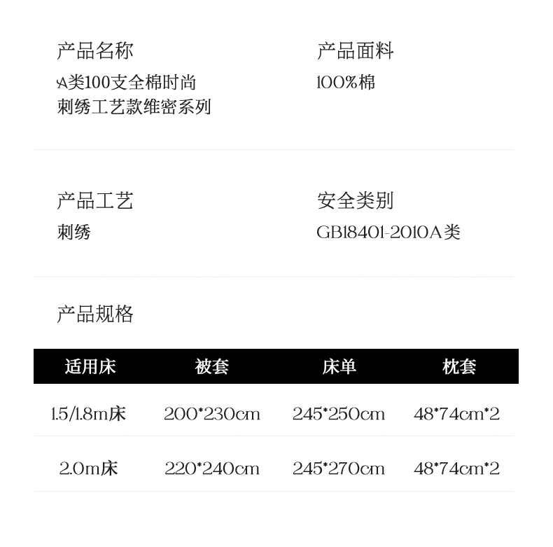 商品名称:蓝米卡夫 2024新品A类100支全棉高端时尚刺绣工艺款维密系列 维密-香槟白