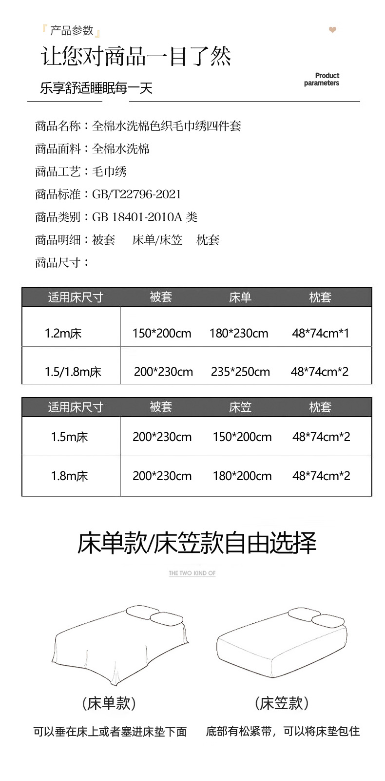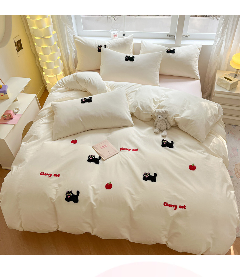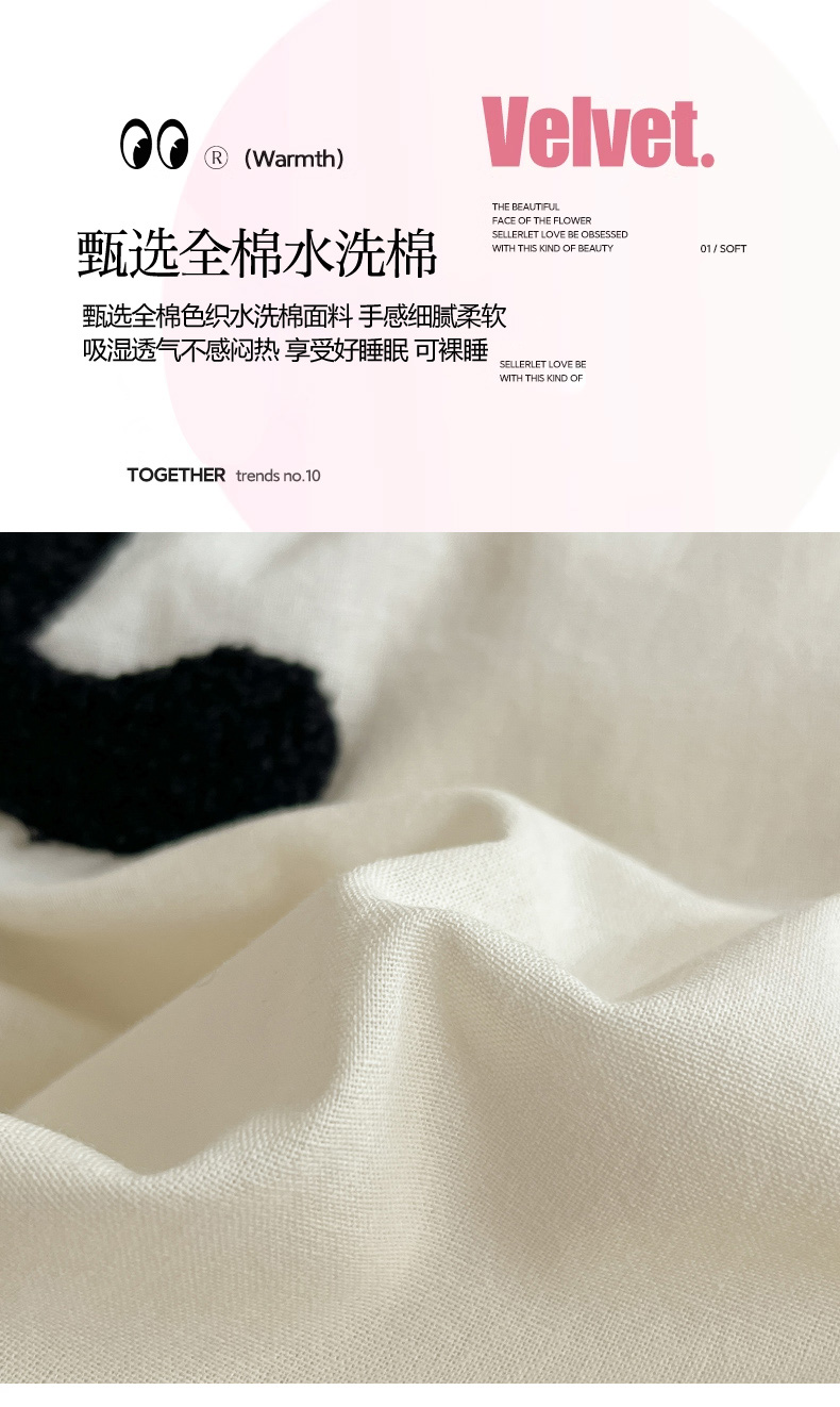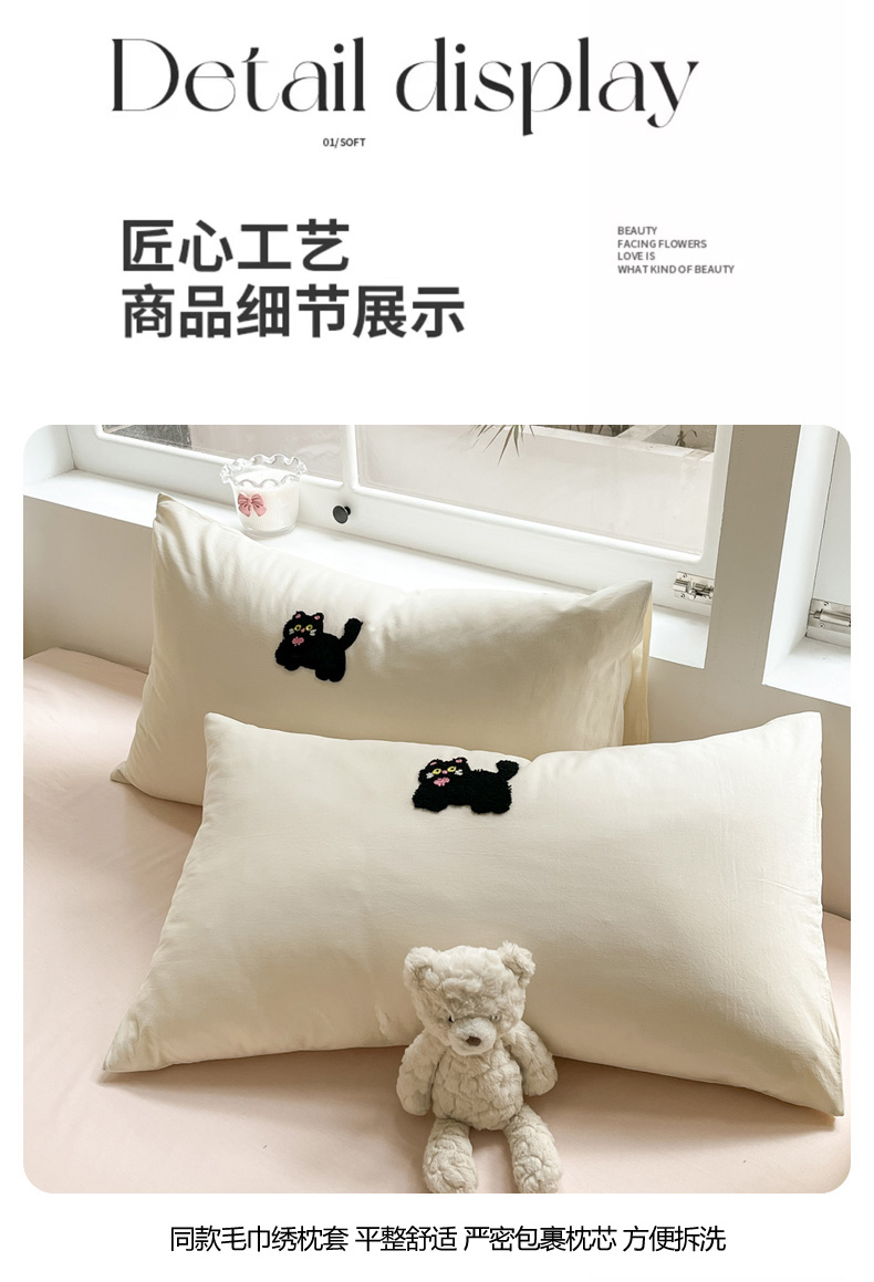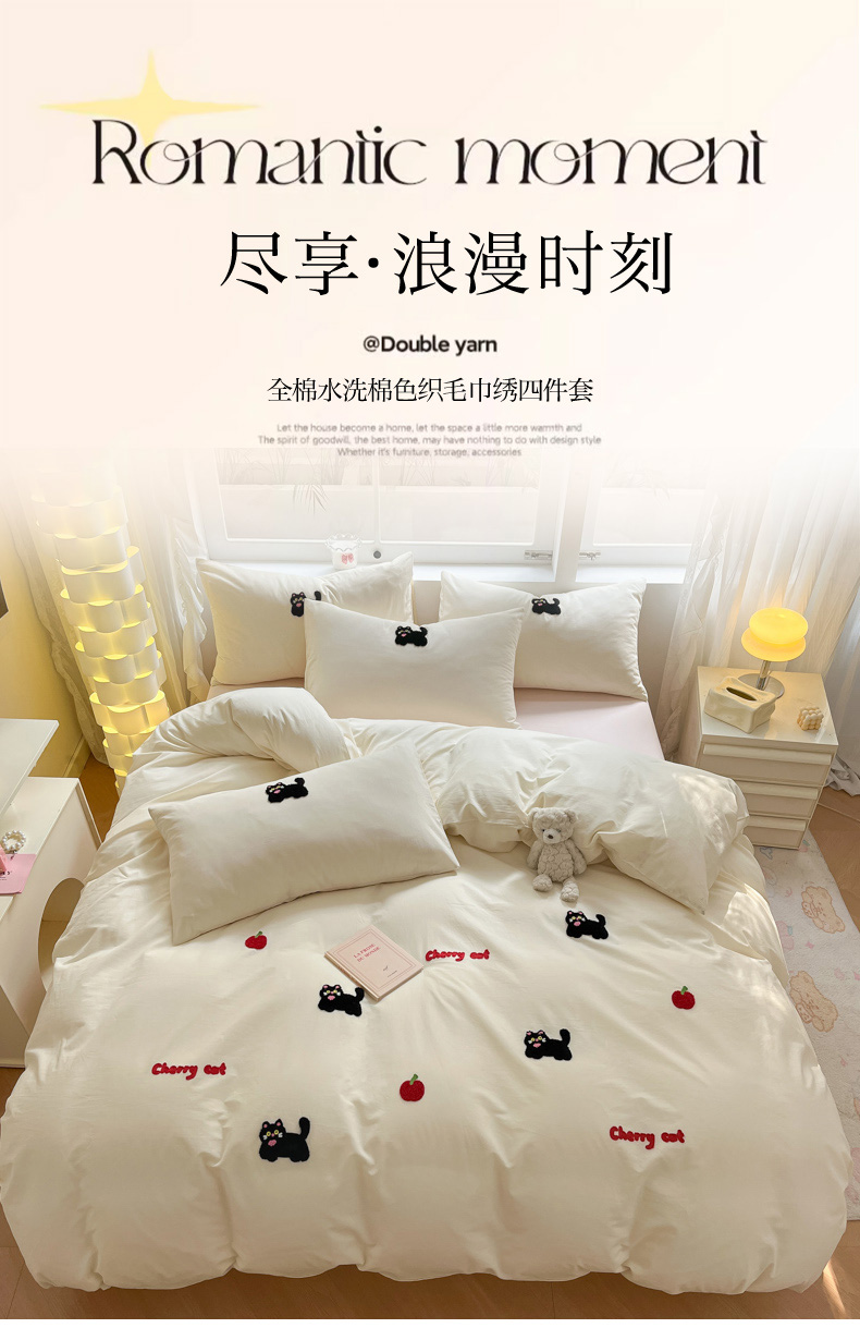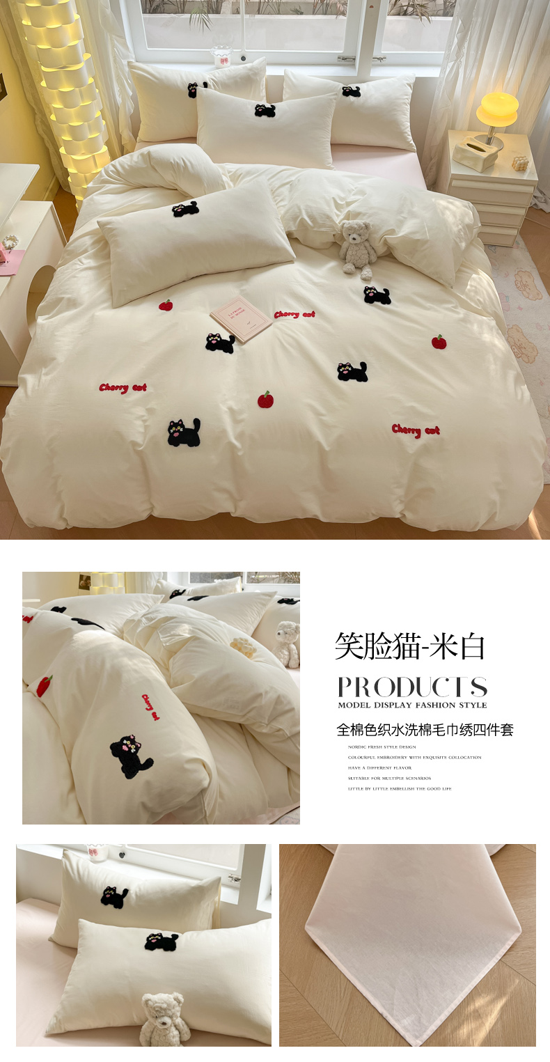 商品名称:寐居家纺 2024新款全棉水洗棉毛巾绣色织四件套 笑脸猫-米白