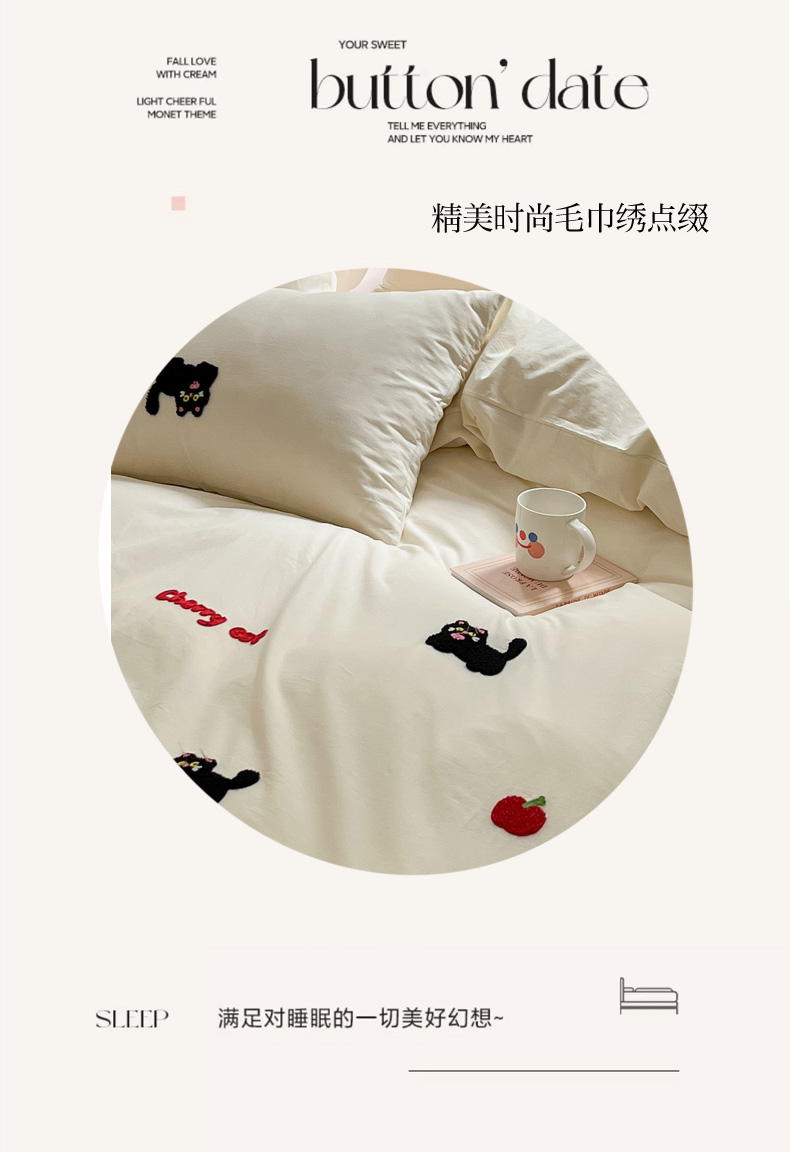 寐居家纺 2024新款全棉水洗棉毛巾绣色织四件套 笑脸猫-米白