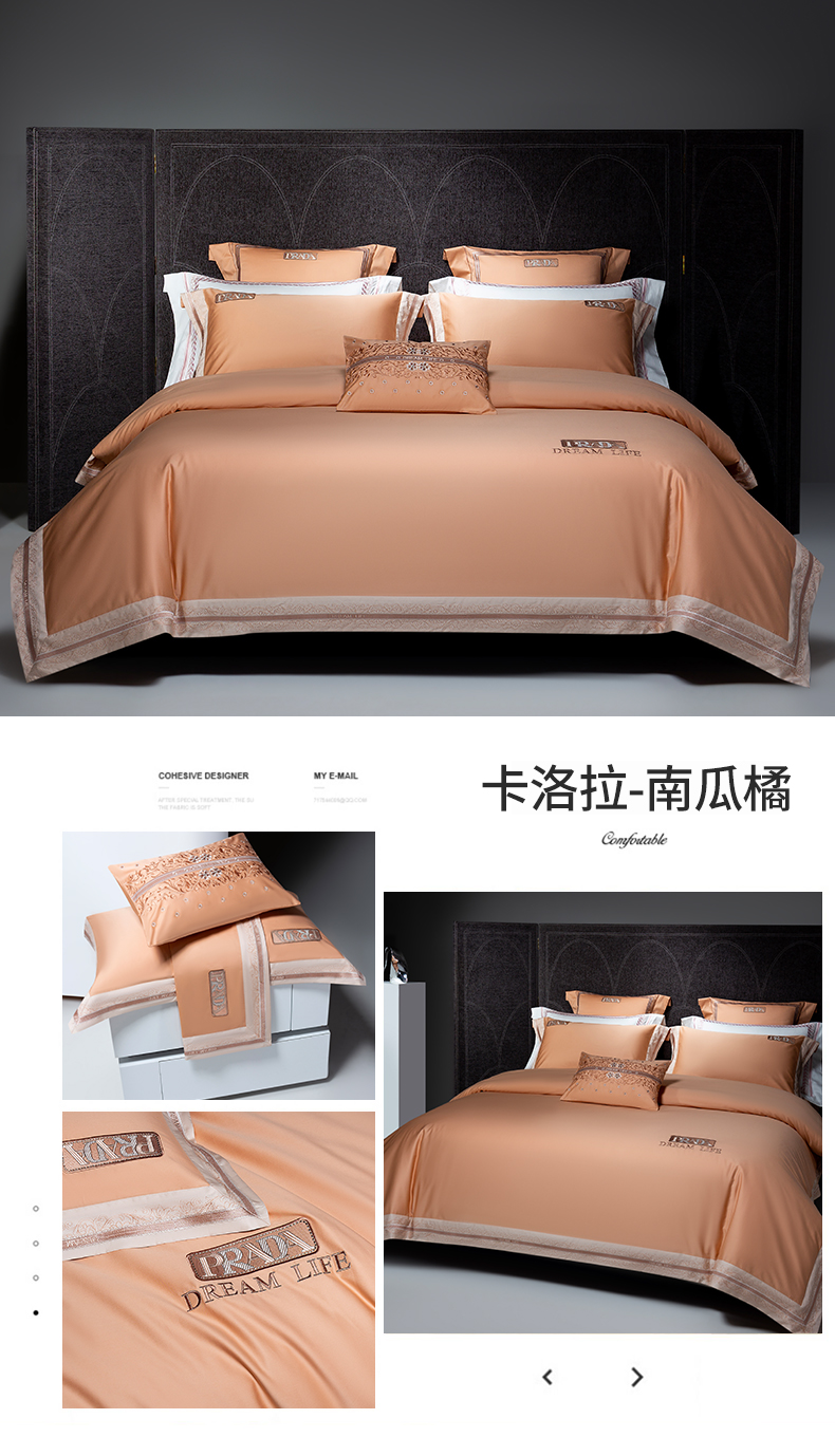 商品名称:高大尚婚庆馆 2025春夏新品长绒棉高端绣花四件套-卡洛拉 卡洛拉-南瓜橘