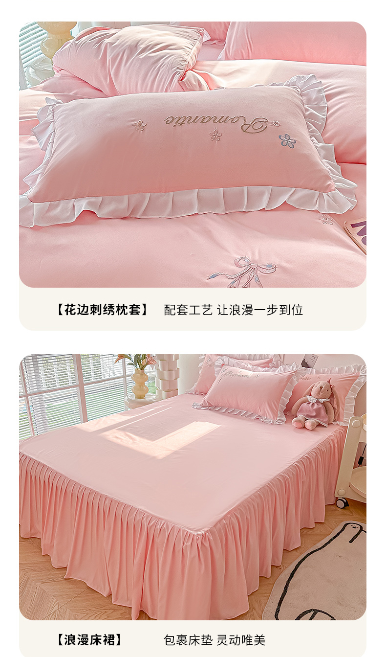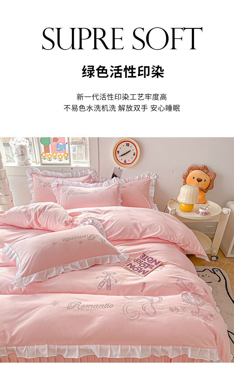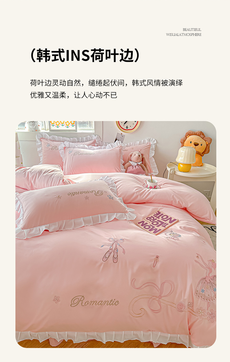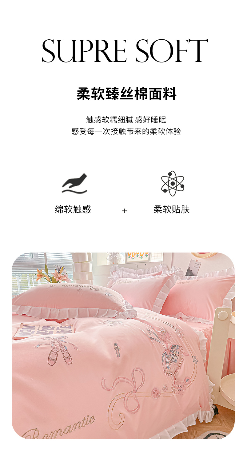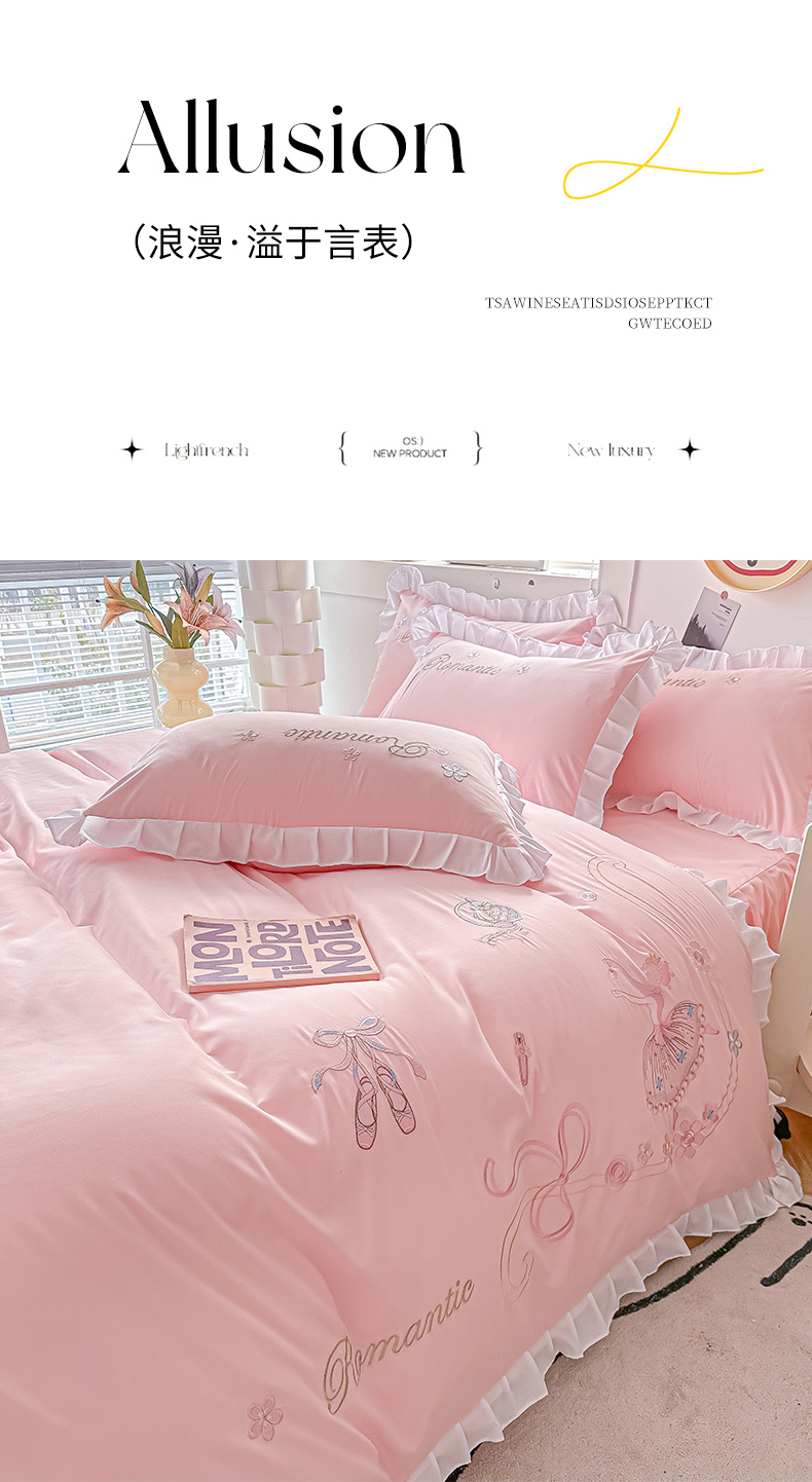 当前位置: 91家纺网 > 商品网购 > 床品套件 > 四件套 > 化纤活性四件套 > 包小包 2024新款芭蕾女孩系列精密刺绣花边韩版四件套四季款爆款(提供买家秀) 芭蕾女孩-浅粉