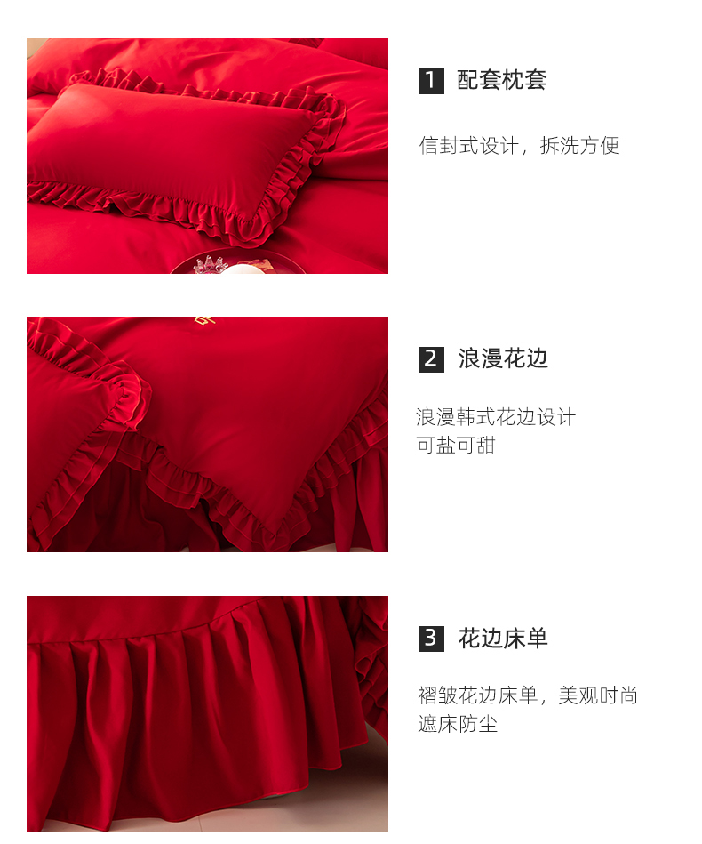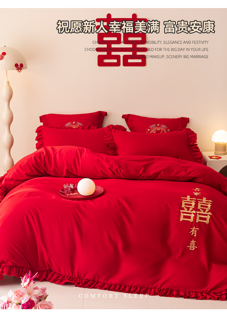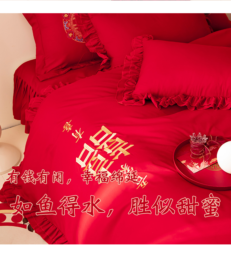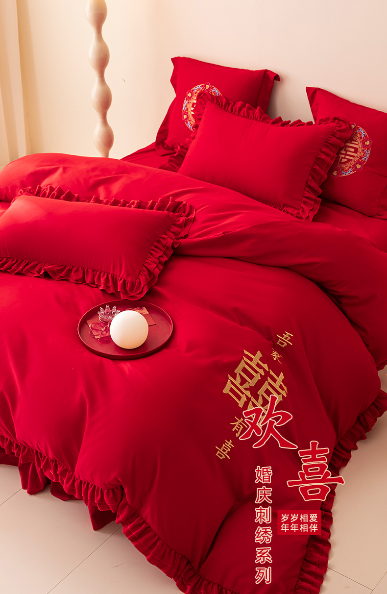 当前位置: 91家纺网 > 商品网购 > 床品套件 > 四件套 > 婚庆四件套 > 玉雅家纺 2025新款磨毛时尚花边款床裙婚庆四件套 花边款-双喜