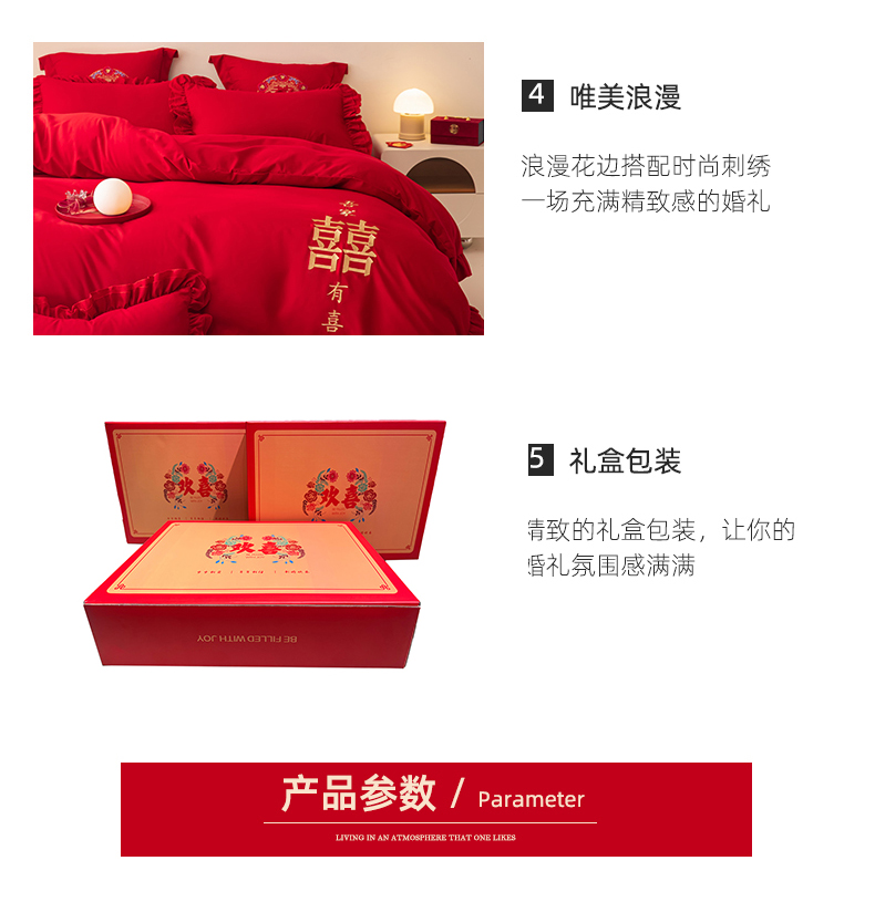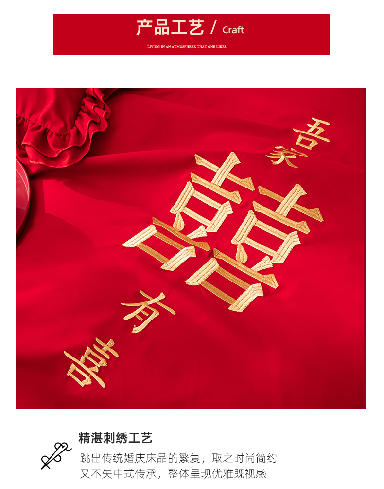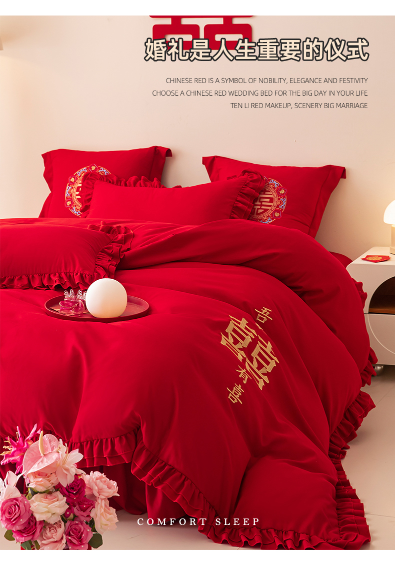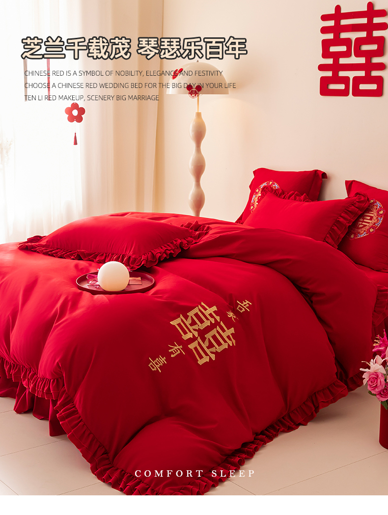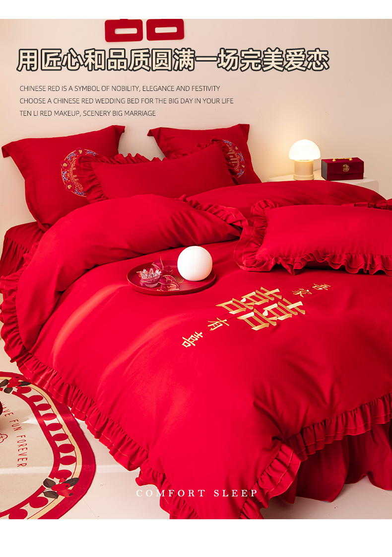 当前位置: 91家纺网 > 商品网购 > 床品套件 > 四件套 > 婚庆四件套 > 玉雅家纺 2025新款磨毛时尚花边款床裙婚庆四件套 花边款-双喜