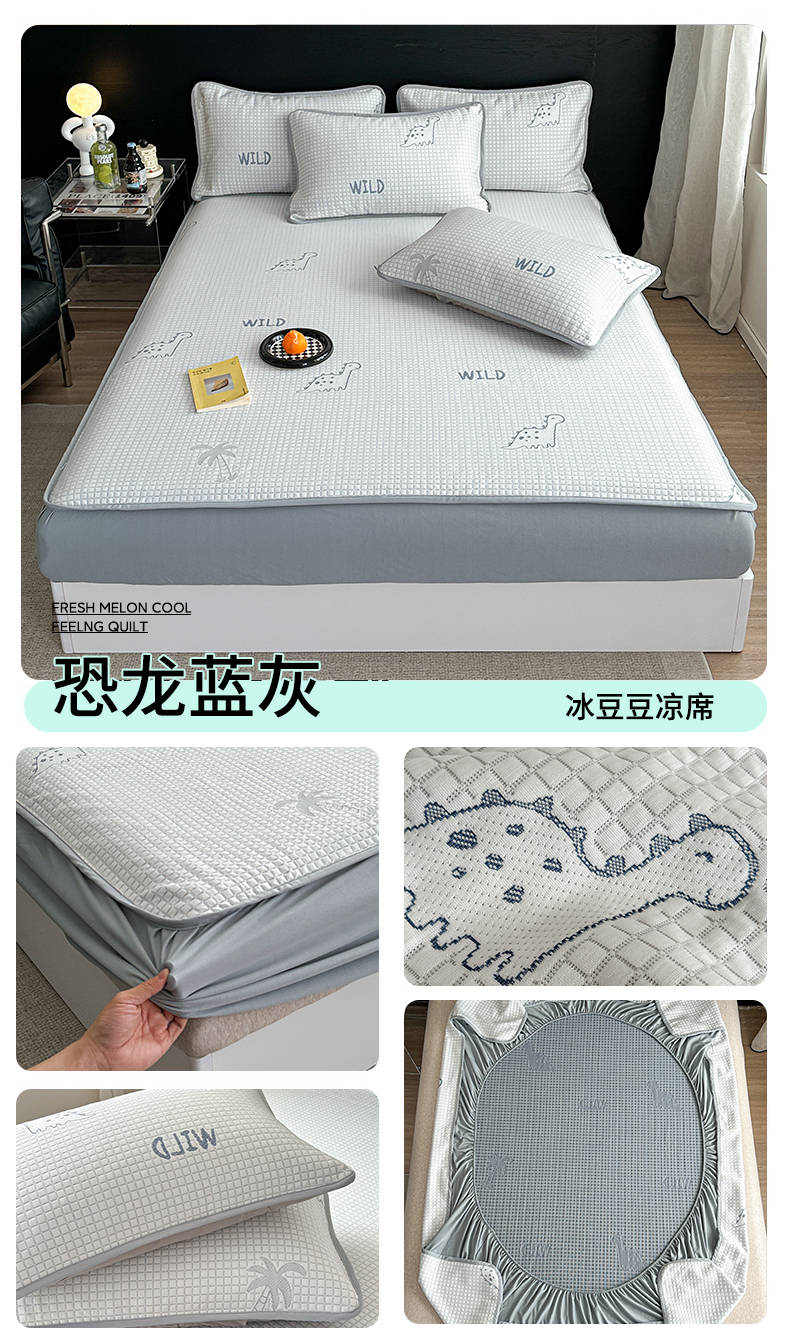 2024 新款A类立体提花冰豆豆凉感抗菌凉席床笠款 恐龙蓝灰