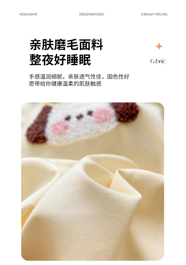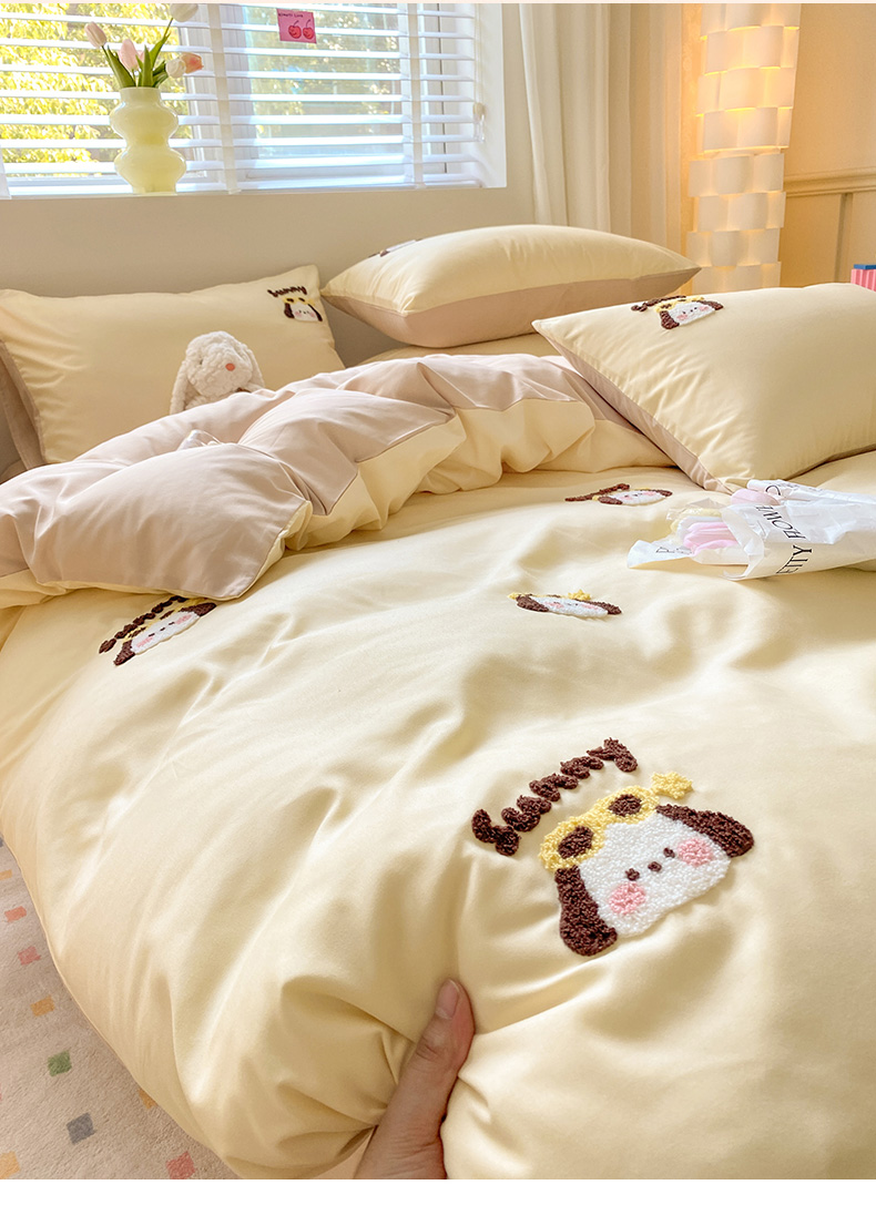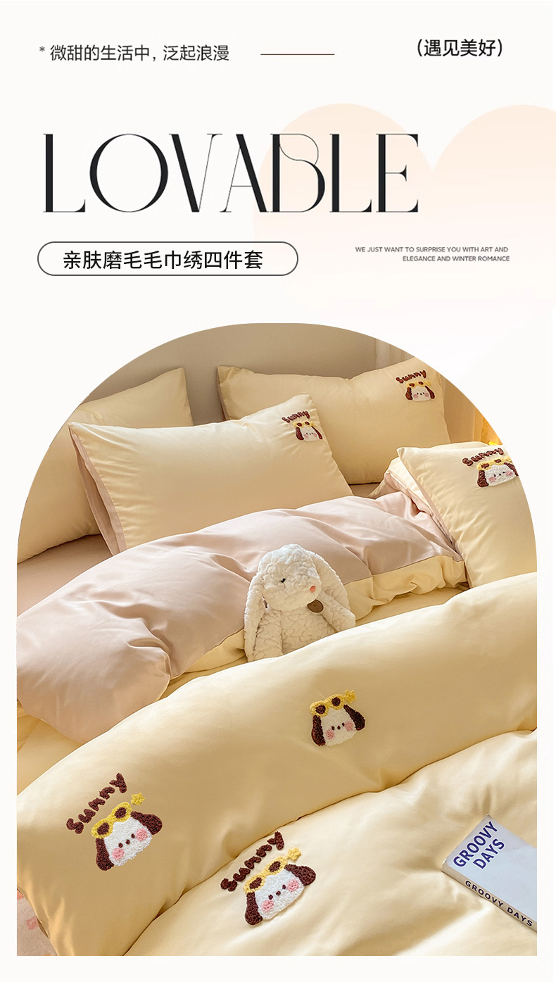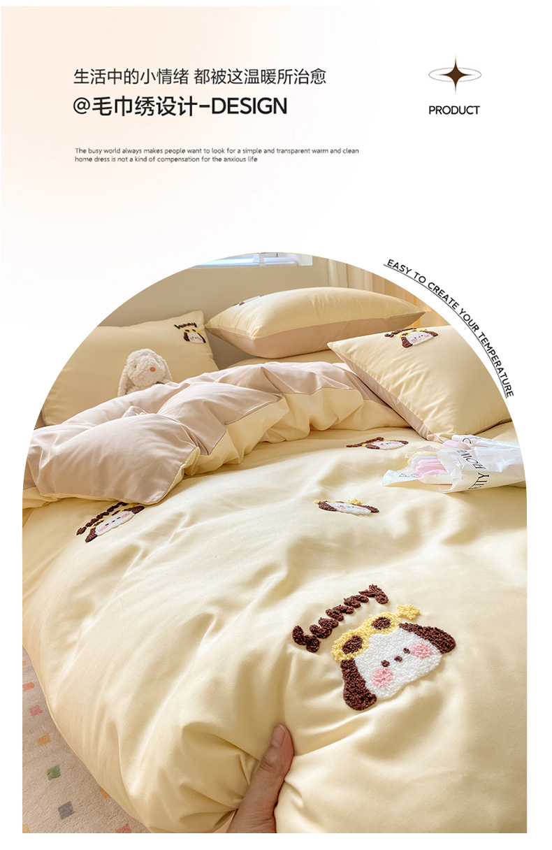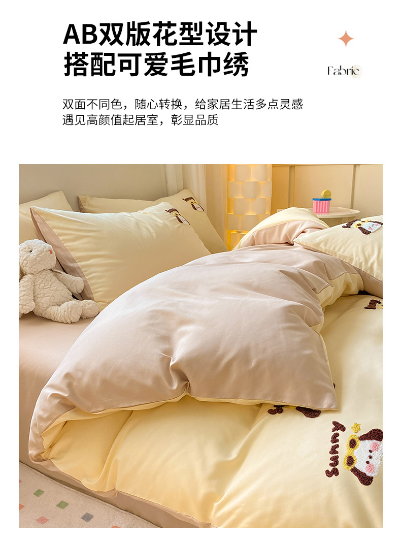 当前位置: 91家纺网 > 商品网购 > 床品套件 > 四件套 > 毛巾绣四件套 > 眠帛 2024新款亲肤棉卡通毛巾绣四件套 帕恰-奶黄奶茶
