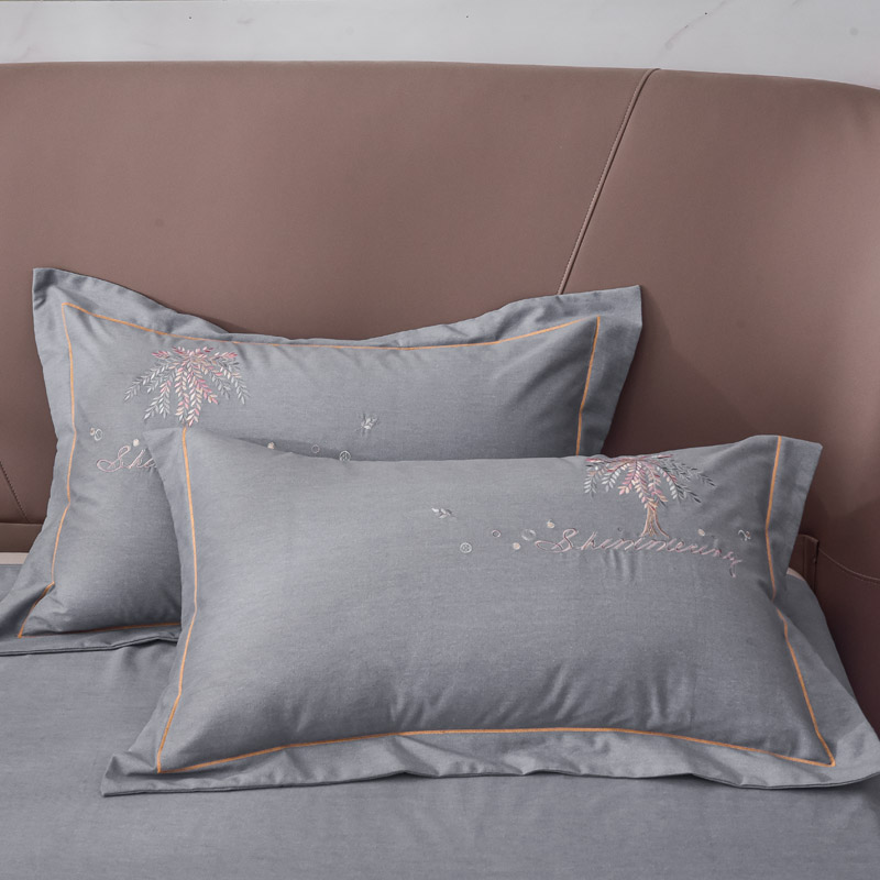 艾迪尚家纺 2025新款纯色生态磨毛绣花单枕套 幸福树-浅灰