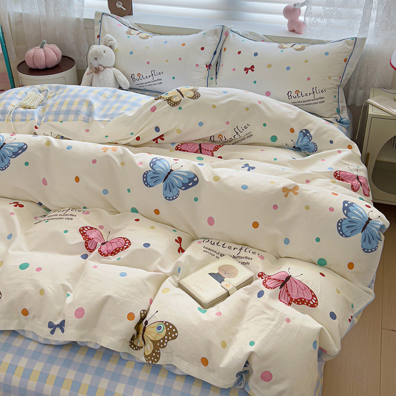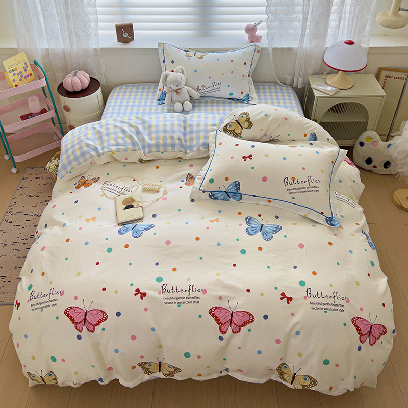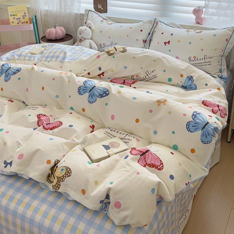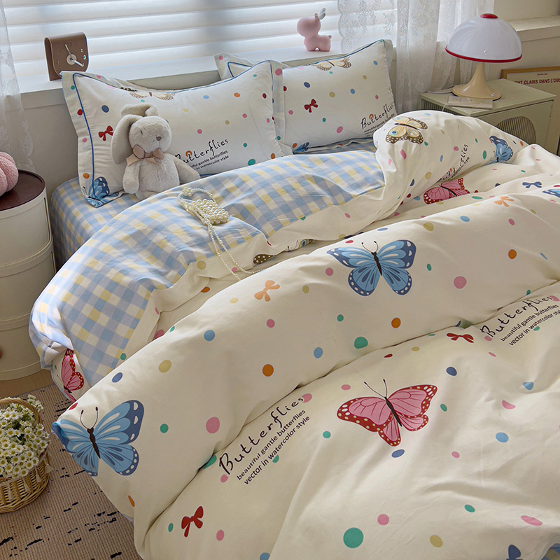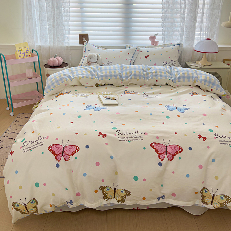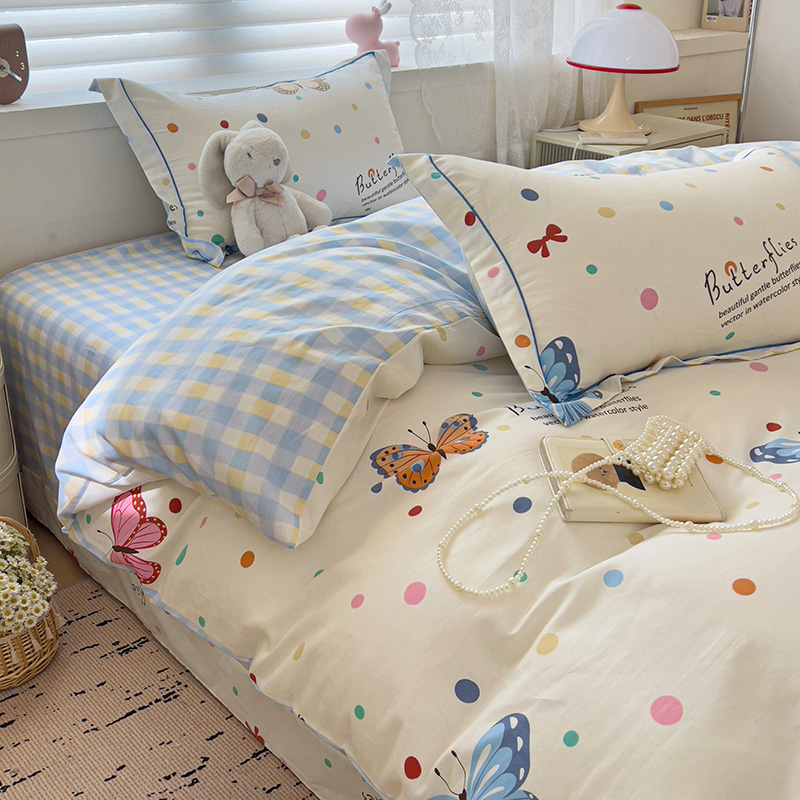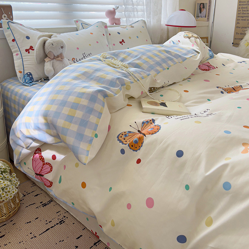 商品名称:乐童 2024新款直播爆款13070纯棉印花吊边款一字绣四件套-第七波 彩色蝴蝶