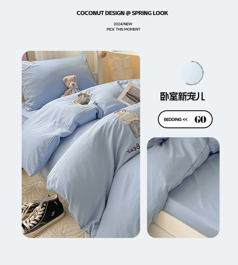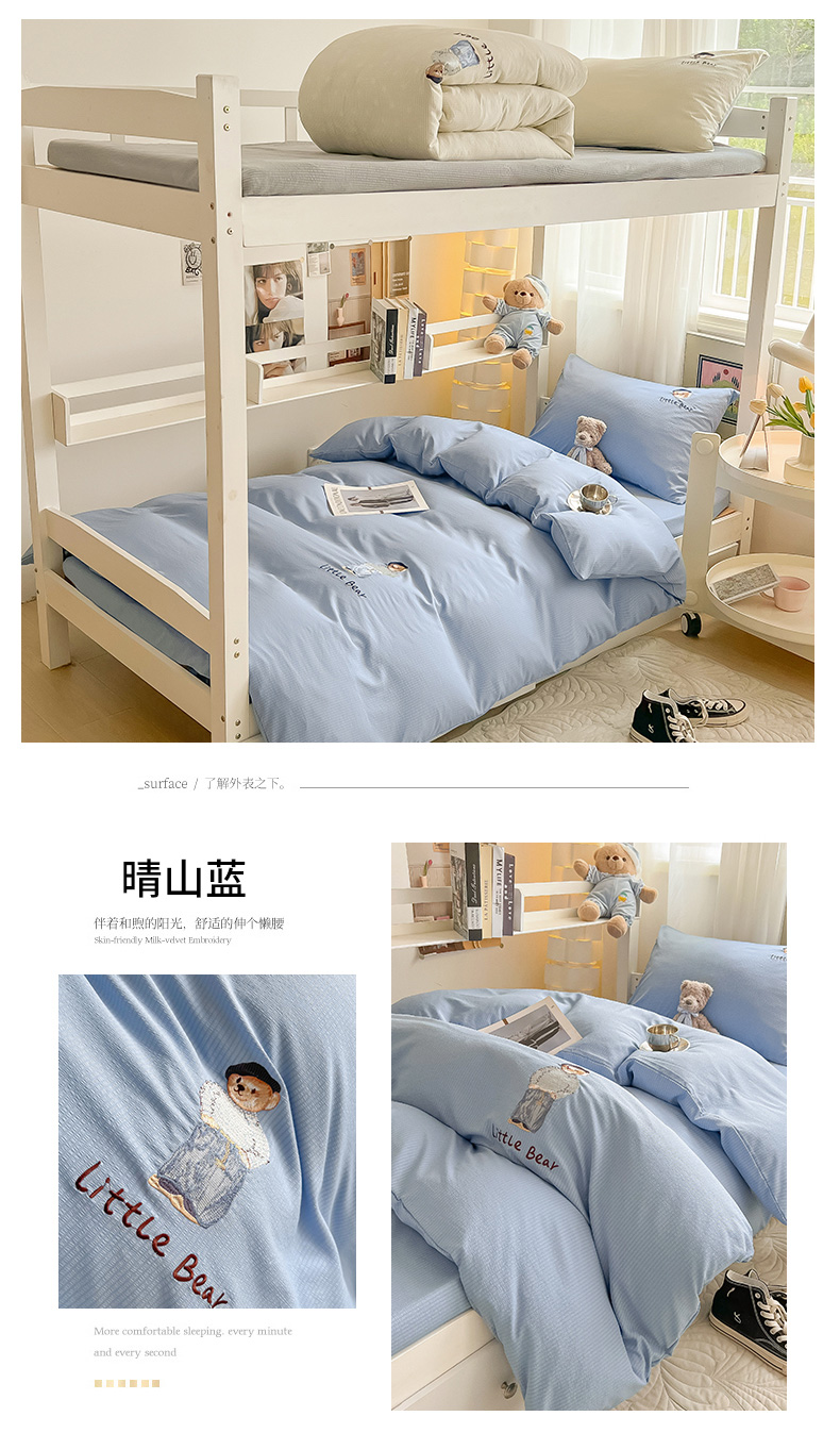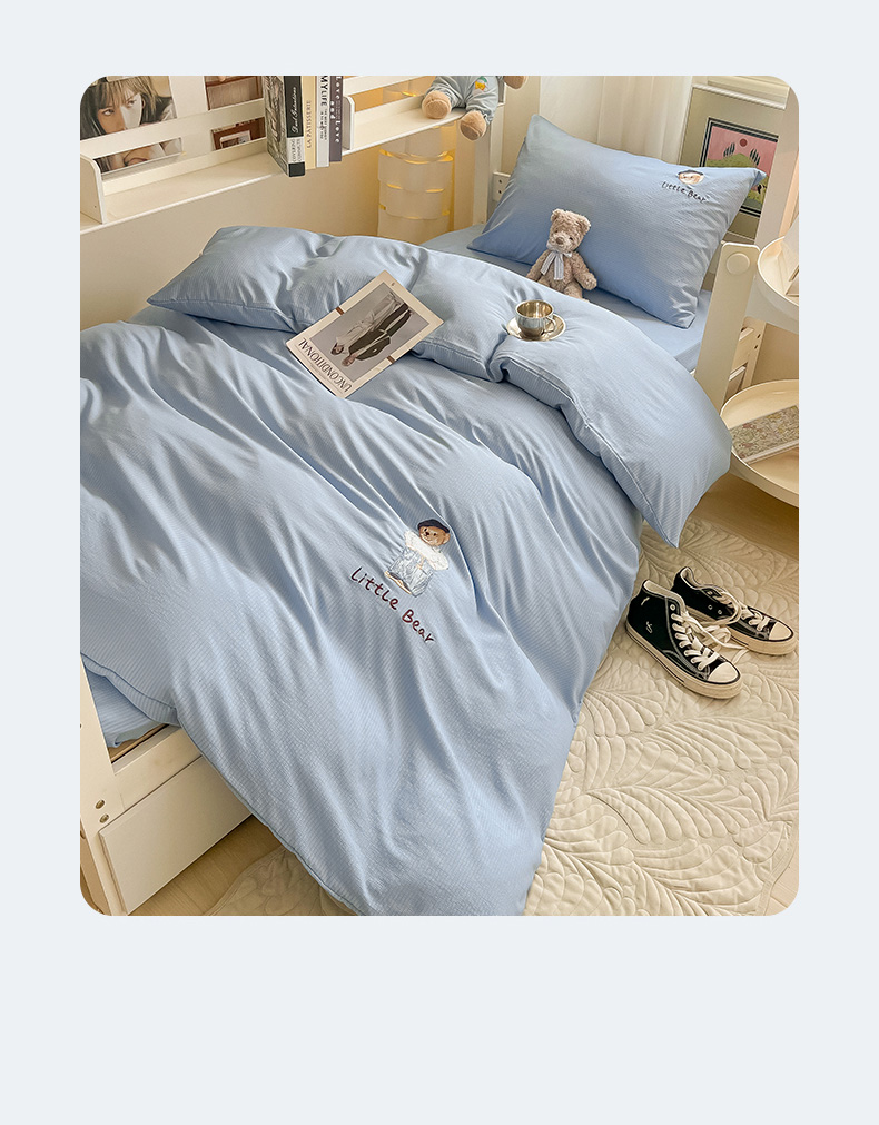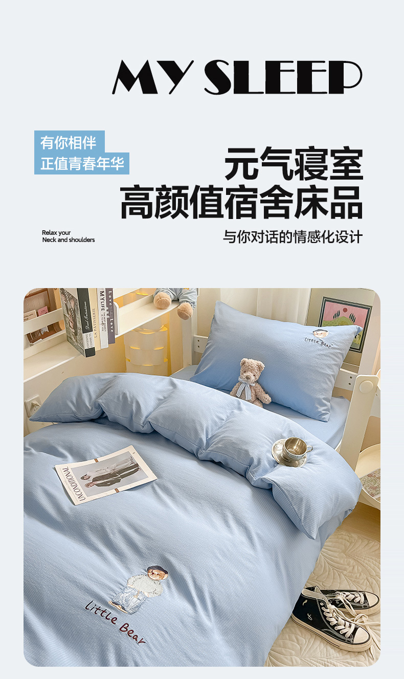 当前位置: 91家纺网 > 商品网购 > 床品套件 > 四件套 > 水洗棉四件套 > 眠帛家居 2024新款宿舍三件套水洗棉提花刺绣四件套熊先生 晴山蓝