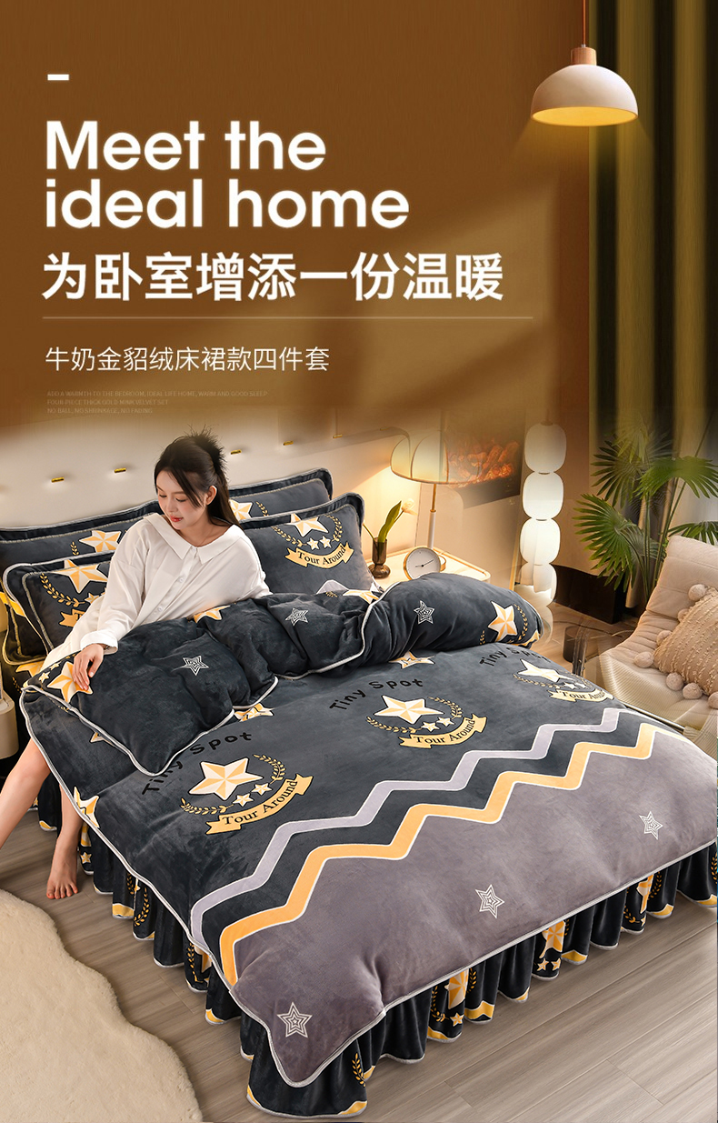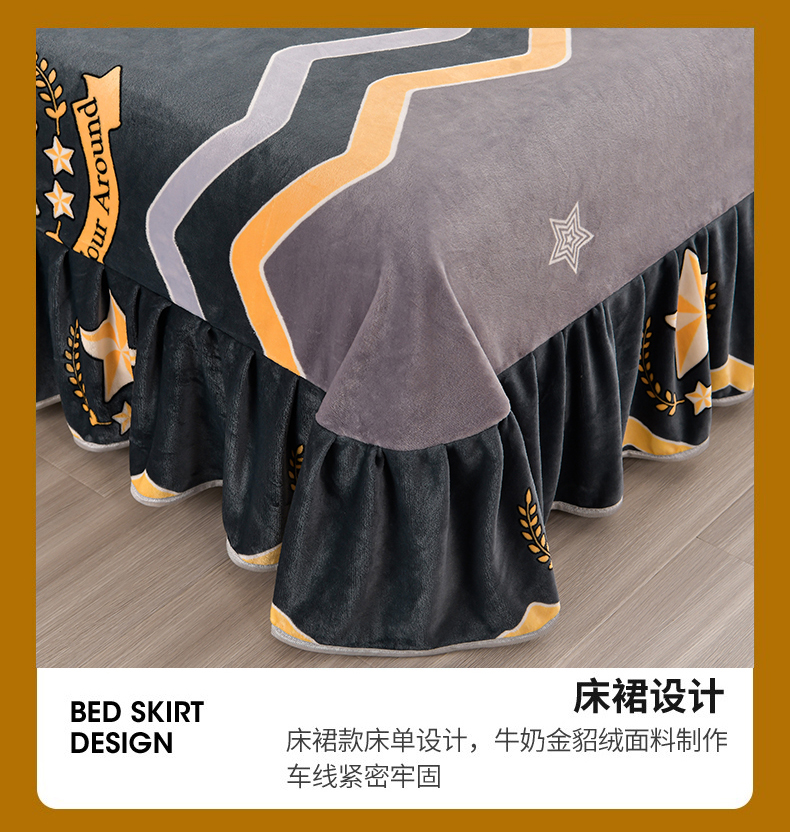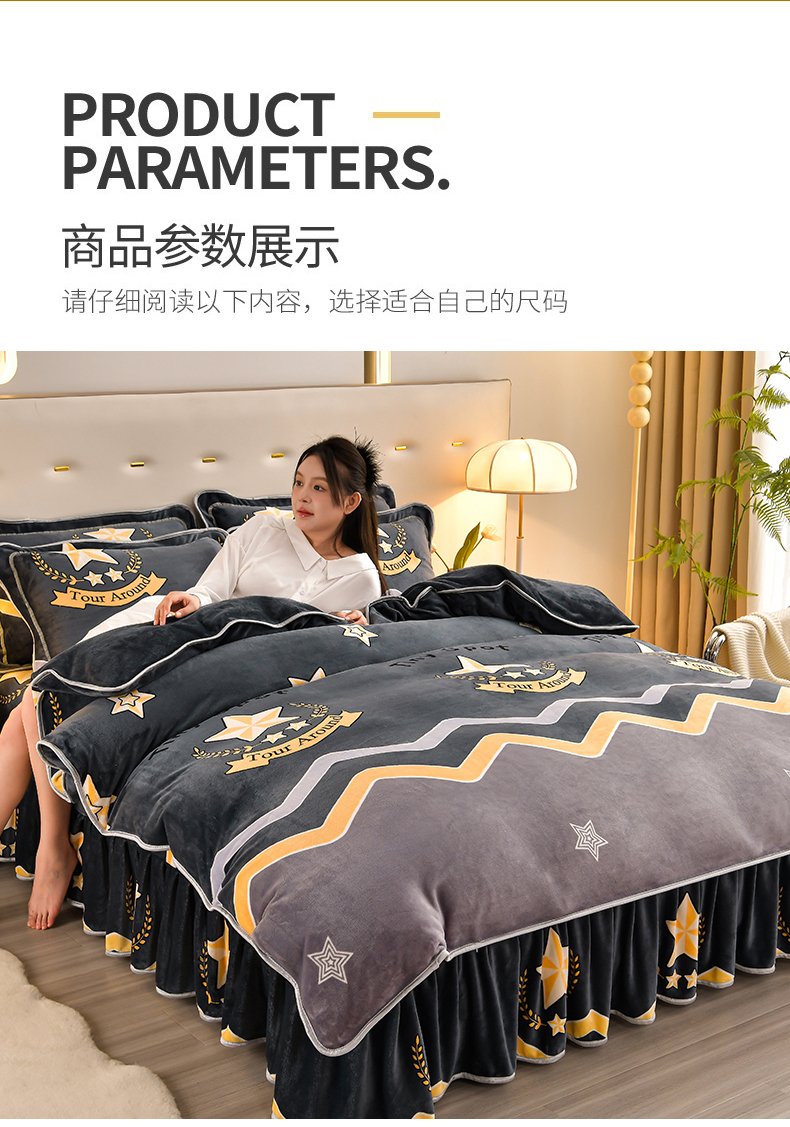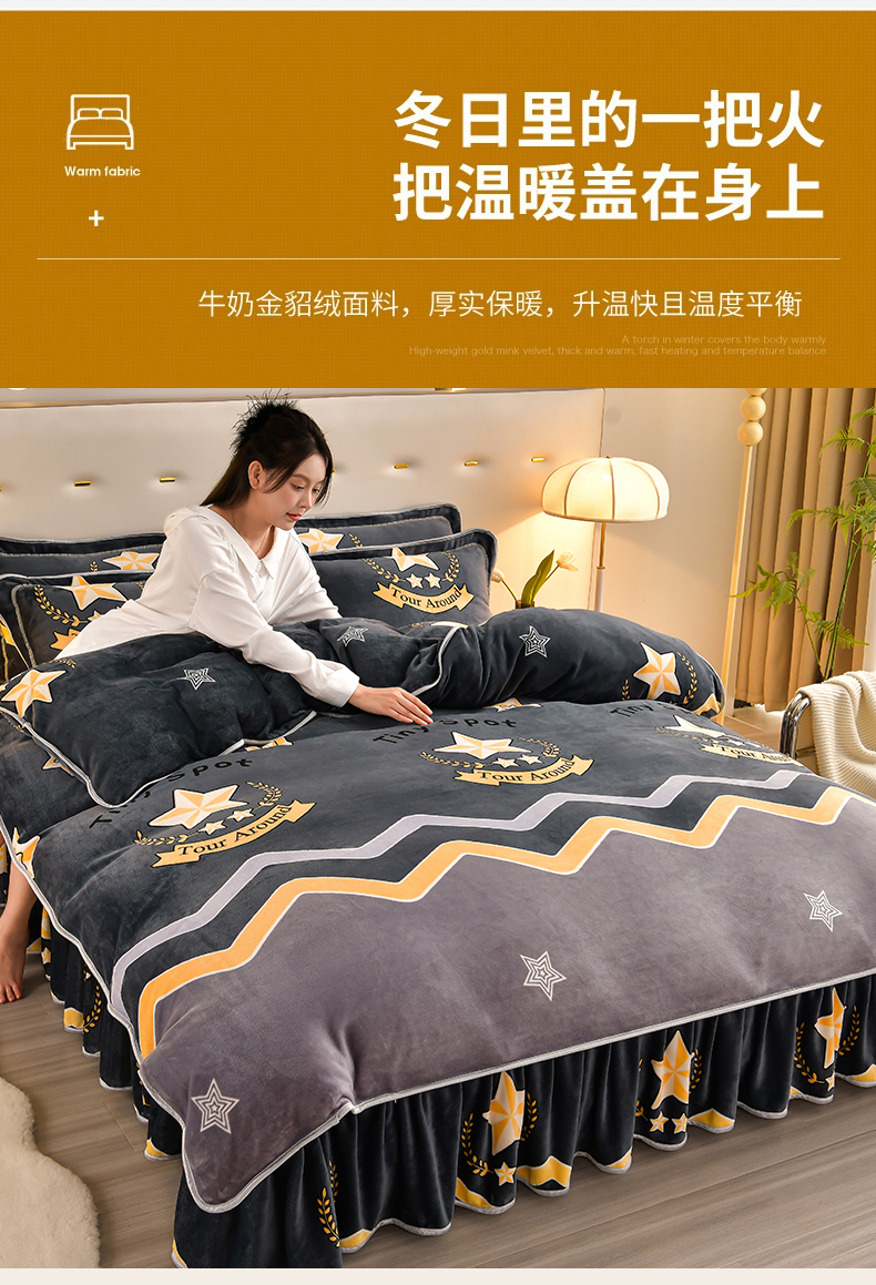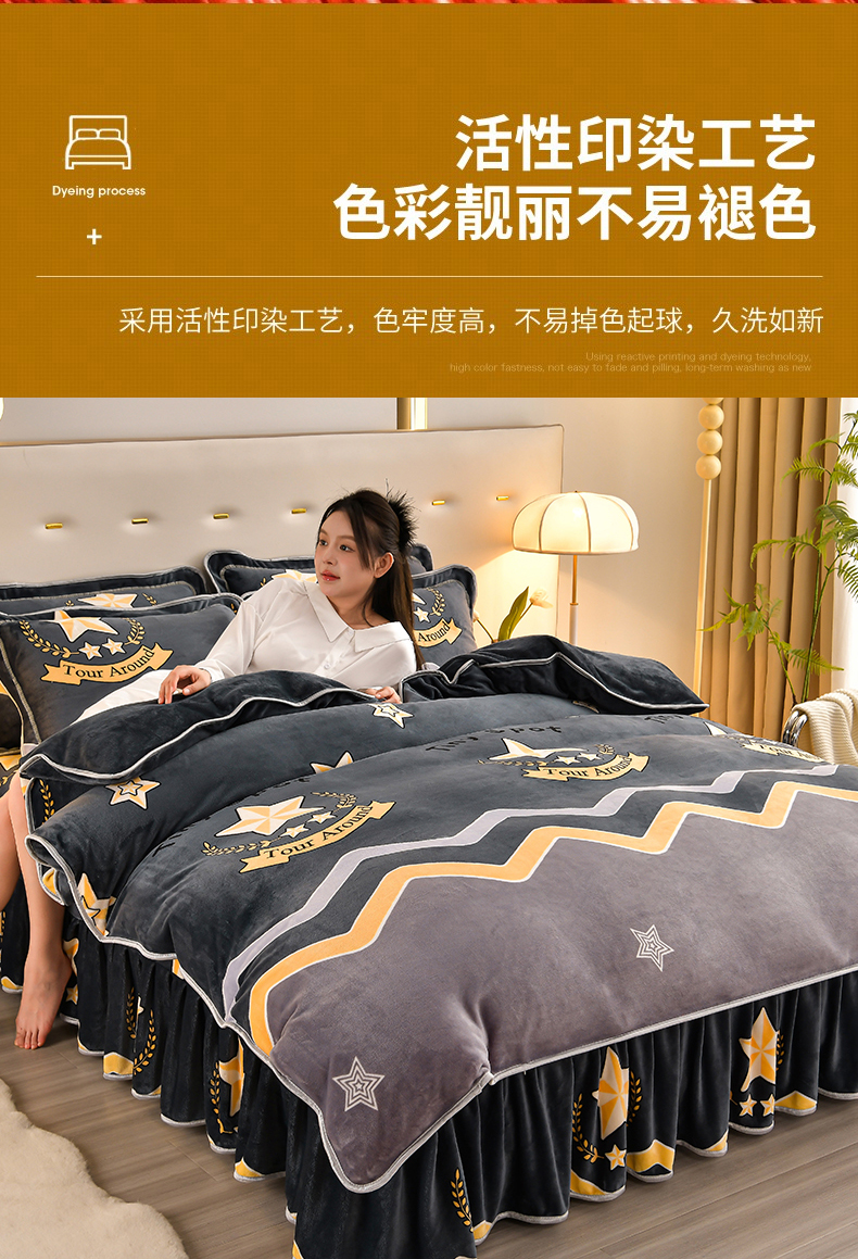 商品名称:馨梦缘 2025新款小包边款牛奶绒8.5斤高克重牛奶绒金雕绒床裙款四件套 明日之星