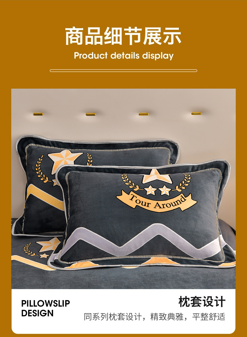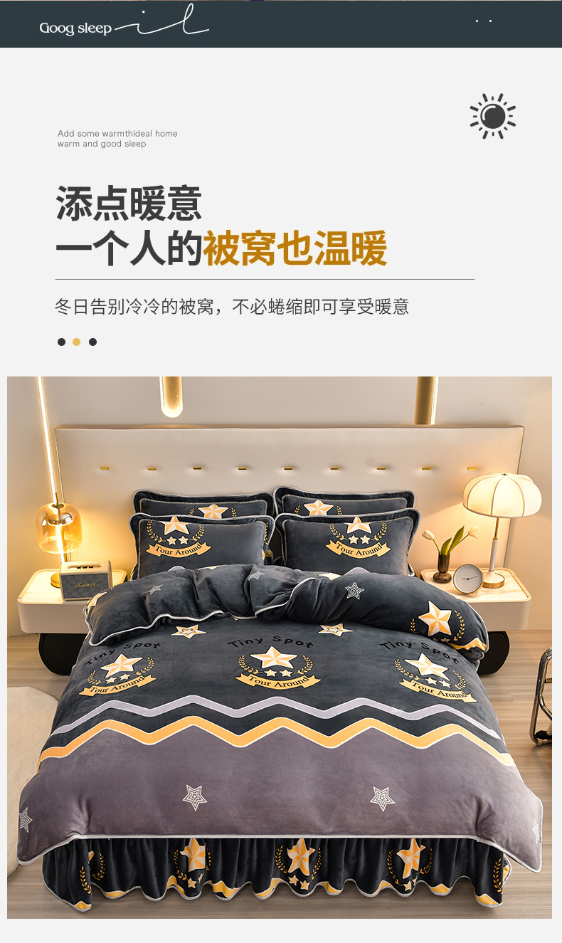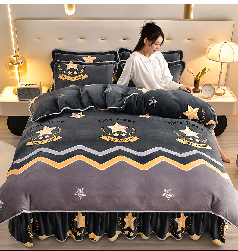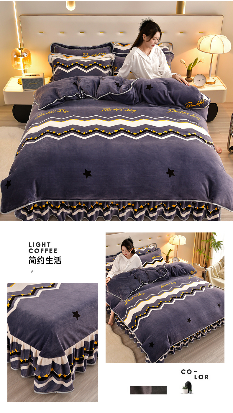 商品名称:馨梦缘 2025新款小包边款牛奶绒8.5斤高克重牛奶绒金雕绒床裙款四件套 明日之星