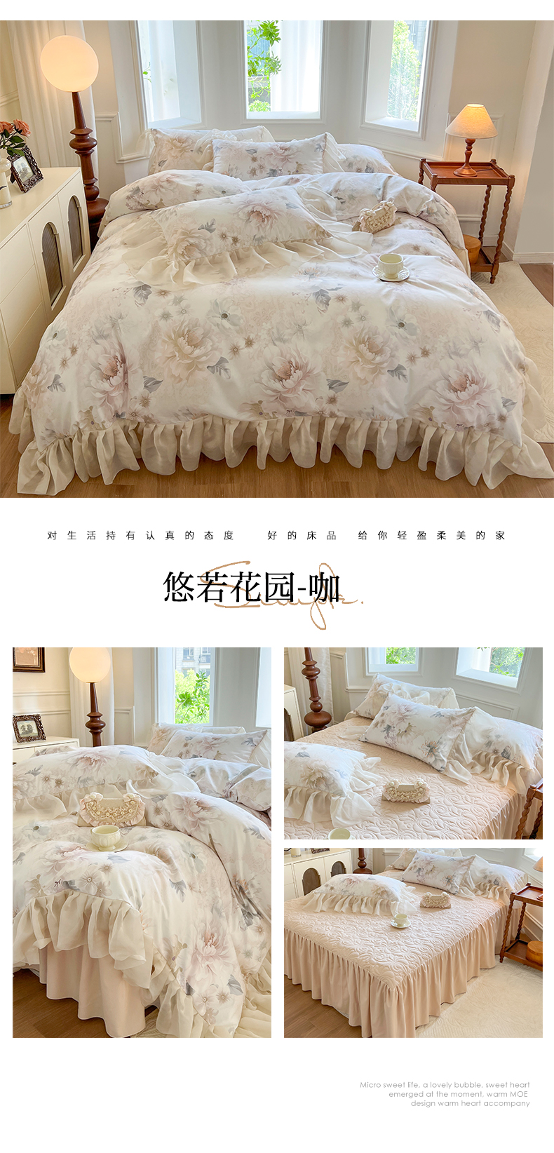 商品名称:网红馆(ck家纺)2025新款鹿锦棉印花床裙四件套 悠若花园-咖