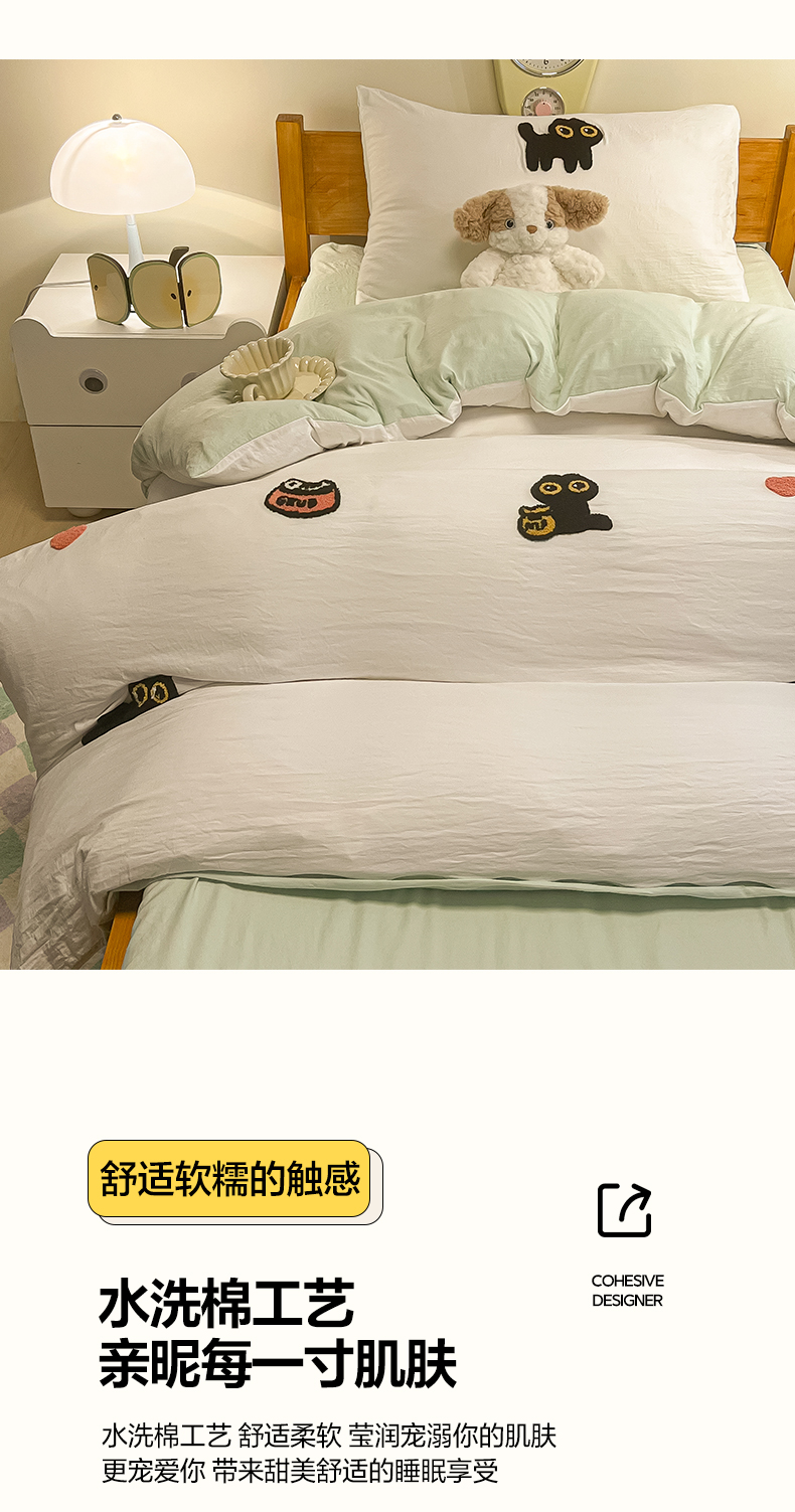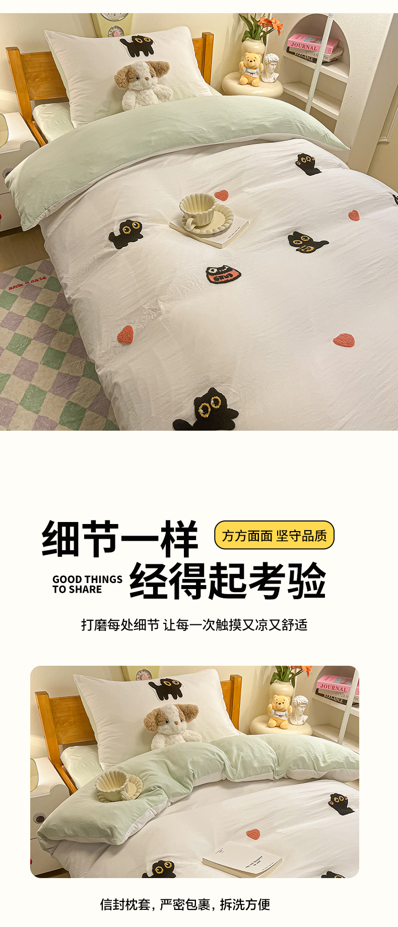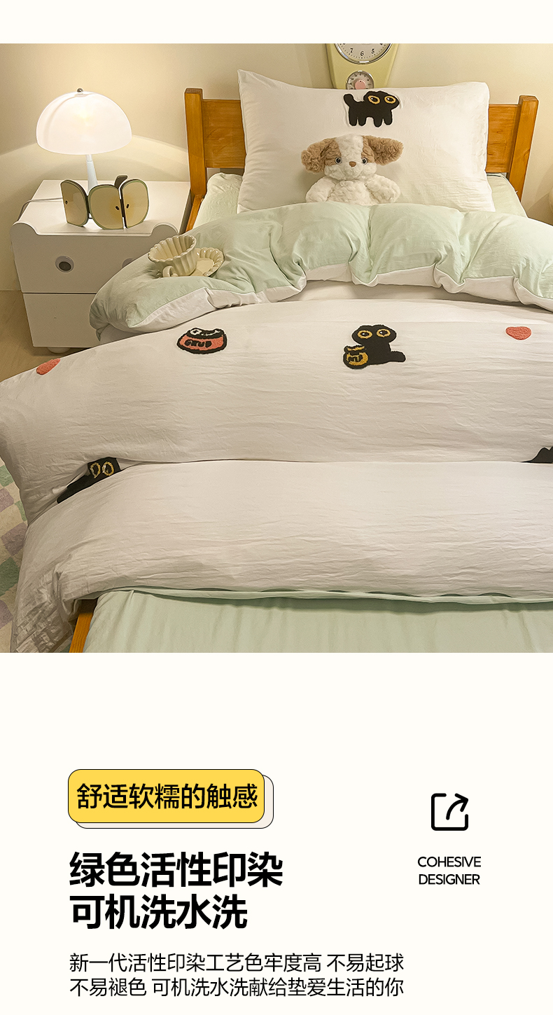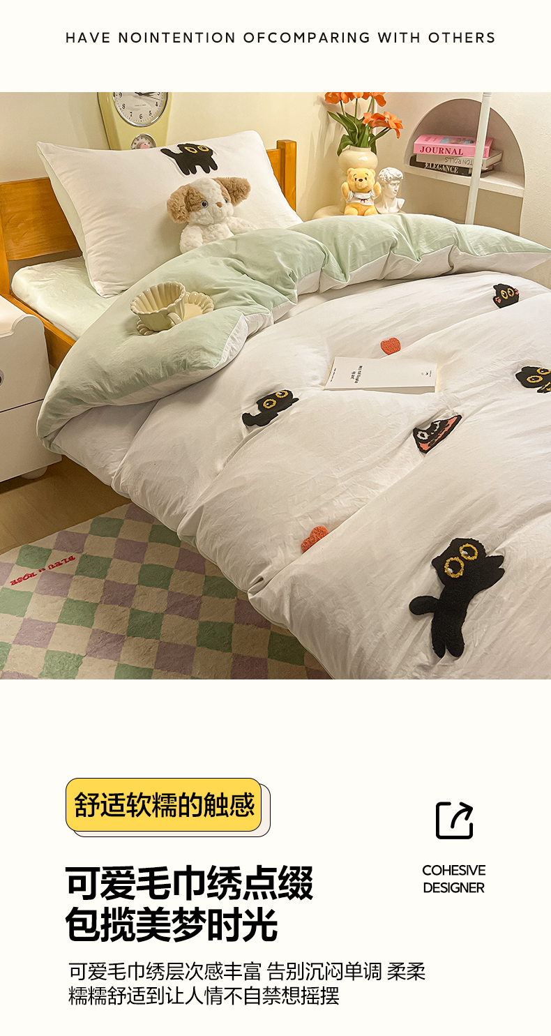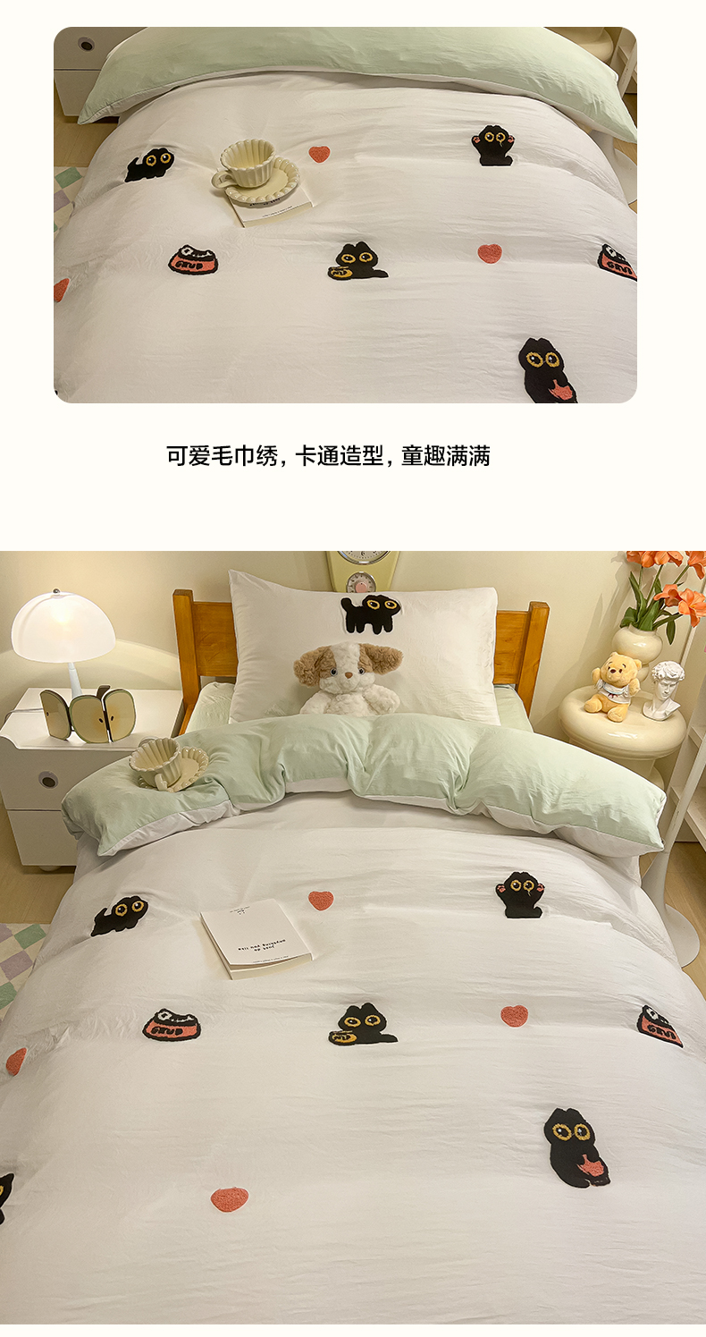 • 91家纺网 家纺一手货源 找家纺 韩巢家纺 2024新款学生宿舍寝室上下铺超柔水洗棉毛巾绣单件被套-幸运猫 幸运猫白绿