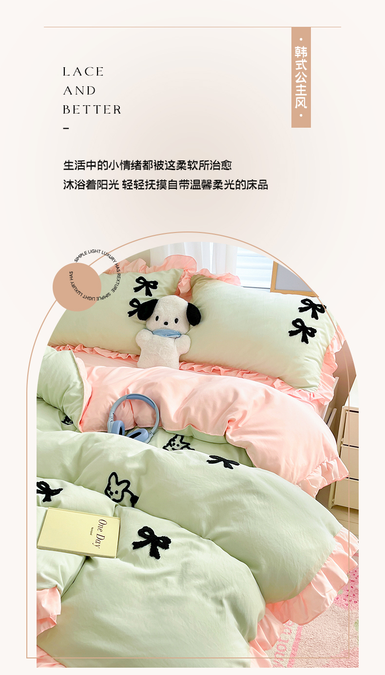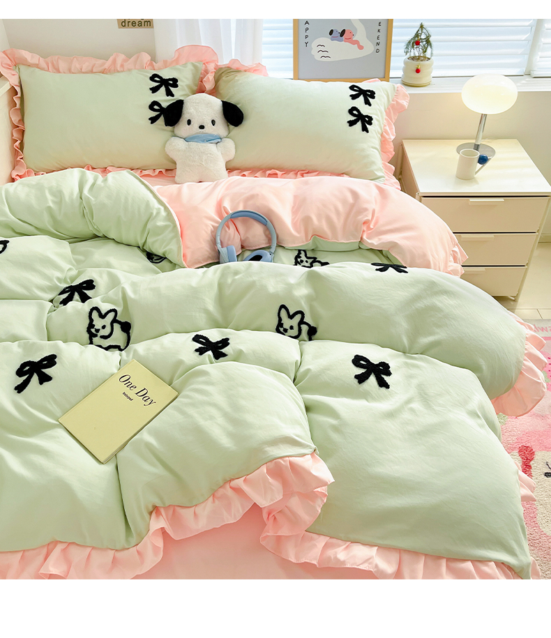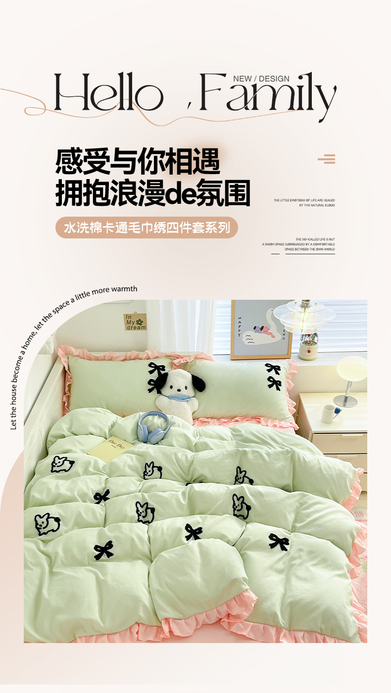 当前位置: 91家纺网 > 商品网购 > 床品套件 > 四件套 > 化纤活性四件套 > 泉欣家纺 2024韩式公主风毛巾绣花水洗棉四件套专版花型 蝴蝶结-抹茶绿粉