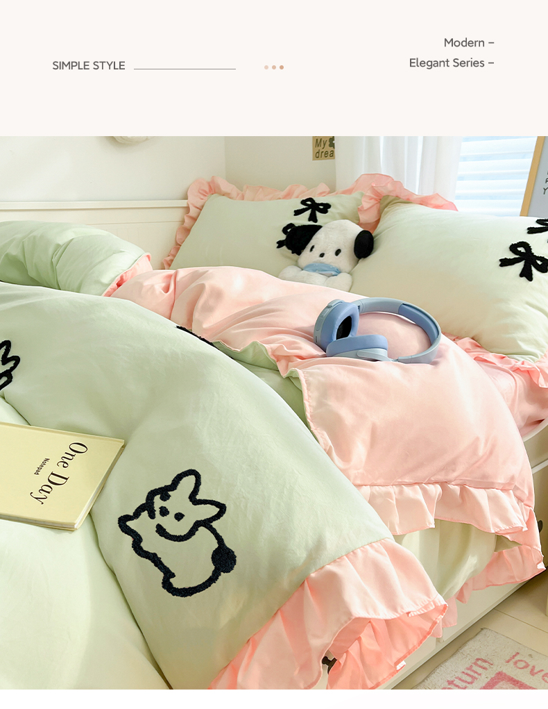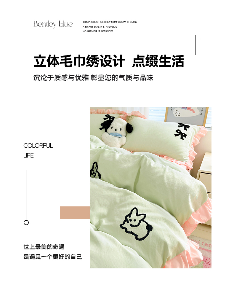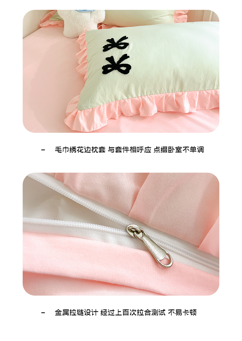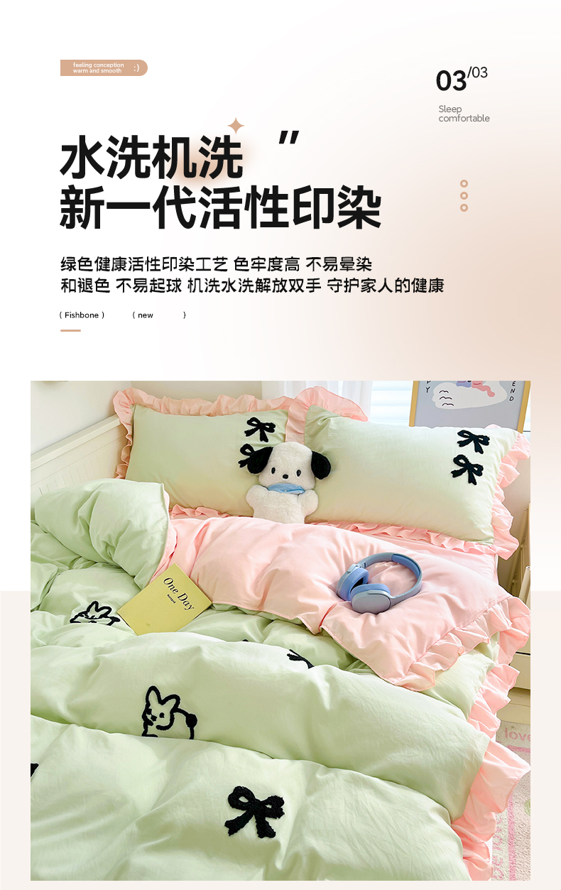 当前位置: 91家纺网 > 商品网购 > 床品套件 > 四件套 > 化纤活性四件套 > 泉欣家纺 2024韩式公主风毛巾绣花水洗棉四件套专版花型 蝴蝶结-抹茶绿粉